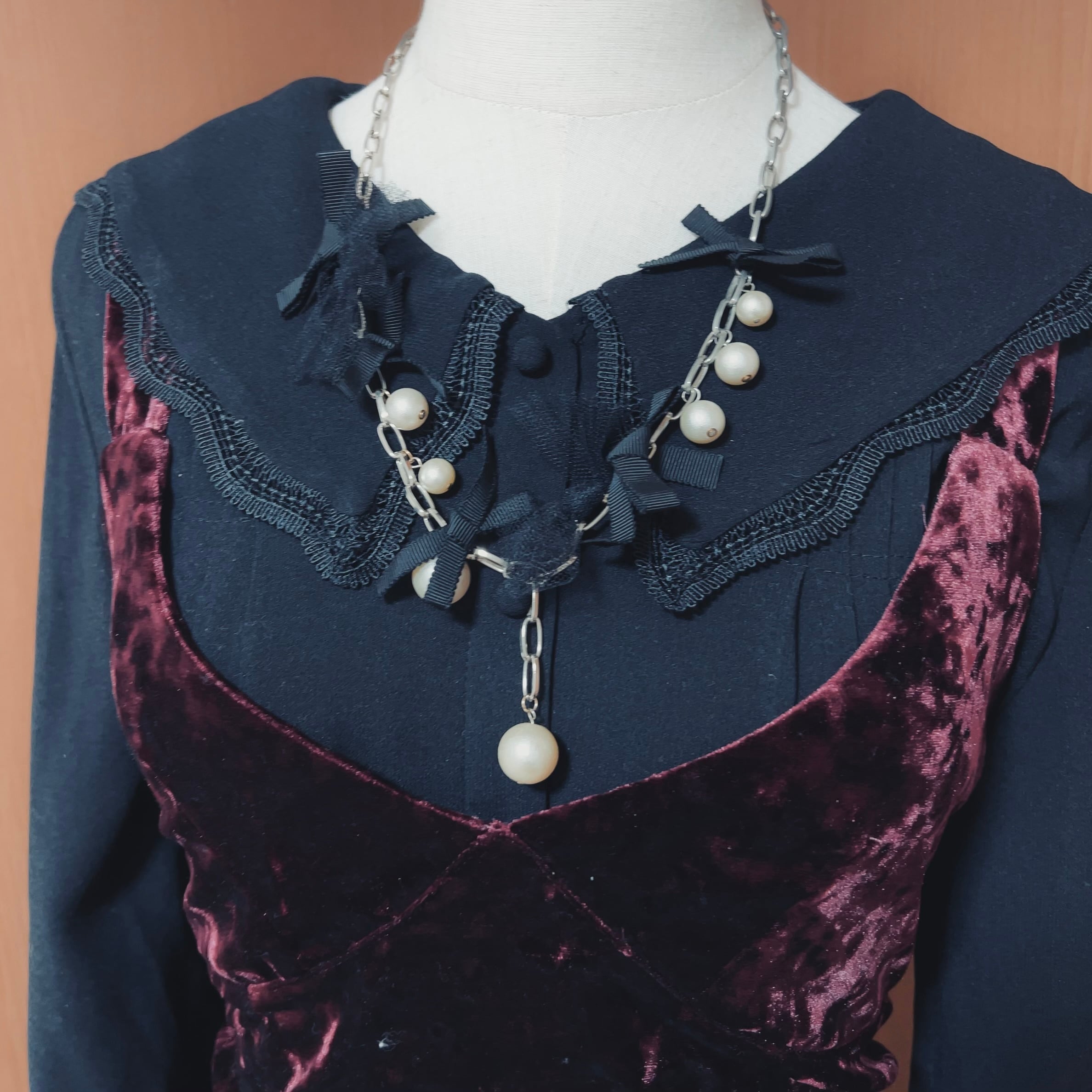パールと黒リボンのネックレスを組み合わせた3点セットです。