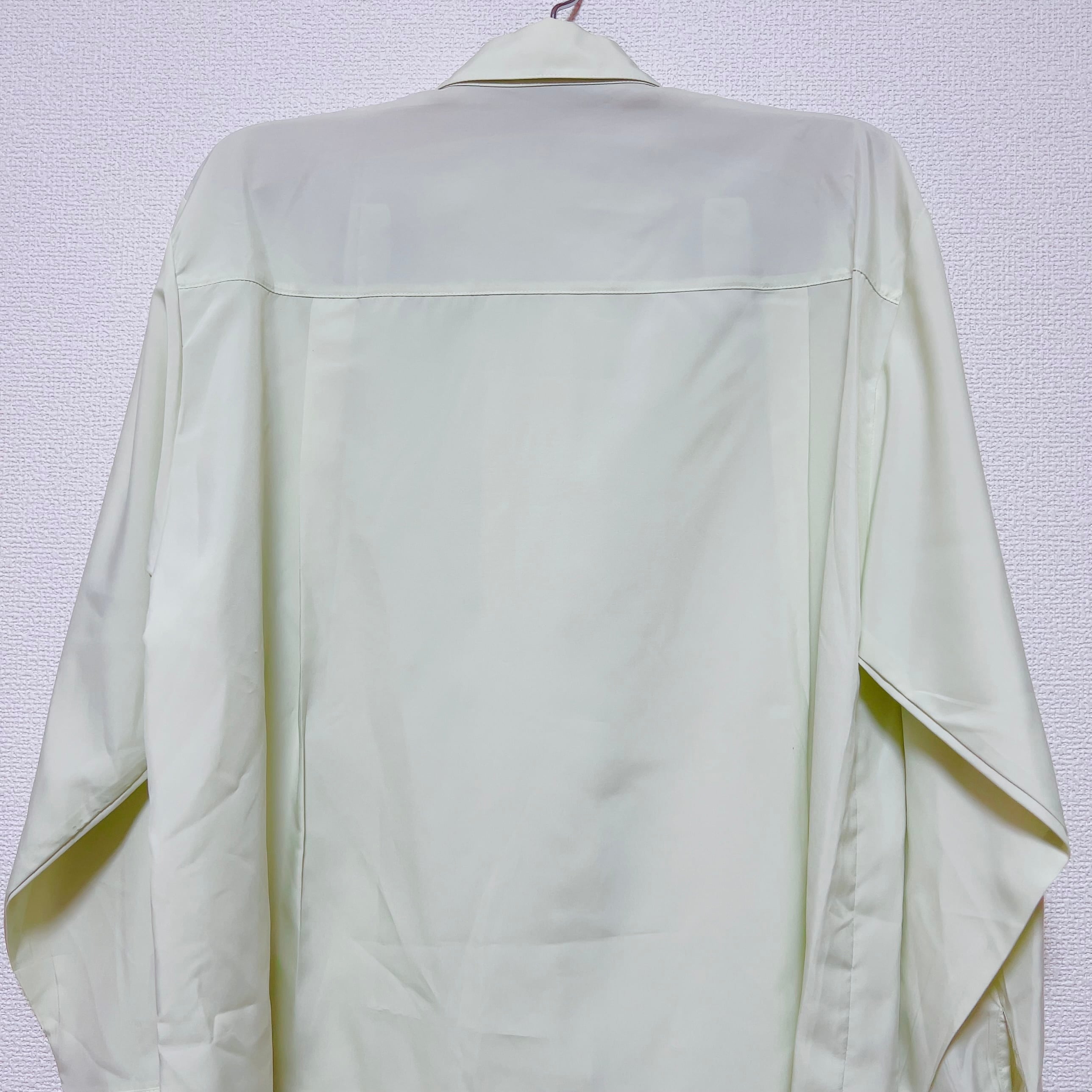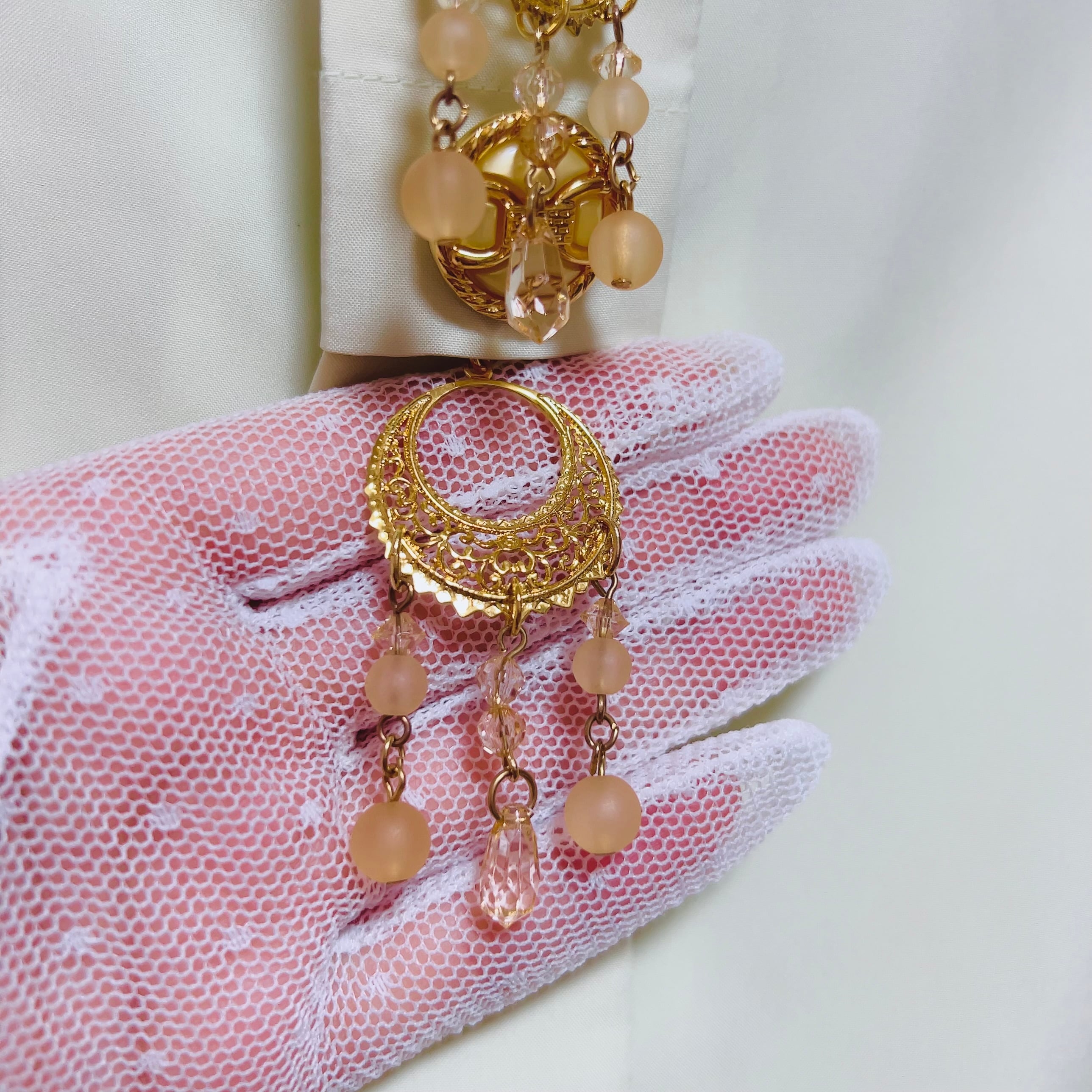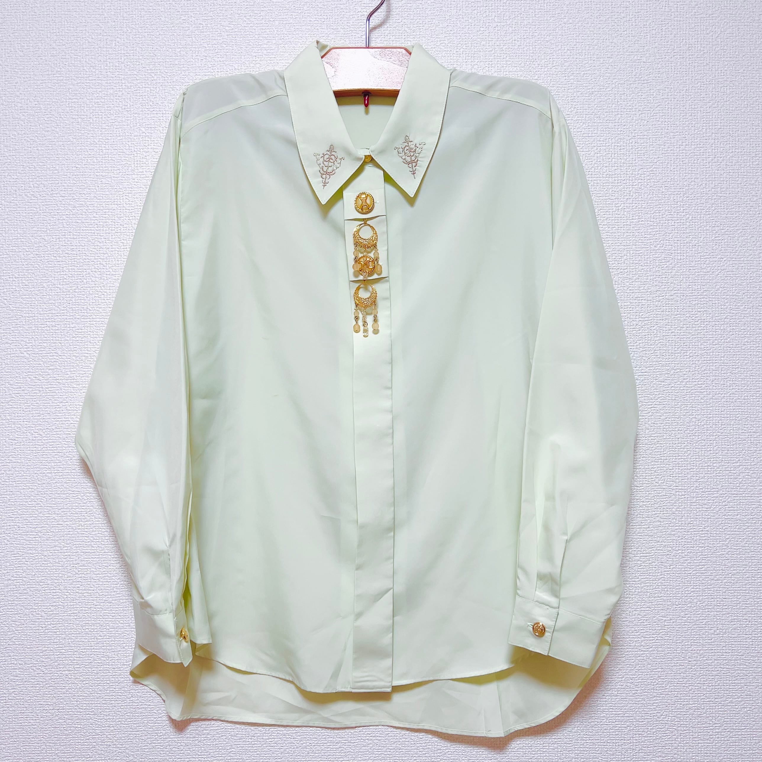 淡いパステルグリーンの生地に、揺れるヴィンテージボタンとビーズモチーフ。