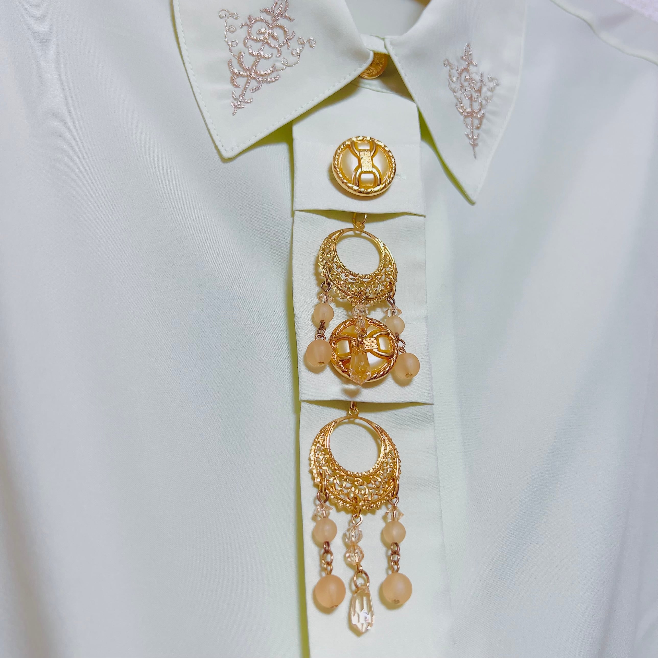 二列に並んだボタンホール飾りは、装飾というより神具のよう。