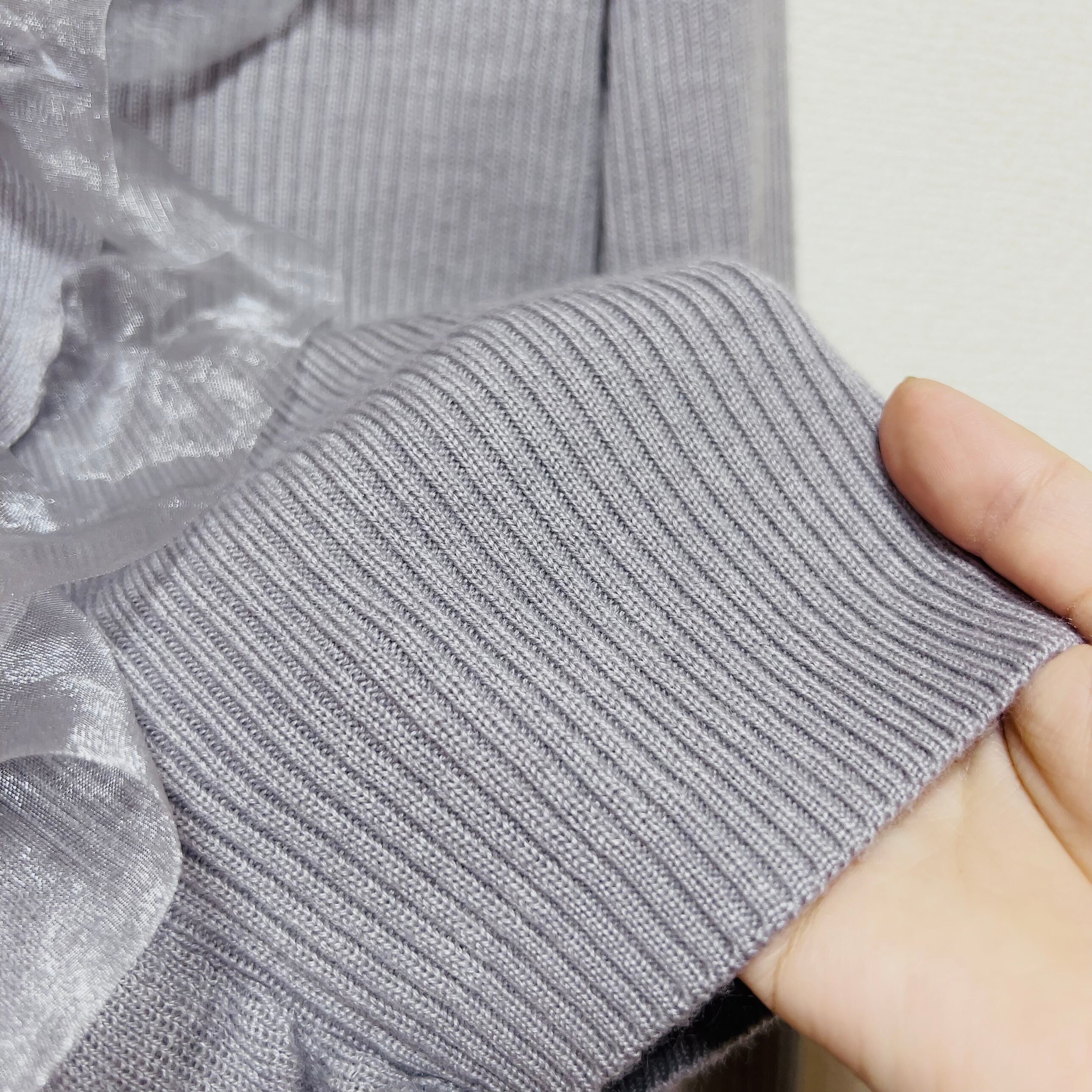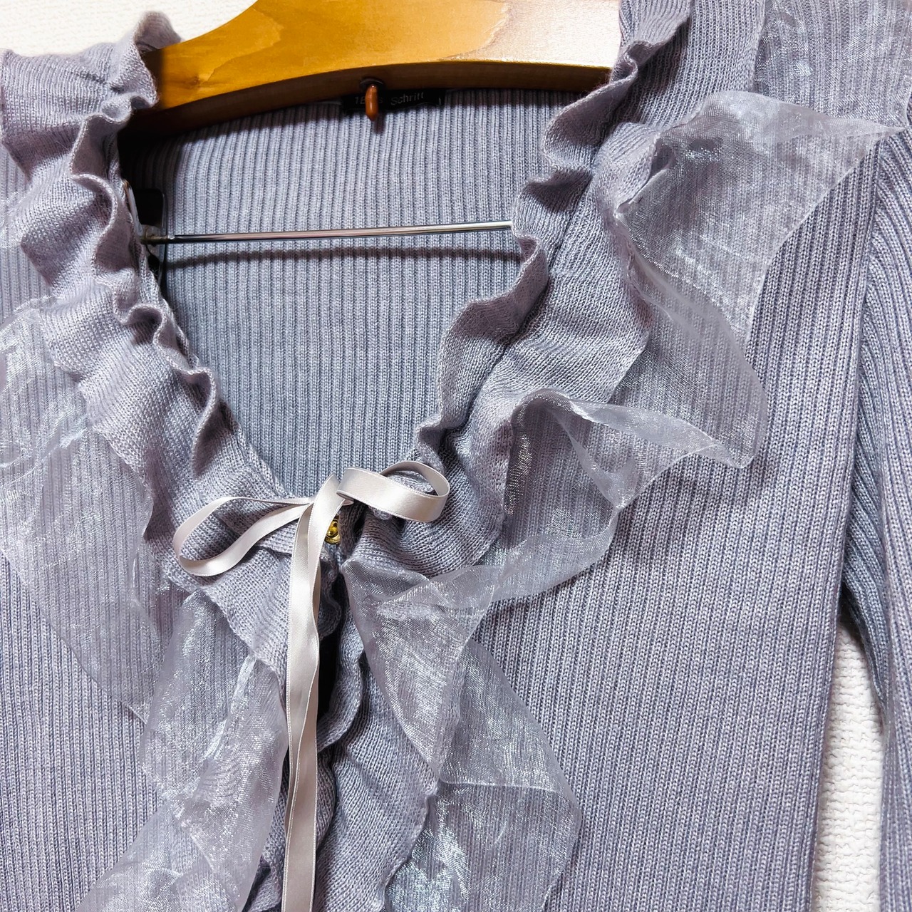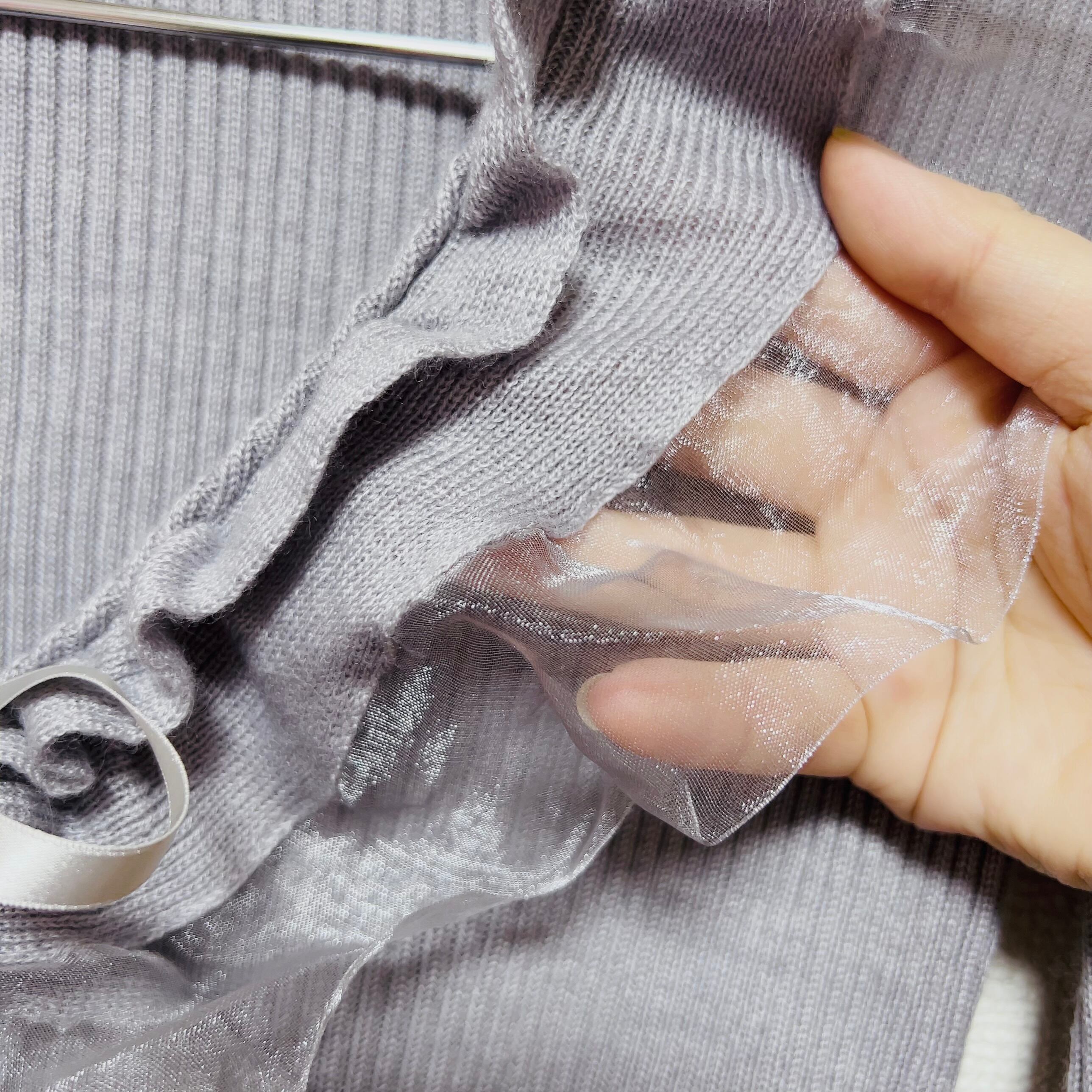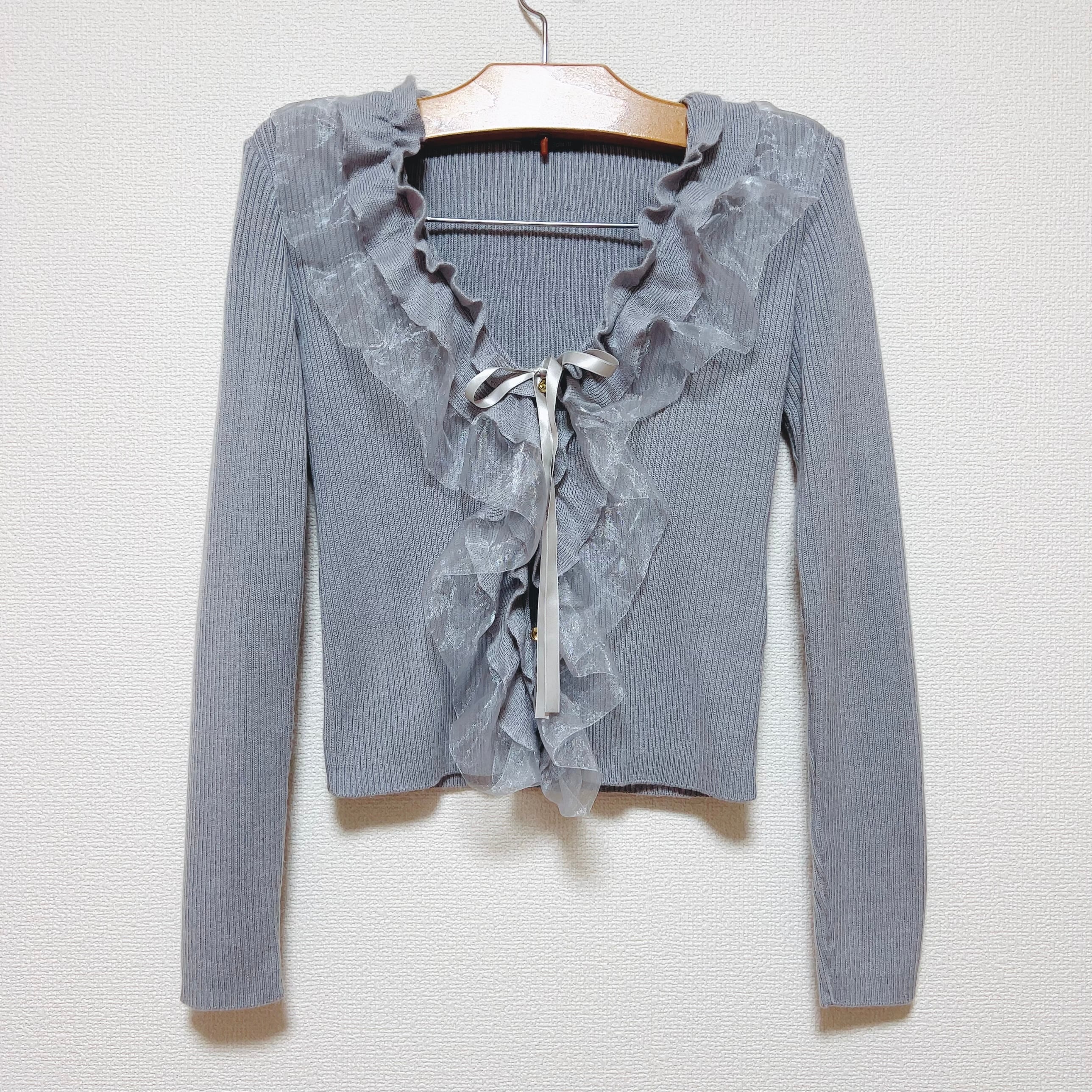 オーガンジーのきらめくフリルと胸元のリボンがガーリーな印象を添えつつ、グレーの色味が甘さを程よく引き算。