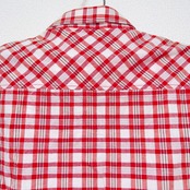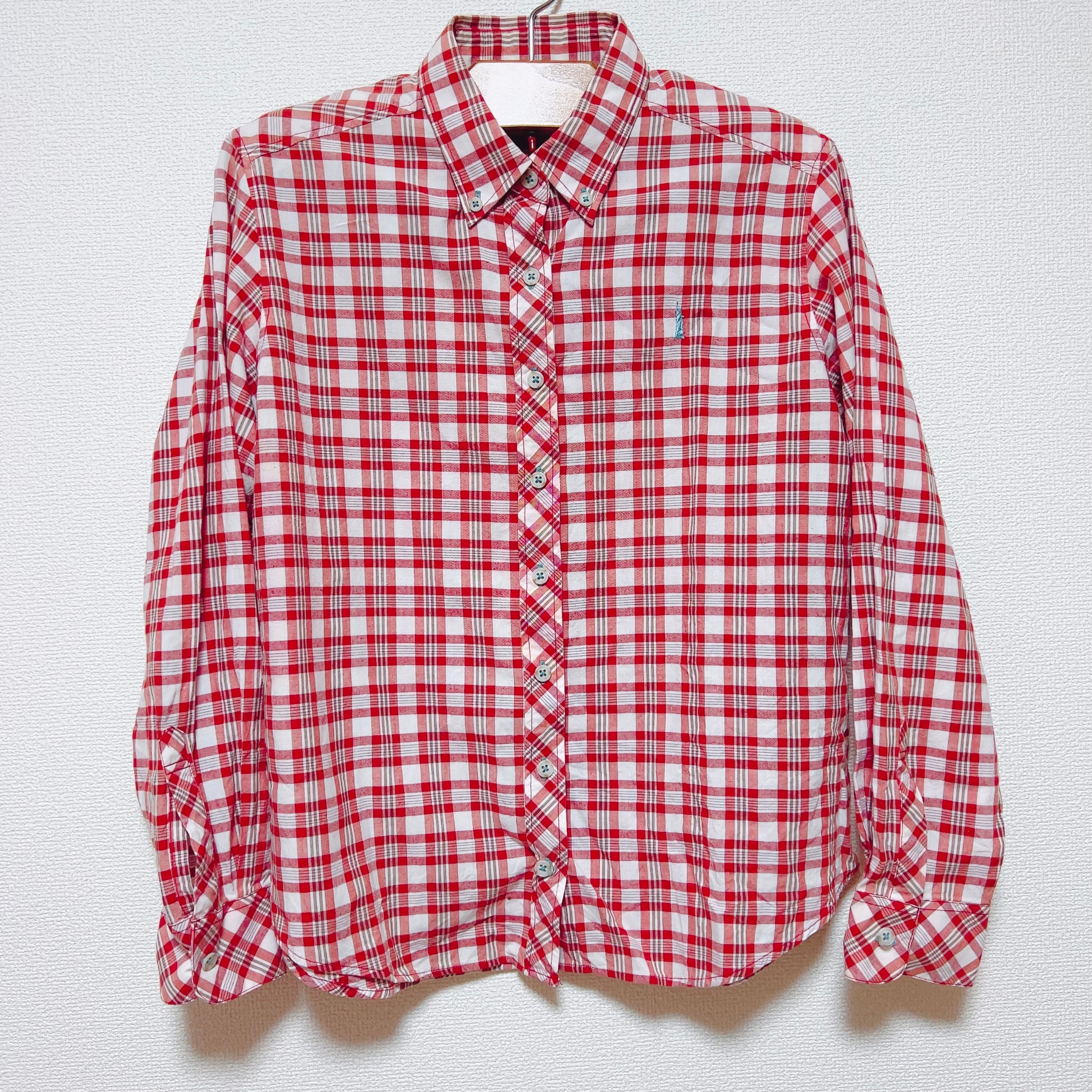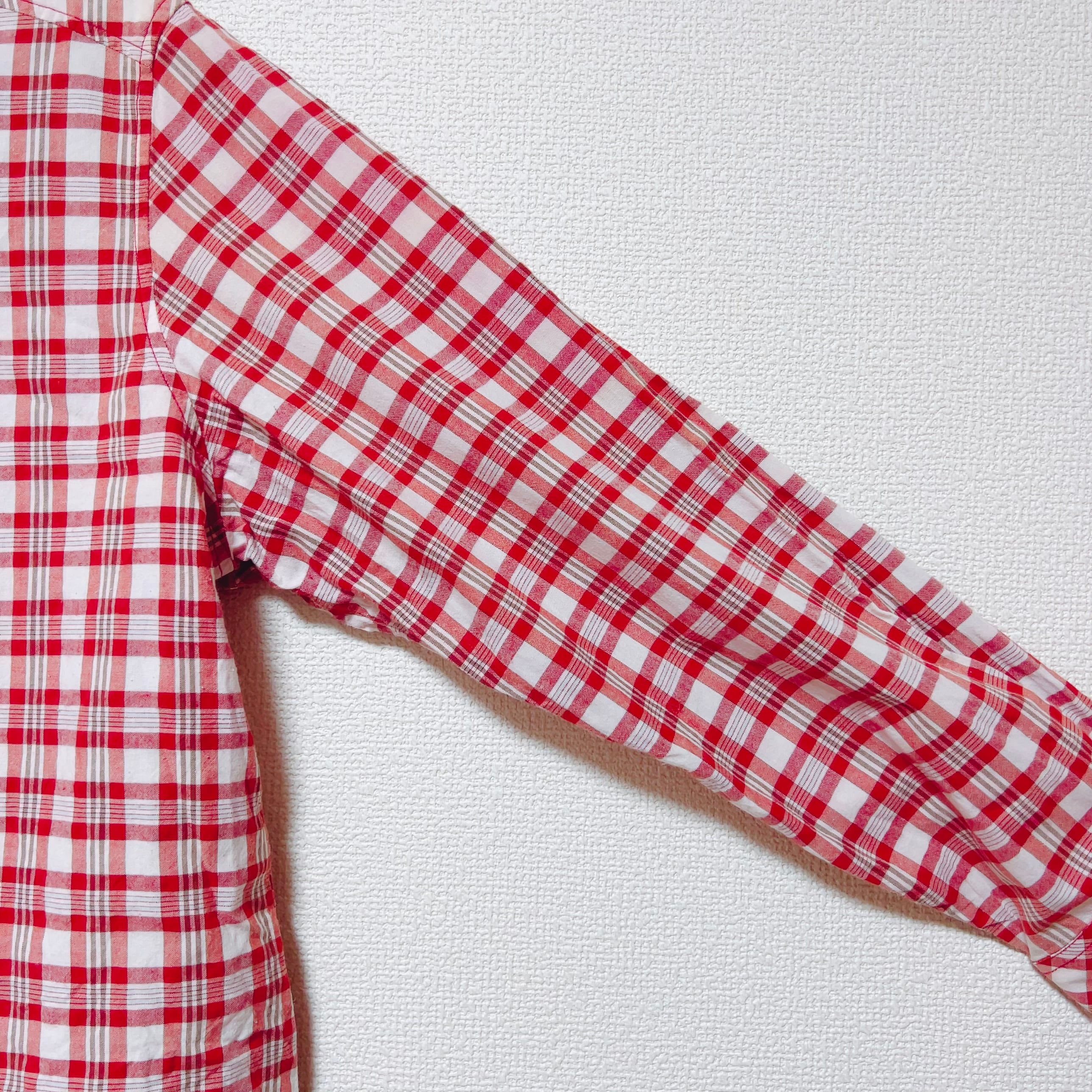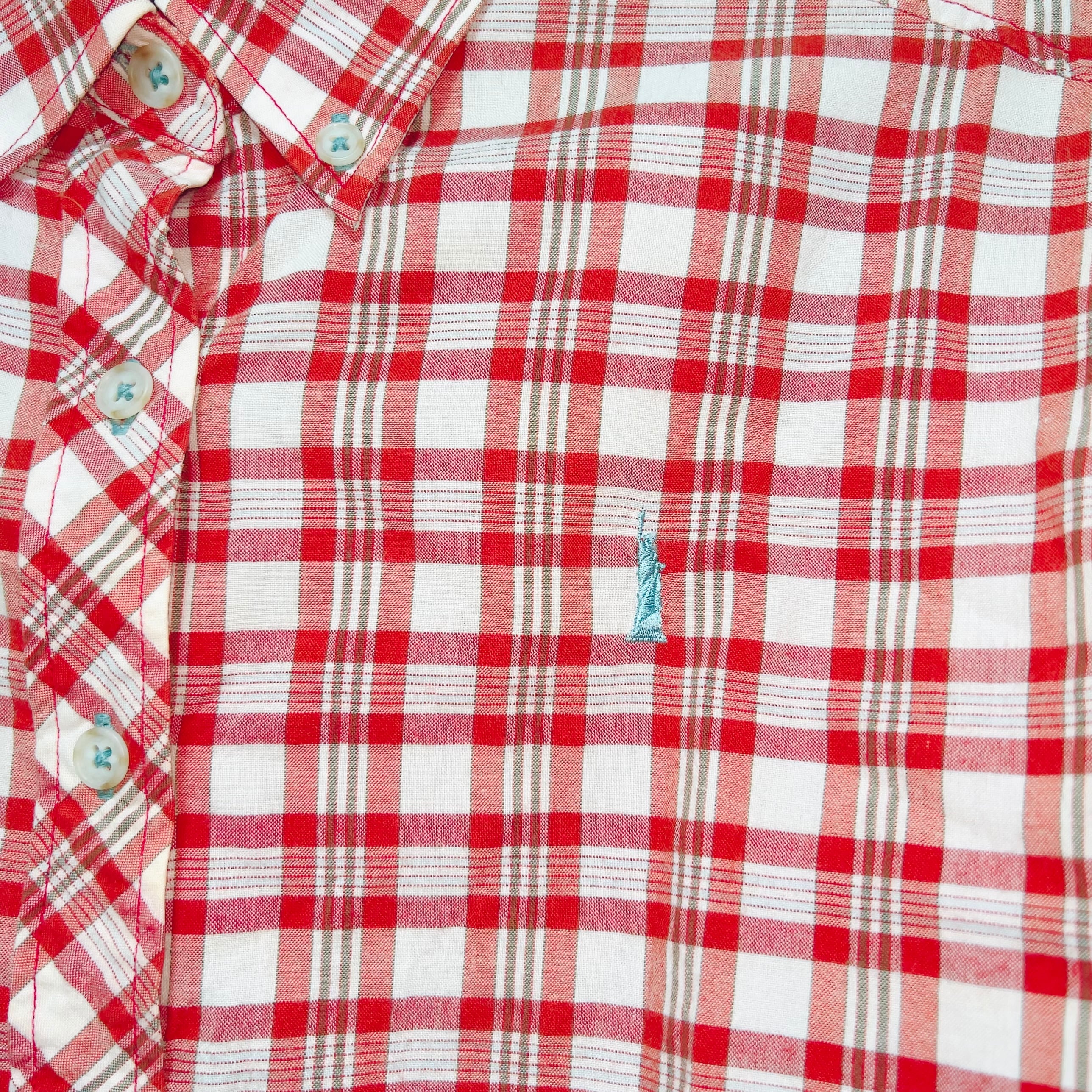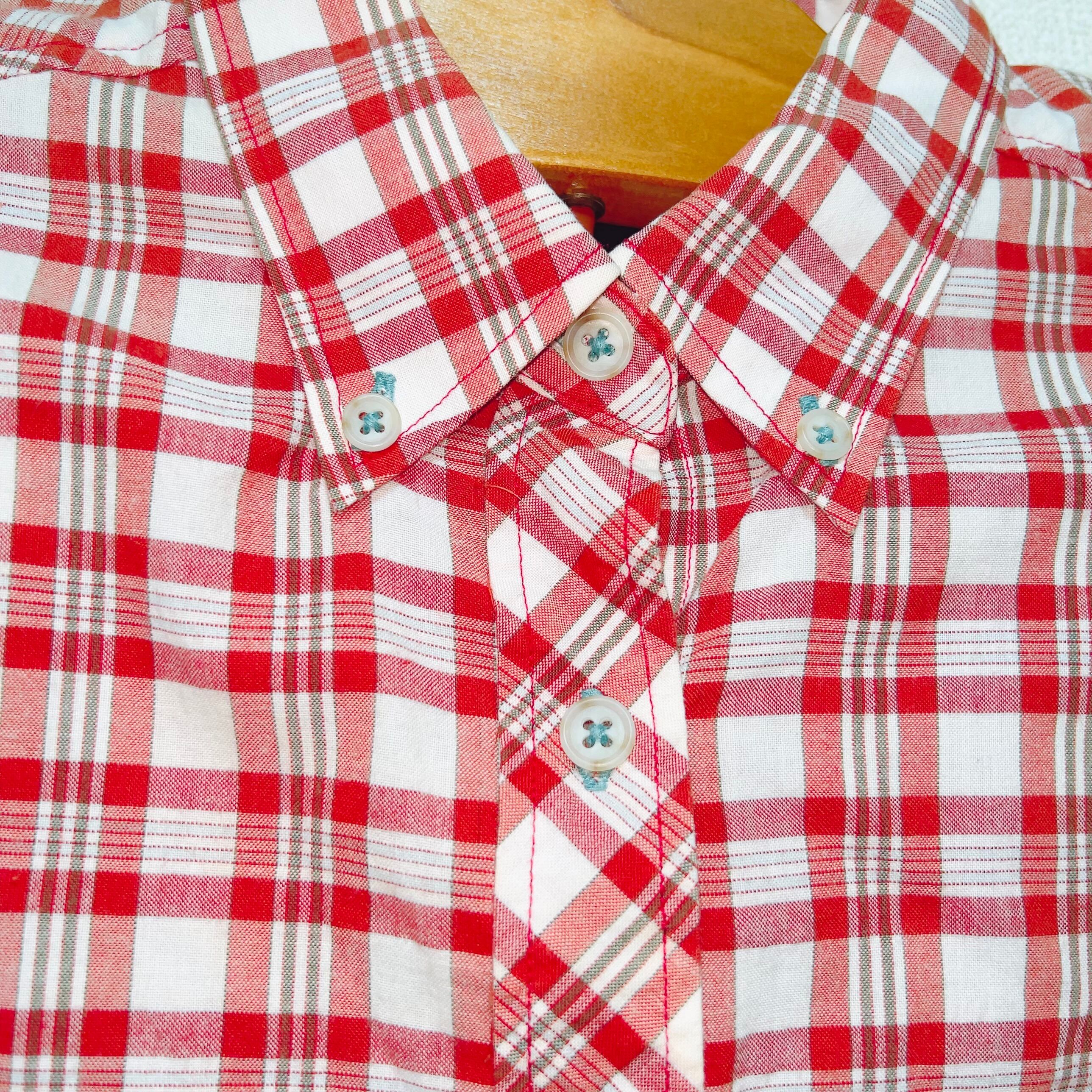 レトロな赤いギンガムチェックに、水色のボタンホールとワンポイント刺繍が映えるイーストボーイのシャツ。