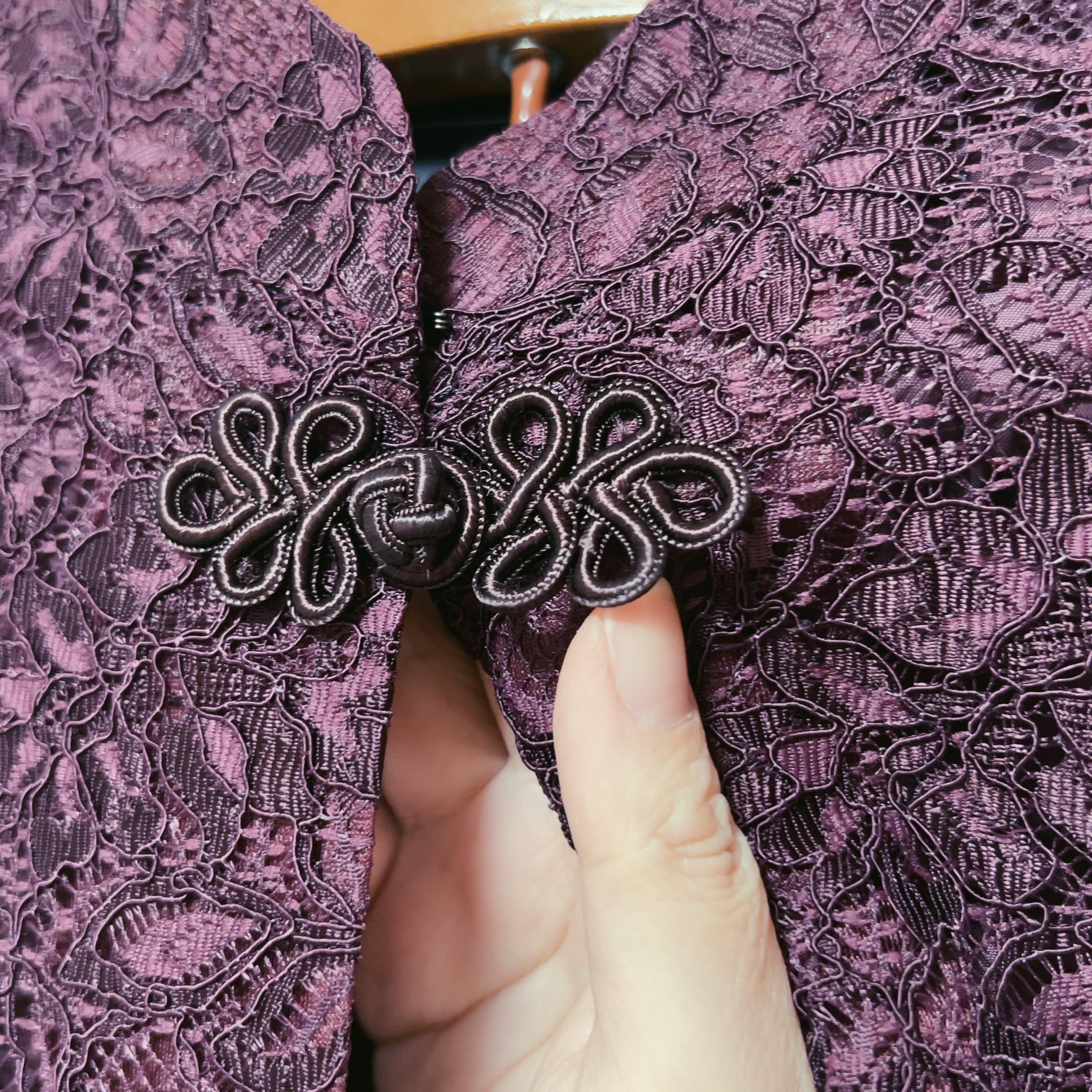 ワインカラーの繊細なレースと、チャイナボタンのアクセントがついたショート丈ジャケット。