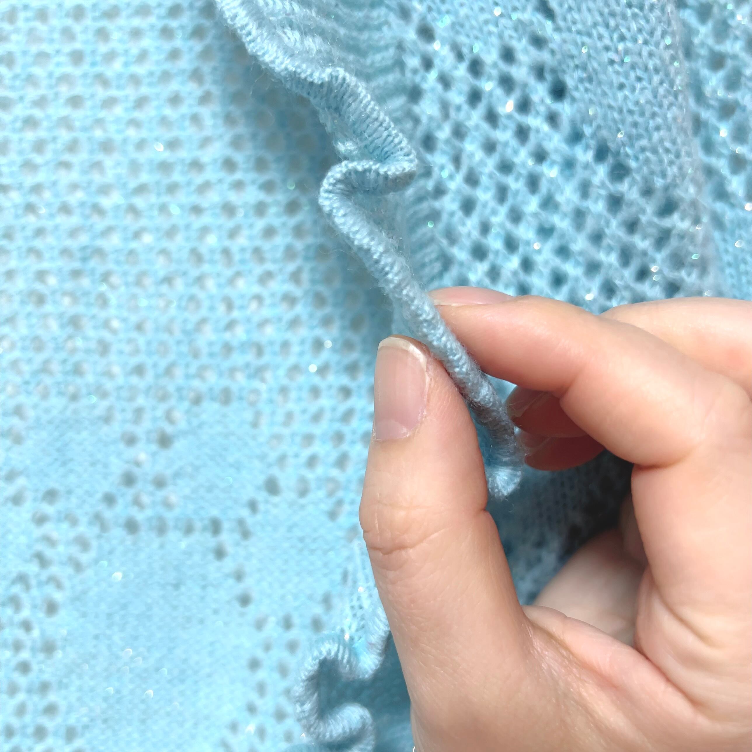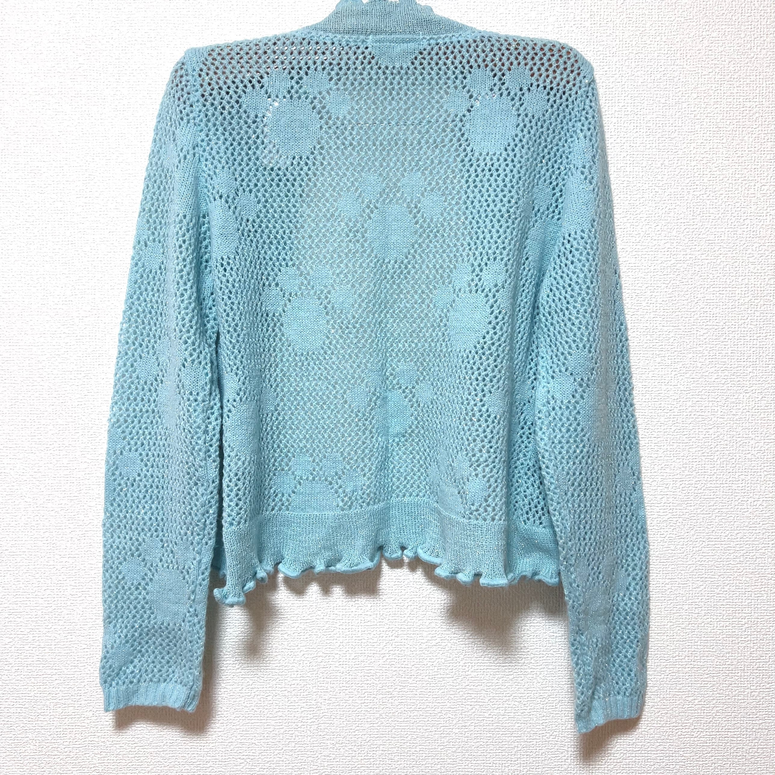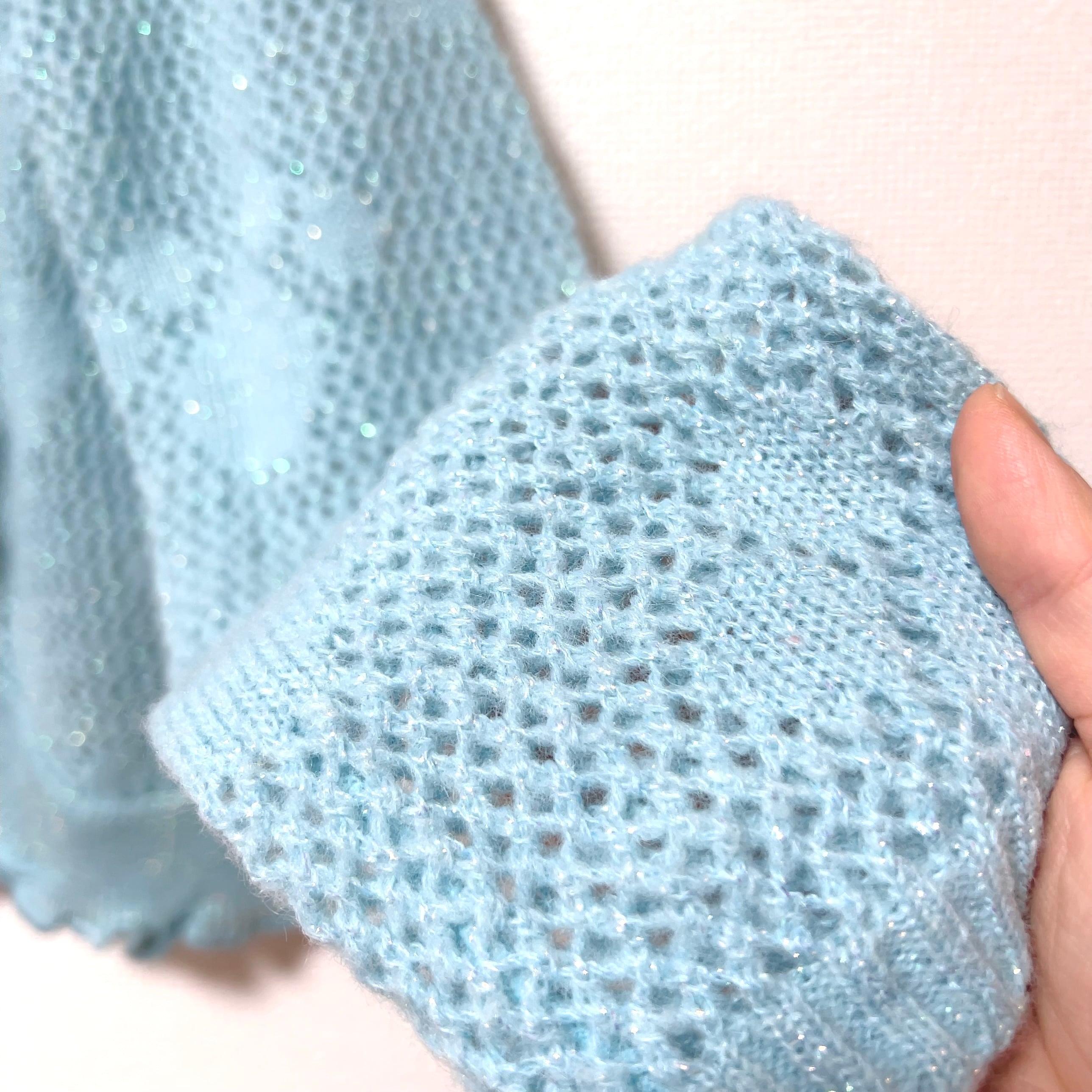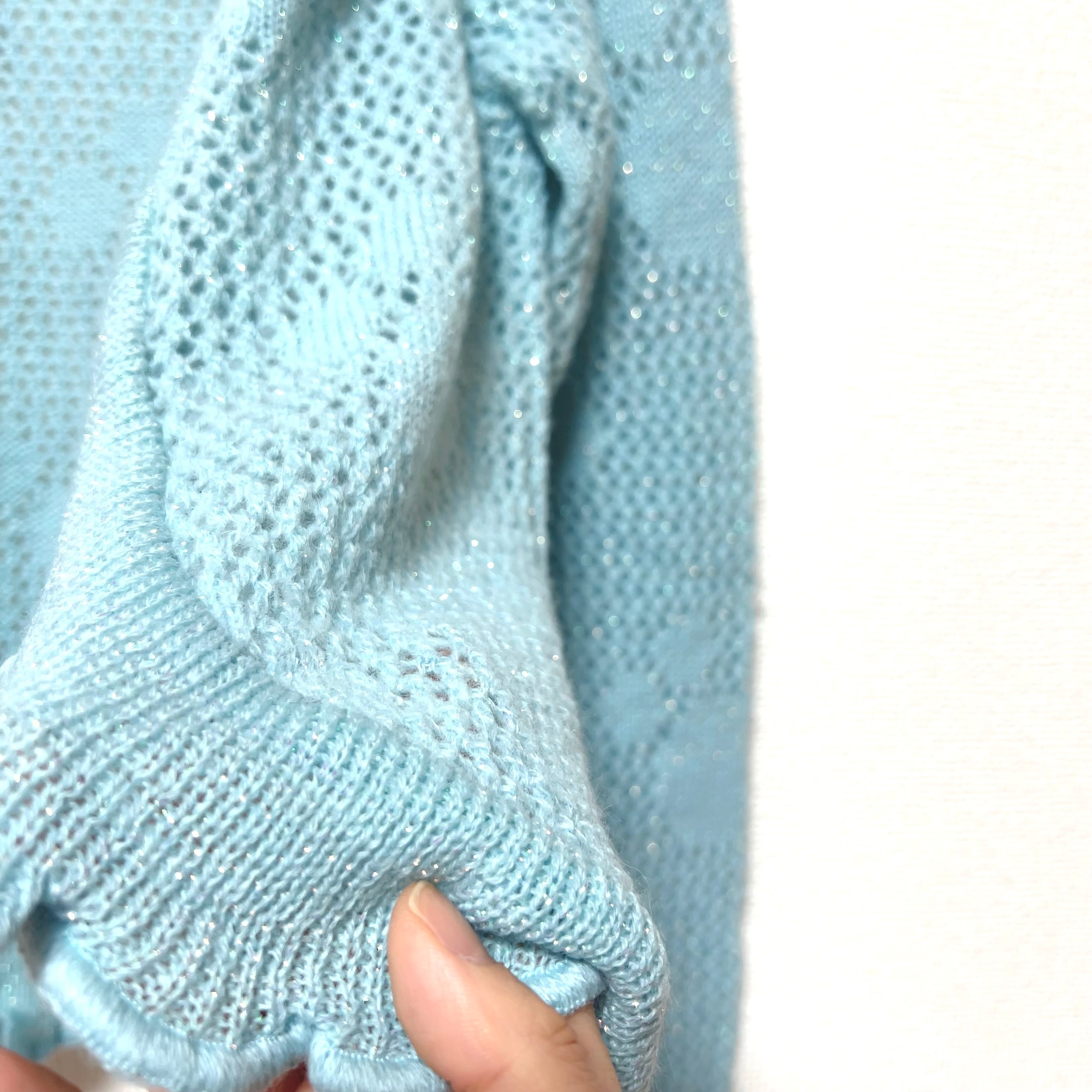 オーロラカラーでちらちらと小さく輝くラメニットは、冷房対策にもぴったりの羽織もの。