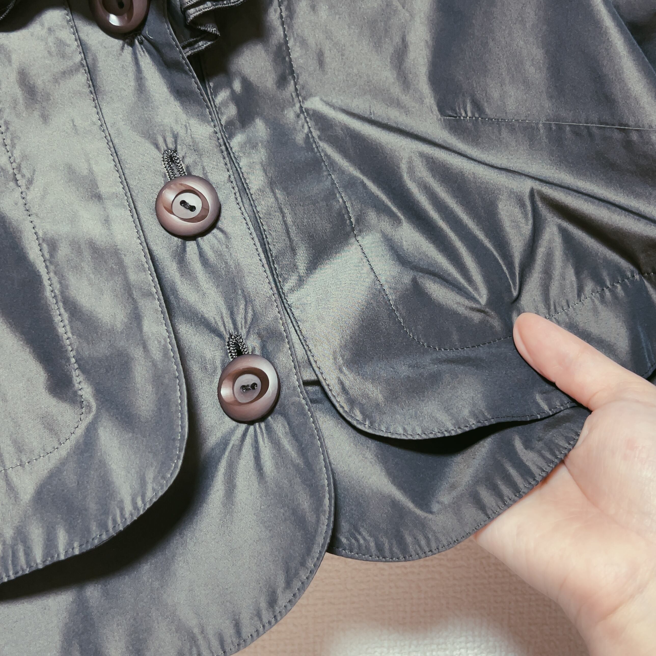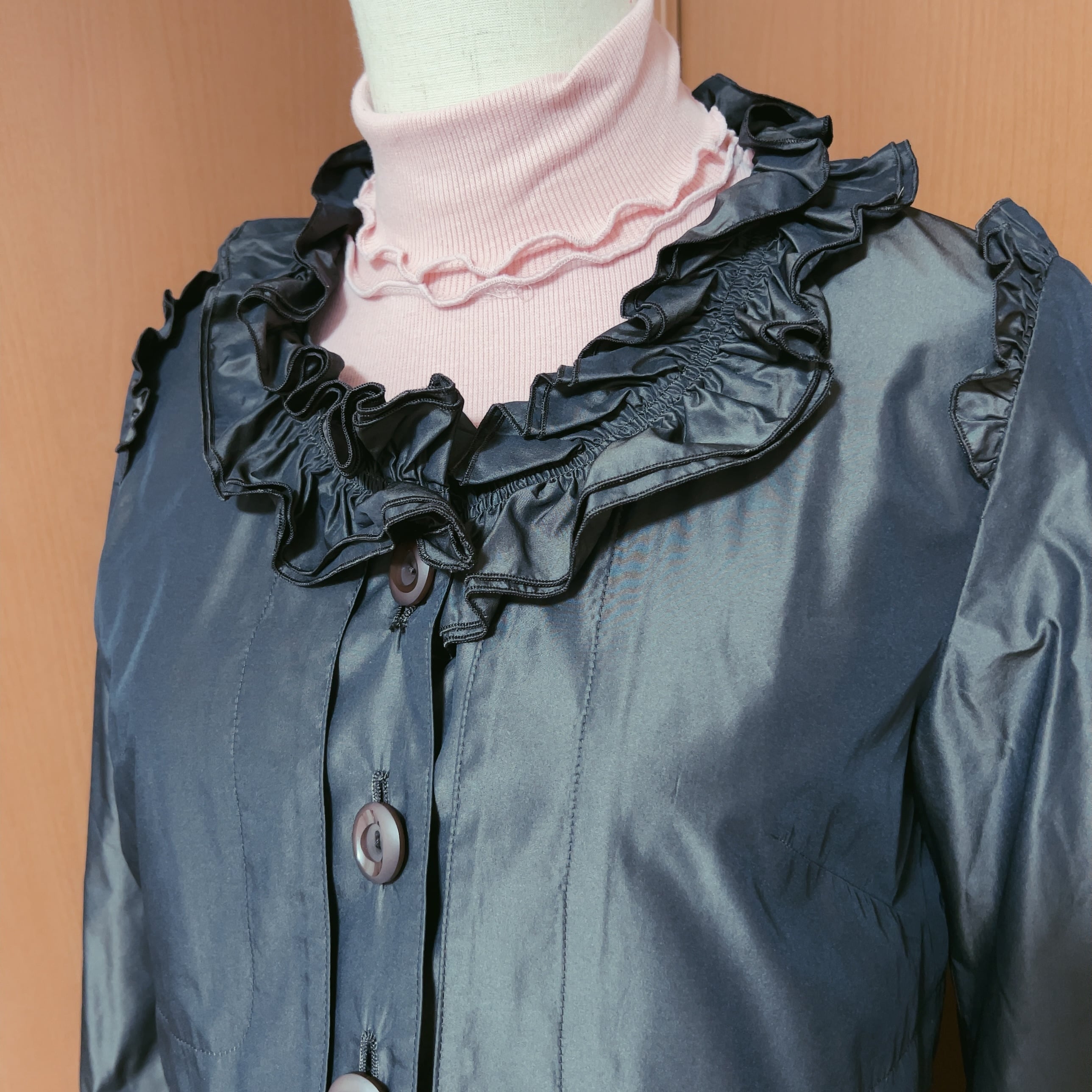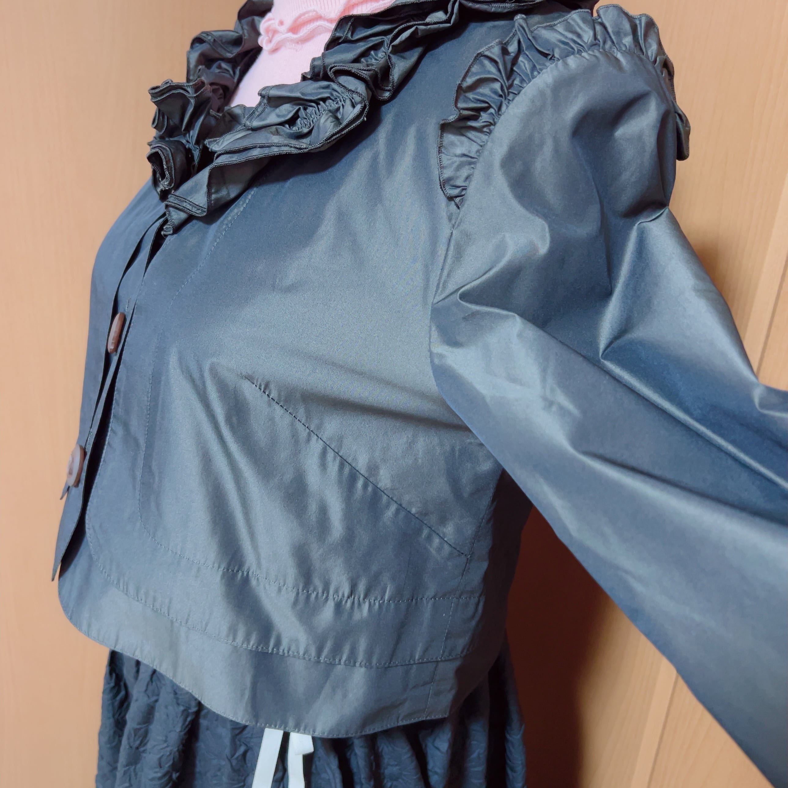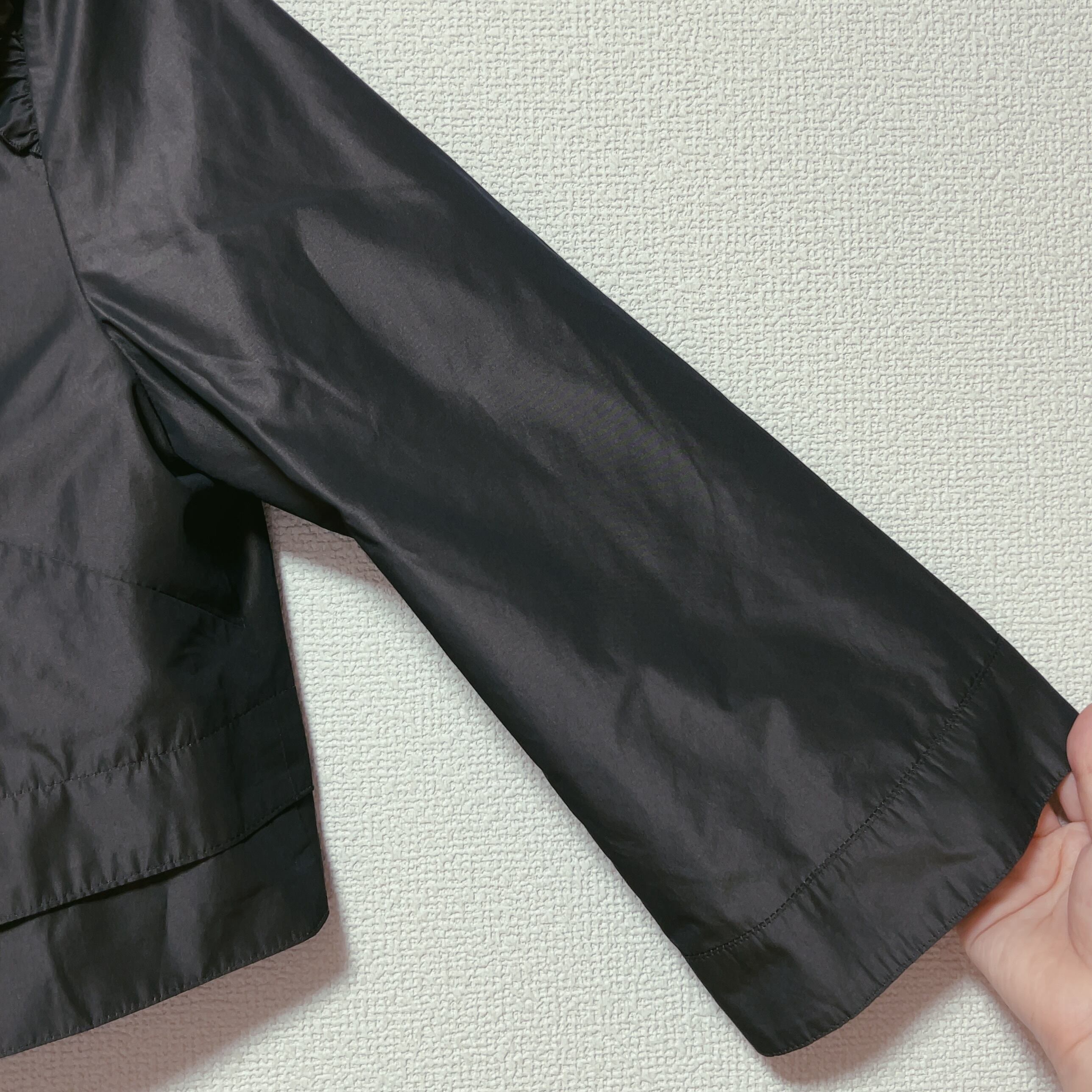 しっかりと光沢のある生地でフリルがインナーを引き立てる軽量の七分袖アウター。