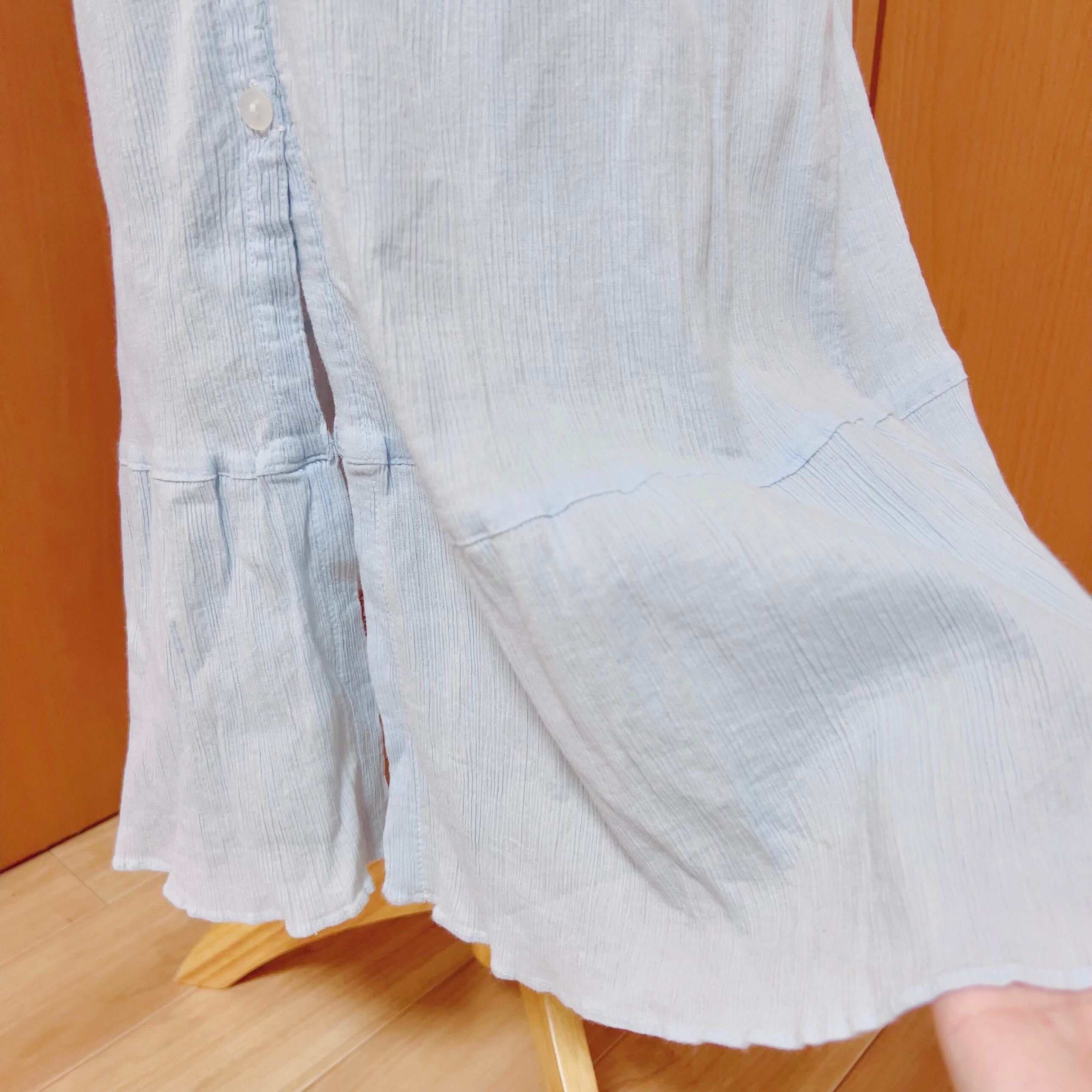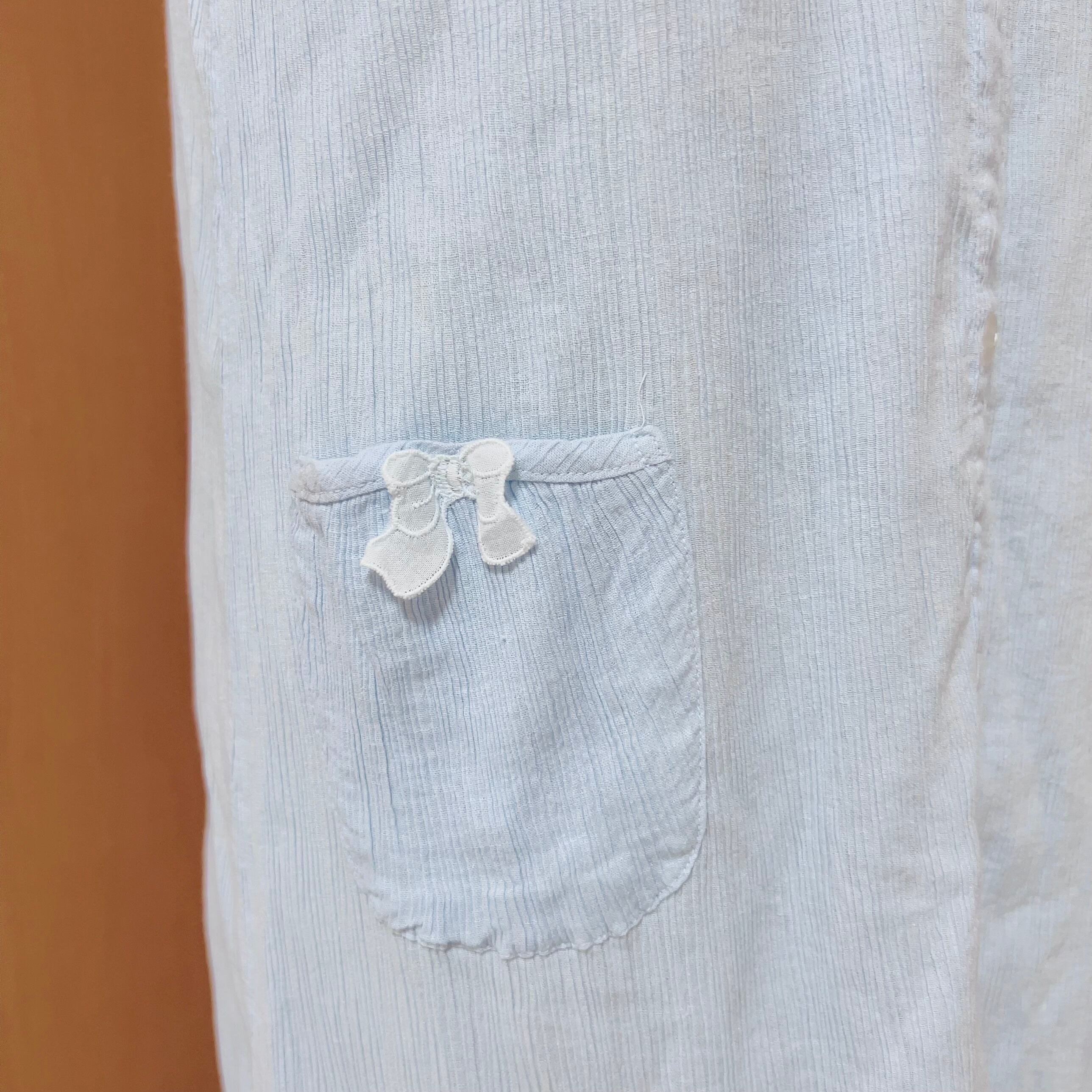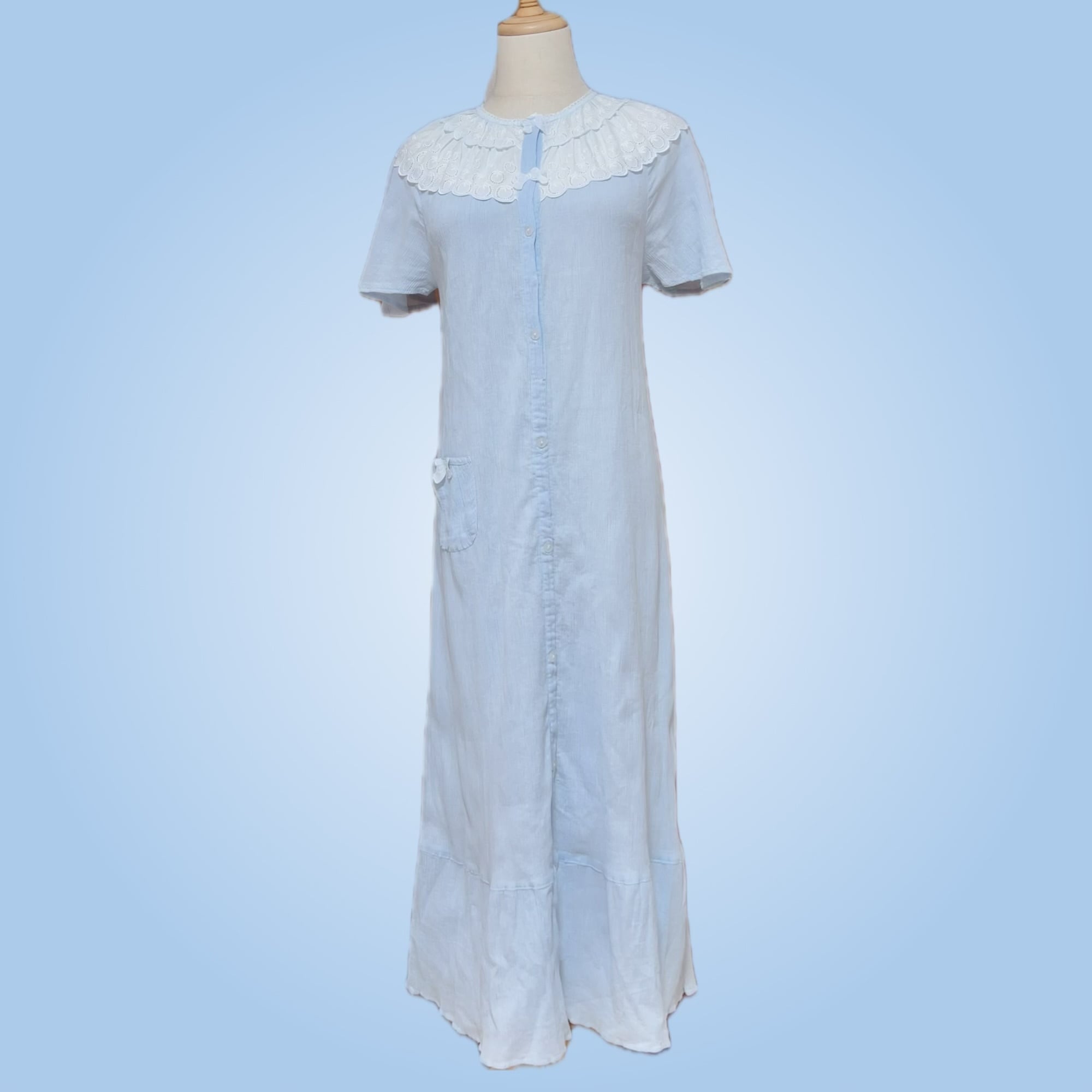 ベビーブルーのワンピースはクレープ生地というさらりとした夏向きの生地で、吸湿のよい素材です。胸元のフリル、リボンのレースモチーフがネグリジェ風でロマンティック。