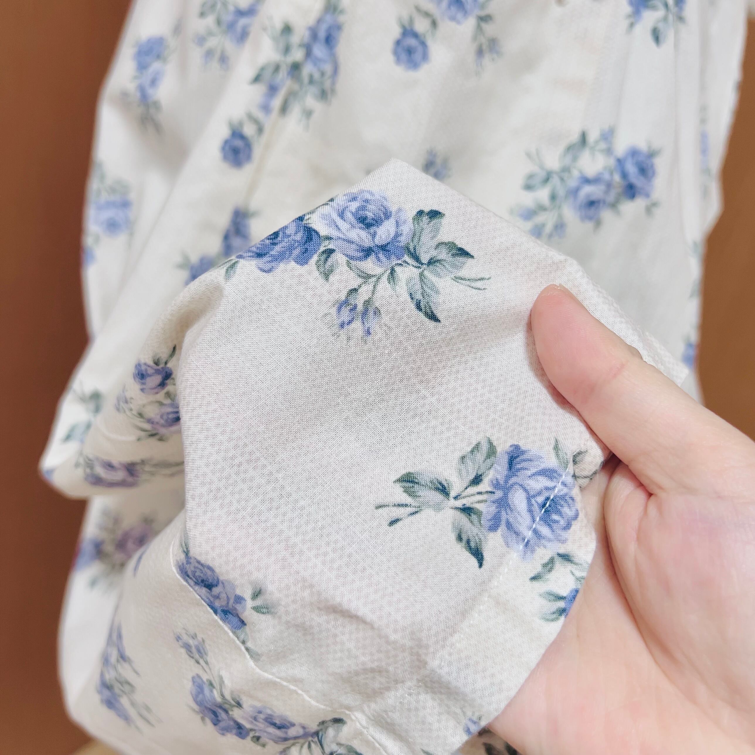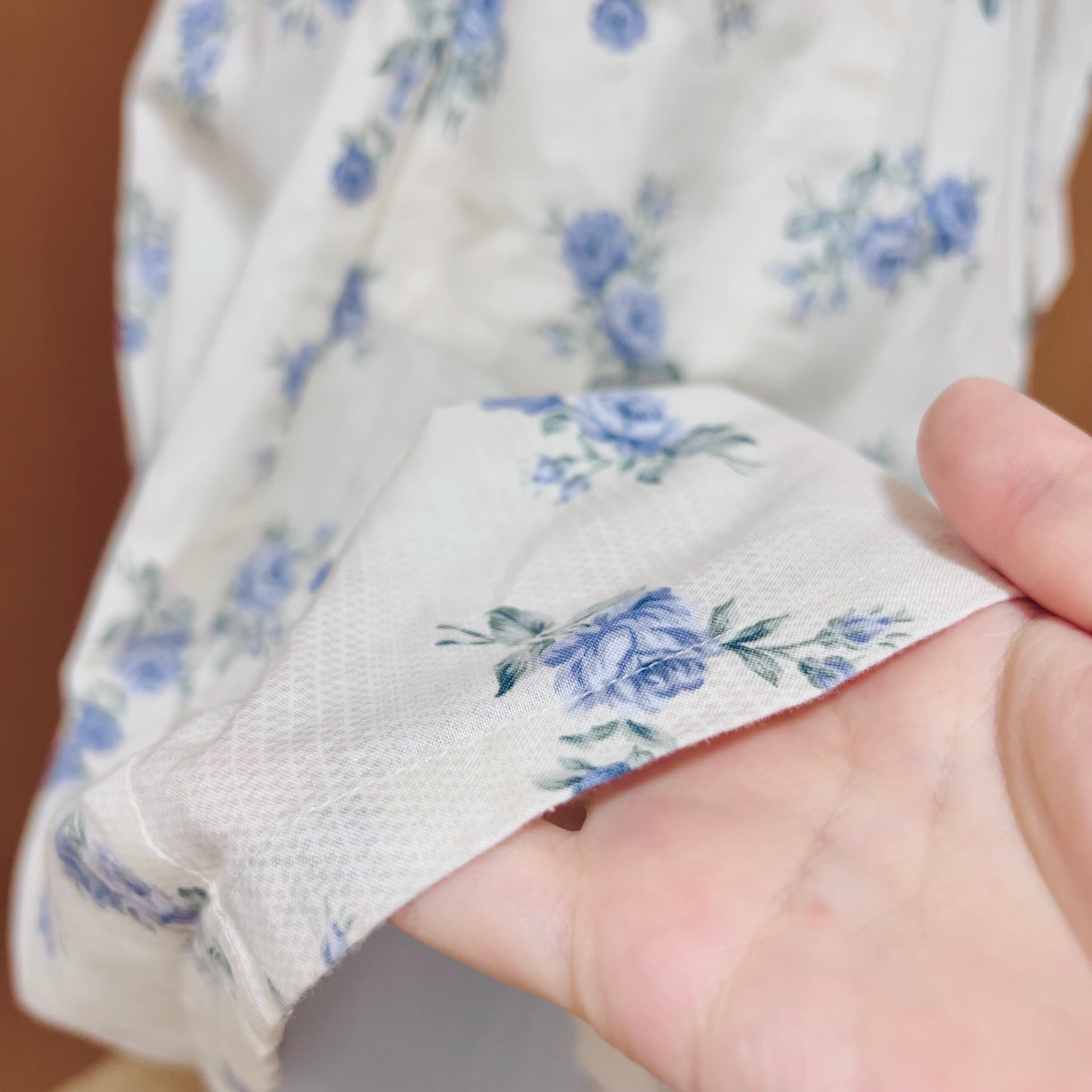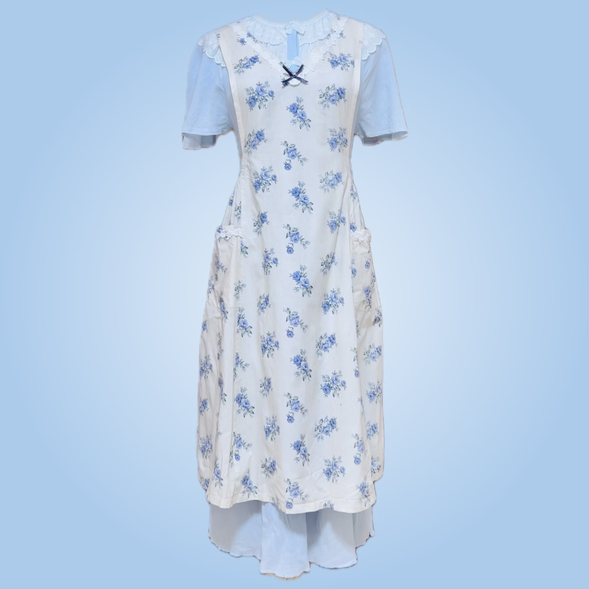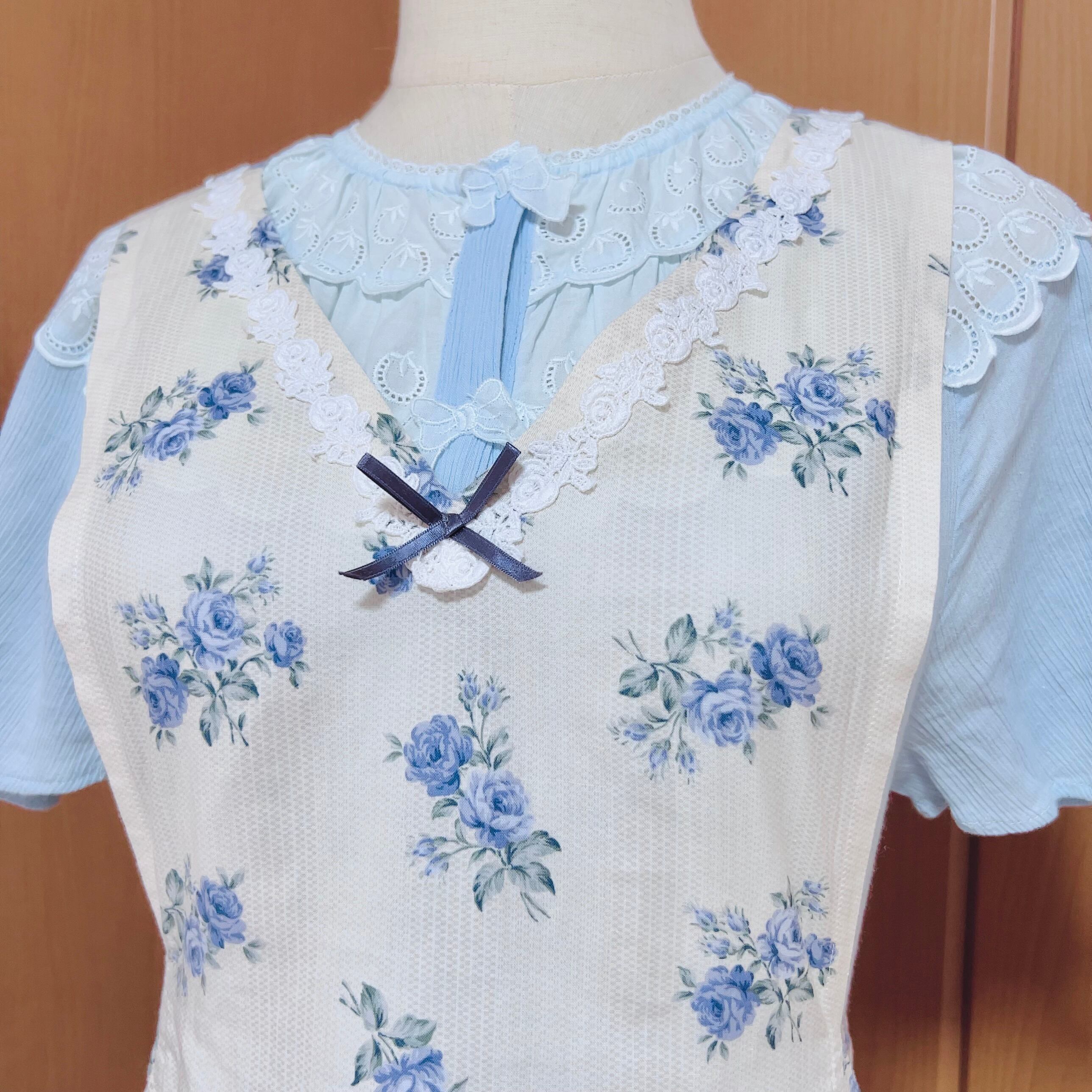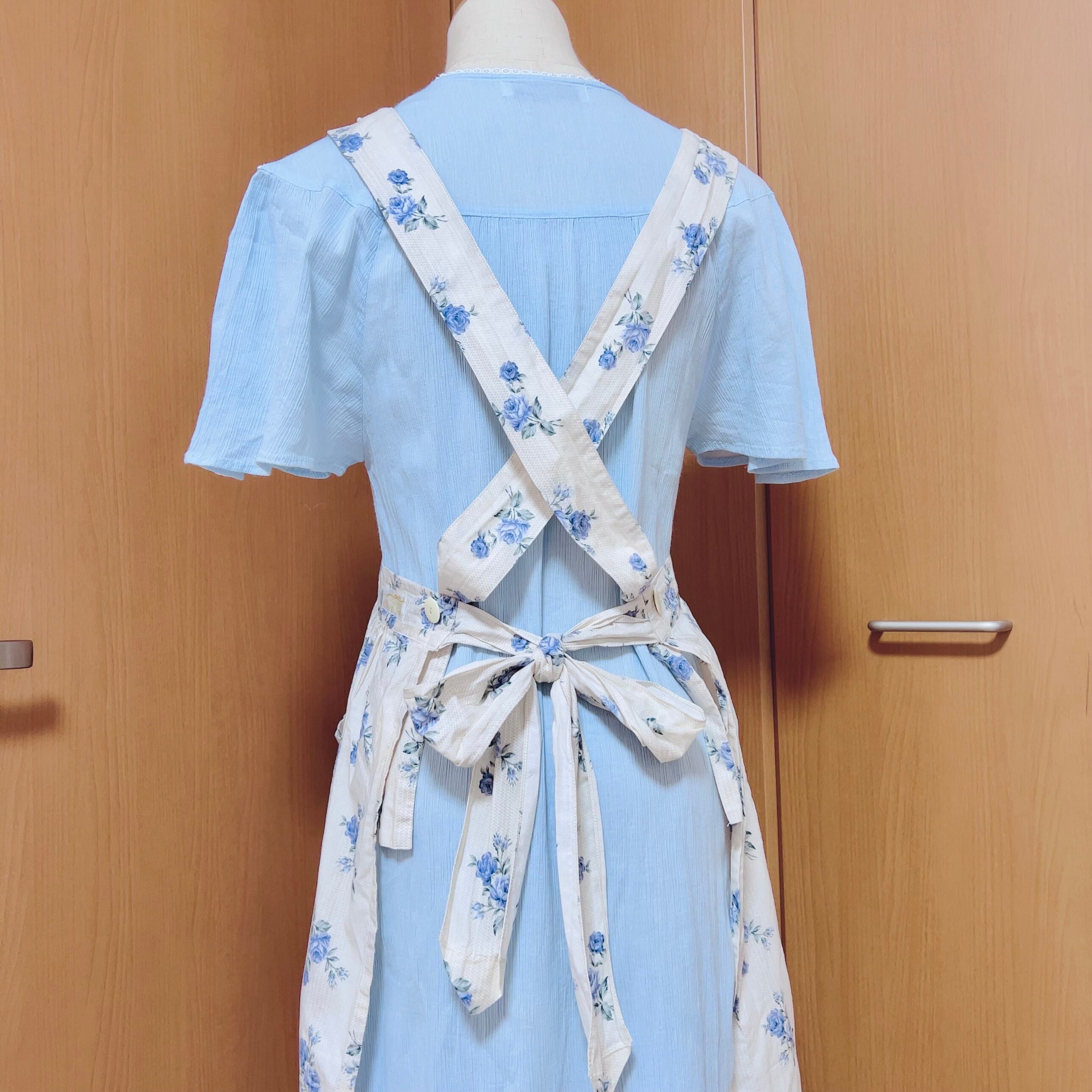 重ねるエプロンはクリームカラーにブルーの花柄。サイドにボリュームがあること、胸元がV字なことでワンピースとして違和感のないデザイン。