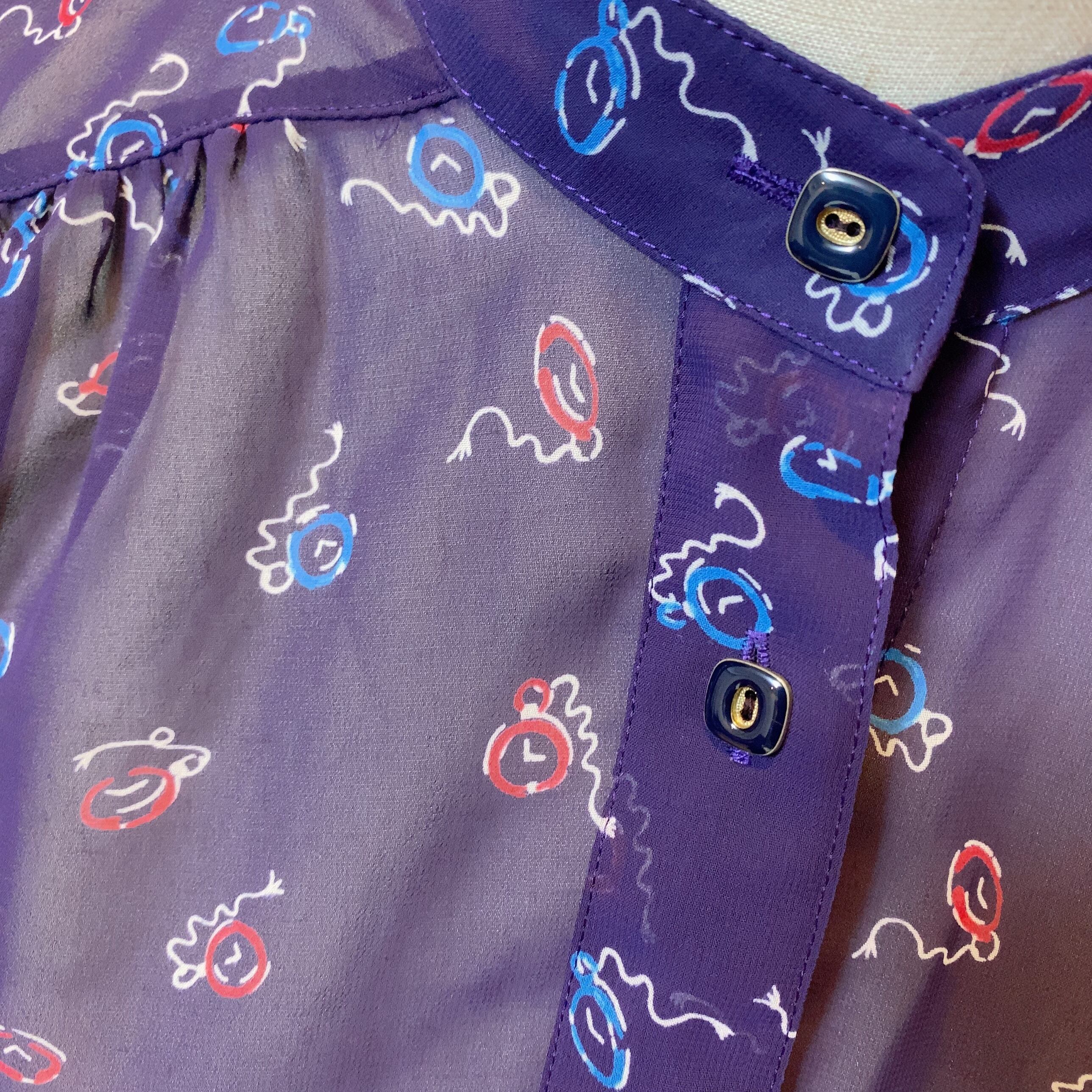 赤青の懐中時計模様がポップですが、生地が深い青みの紫なのでどこかミステリアス。