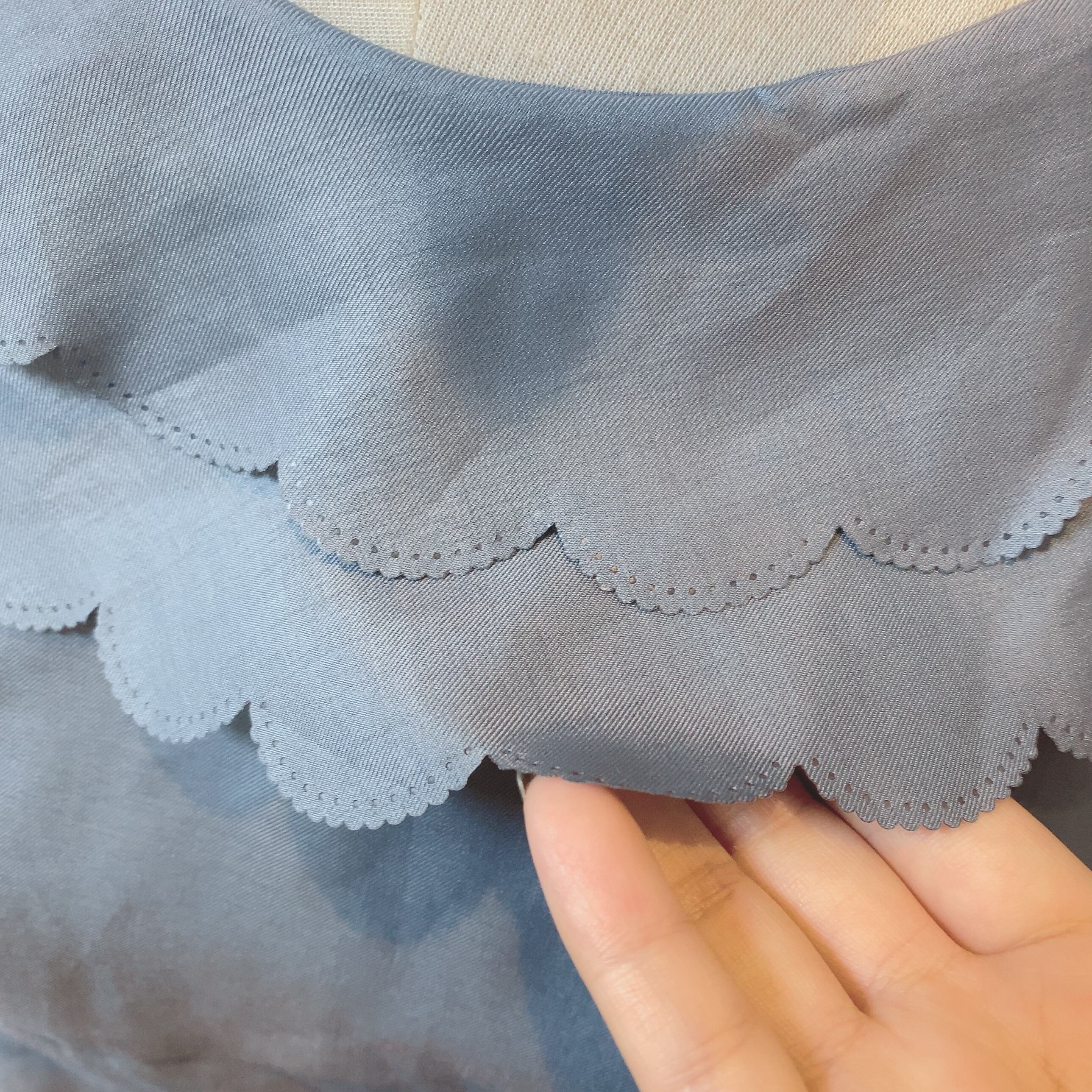 首元の2連襟がかわいいながら、落ち着いたくすみブルーの色合いとウエストのダーツが綺麗な印象をもたせてくれます。