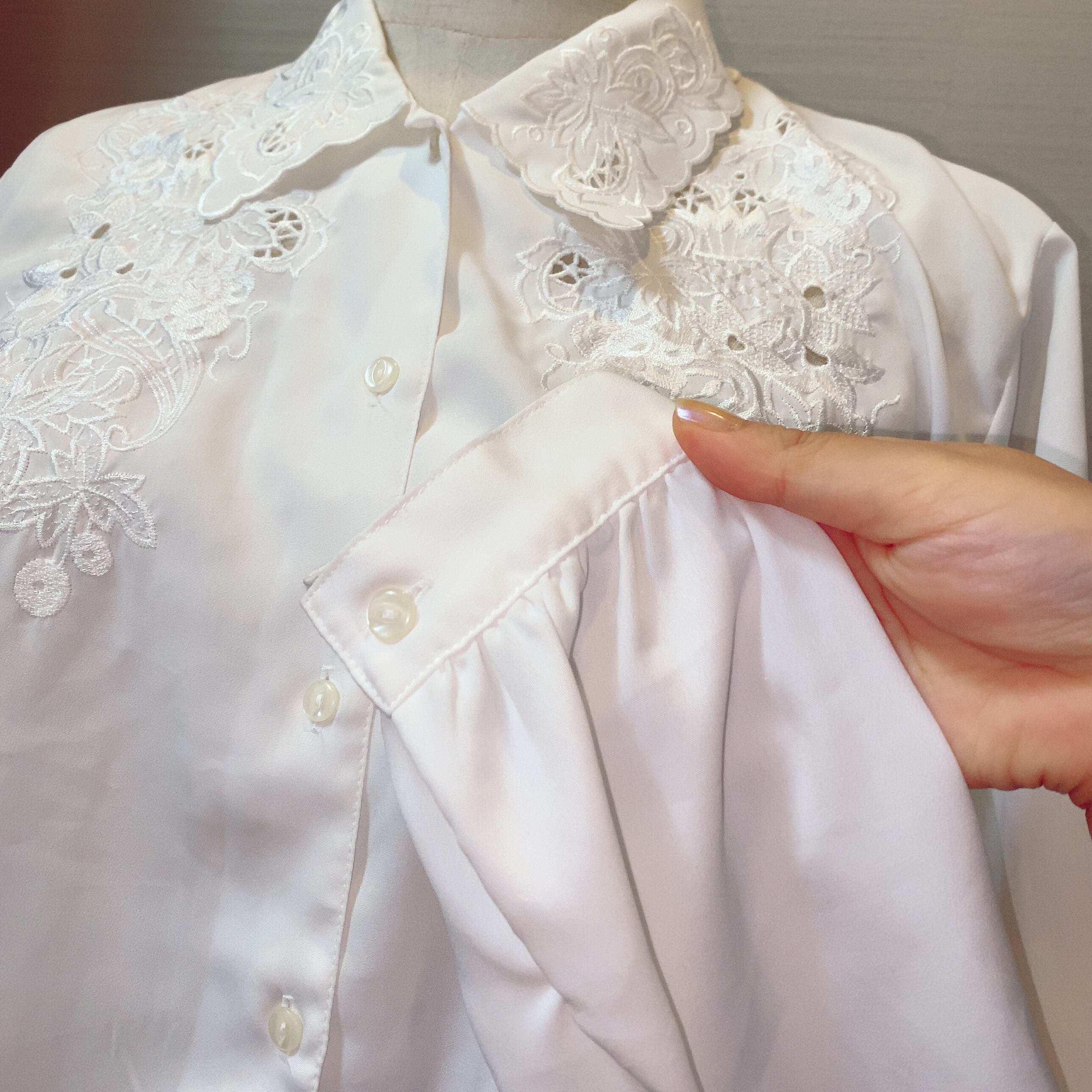 花々の透かし刺繍がデコルテに咲く純白のブラウス。