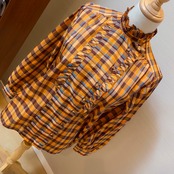 スタンドカラーにくるみボタンと可愛い要素が多いながら、オレンジのチェックがカジュアルな印象にしてくれます。
