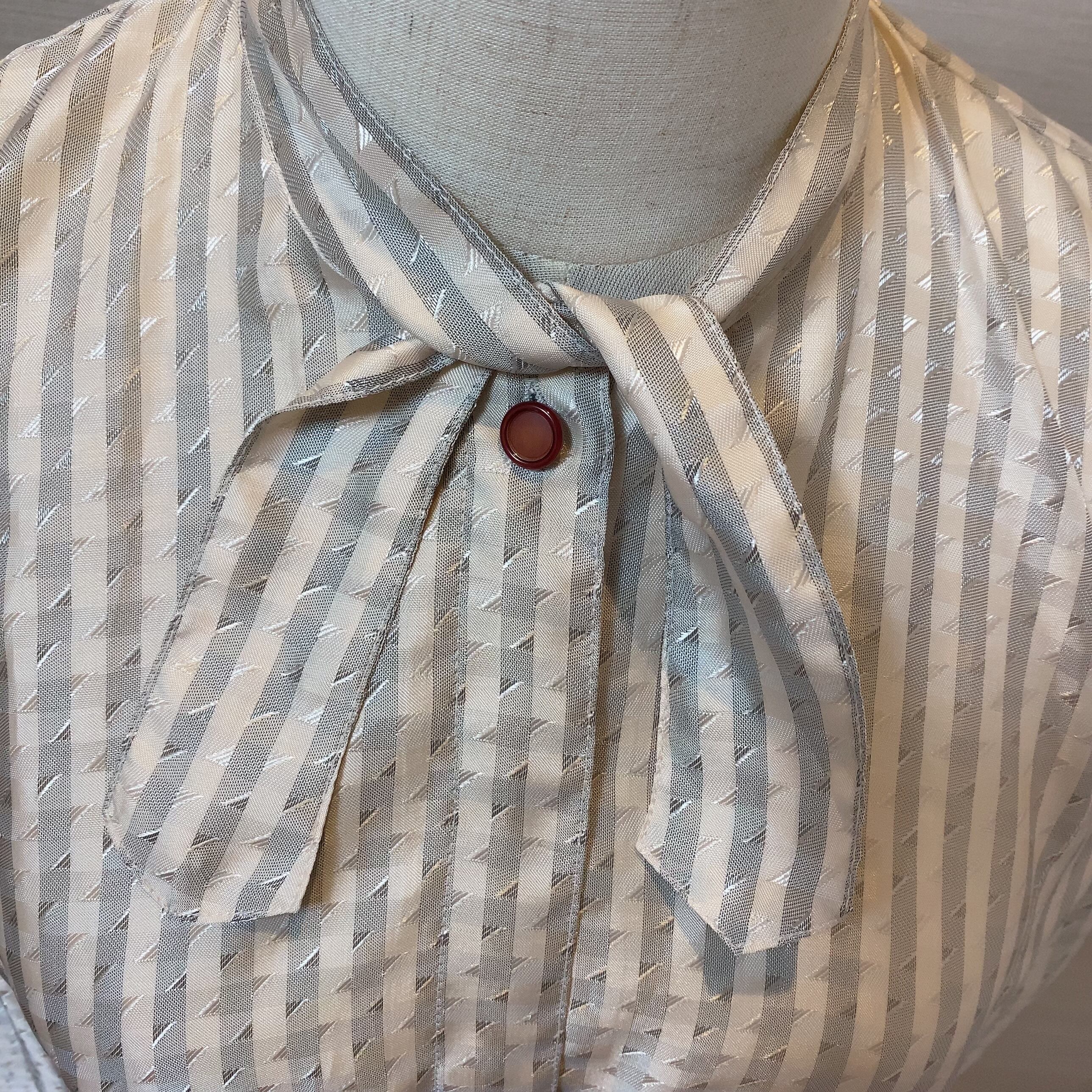 肩に直線の飾り布が付いていてスッキリ見えするブラウス。