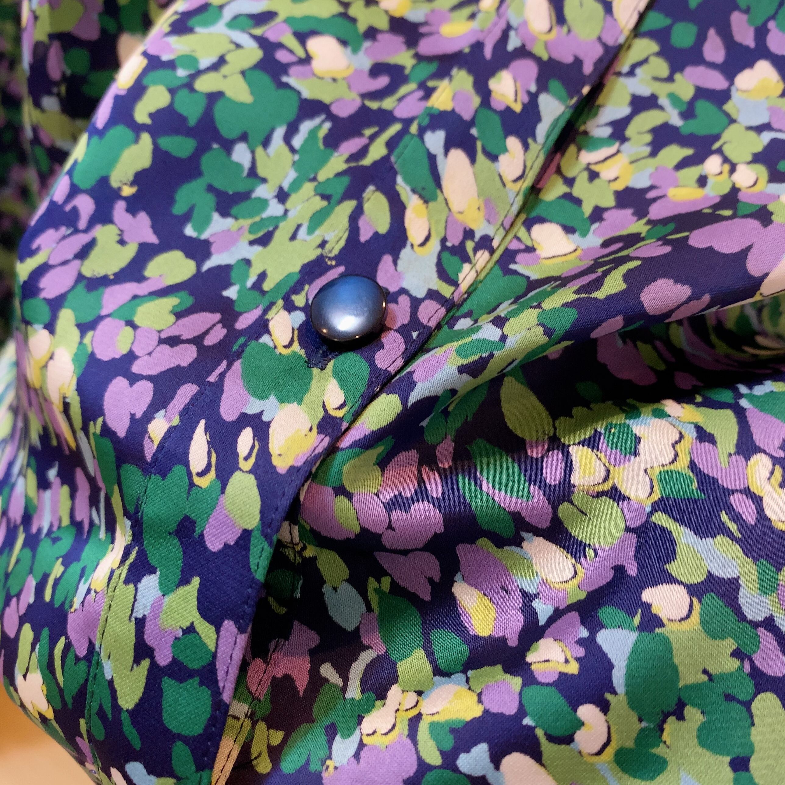 柄は絵筆を何度も重ねたような、印象派の絵画が思い浮かぶ紫と緑をベースにした柄。