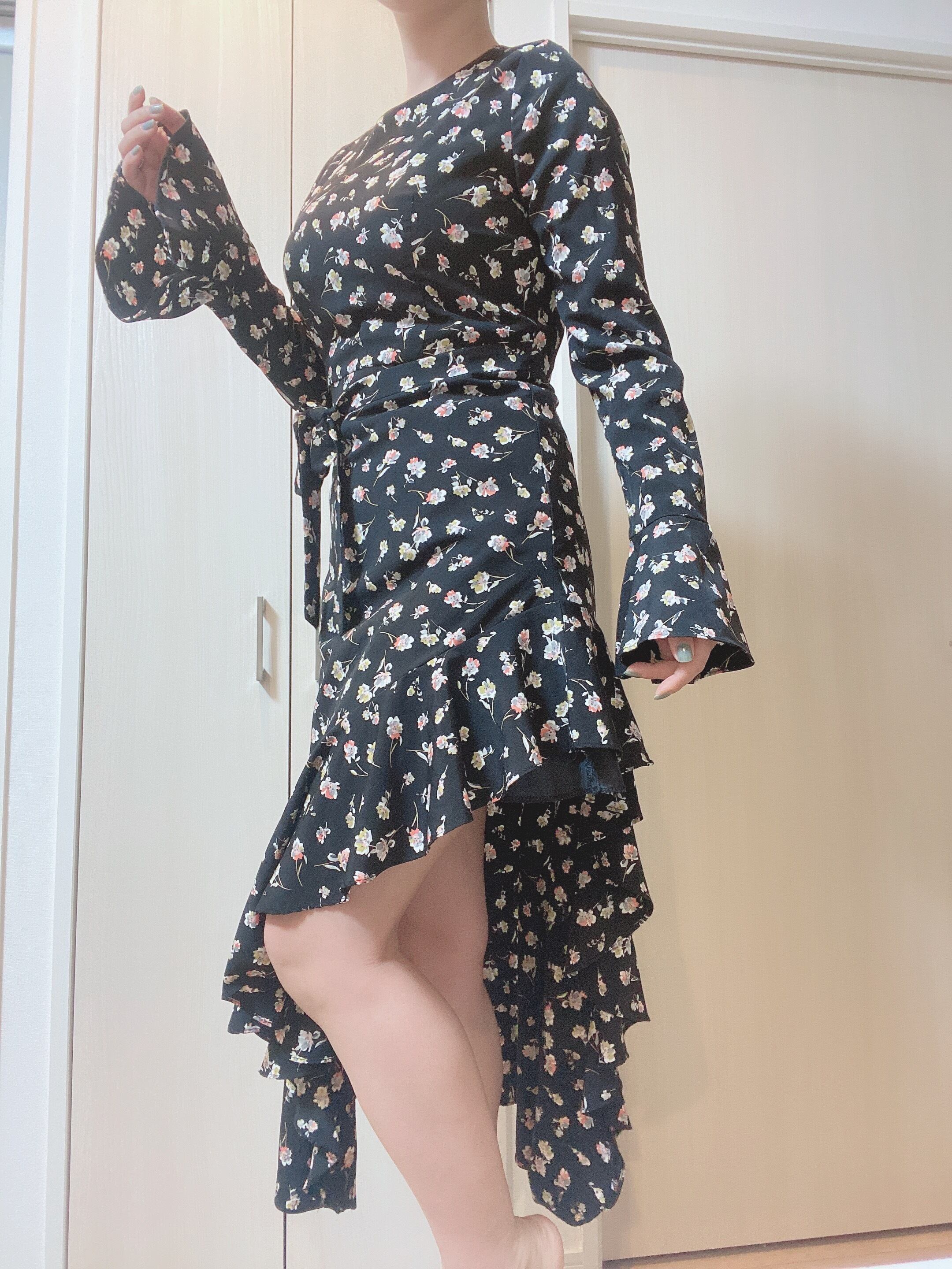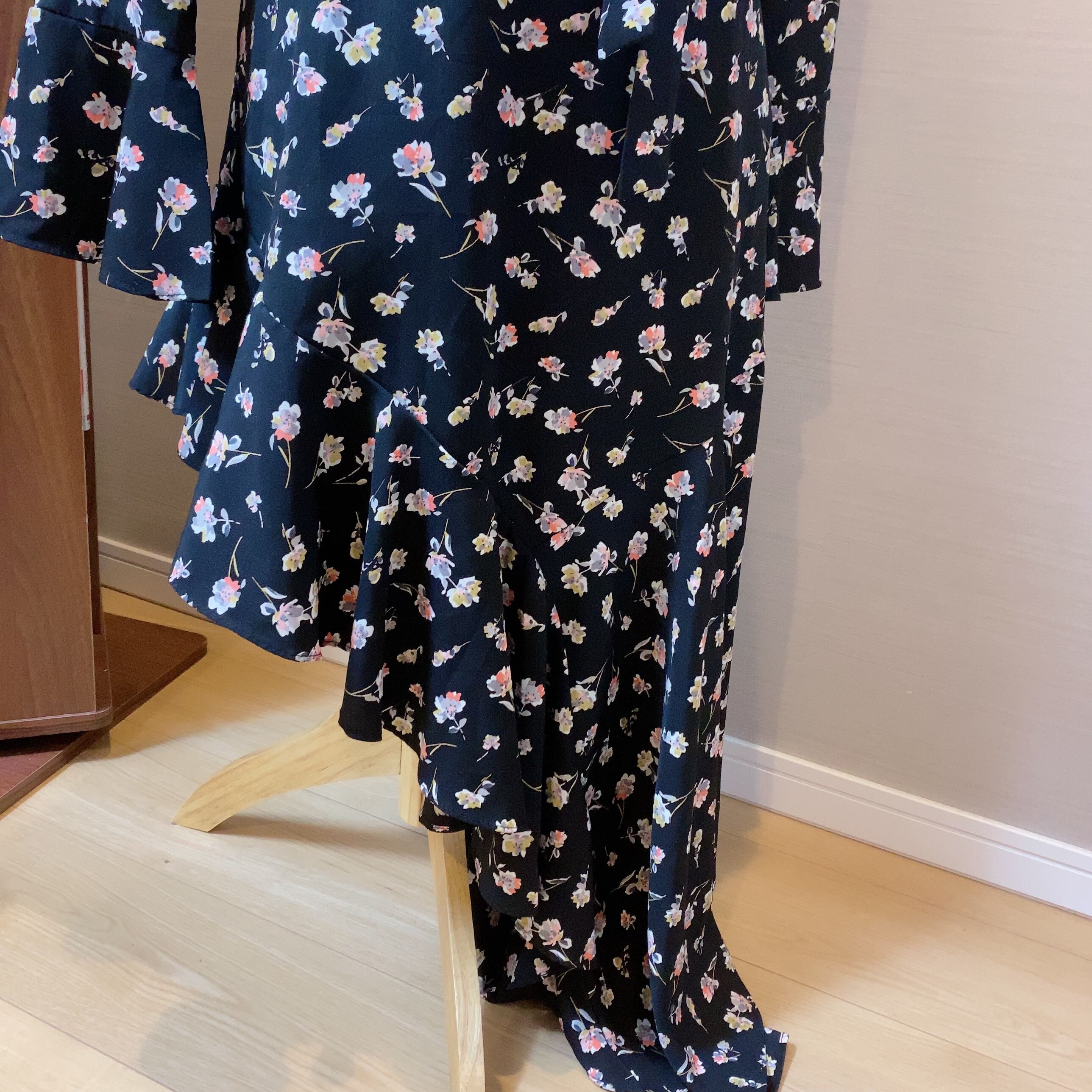 フレアスリーブとたっぷりフリルのアシンメトリーな裾がロマンティック。