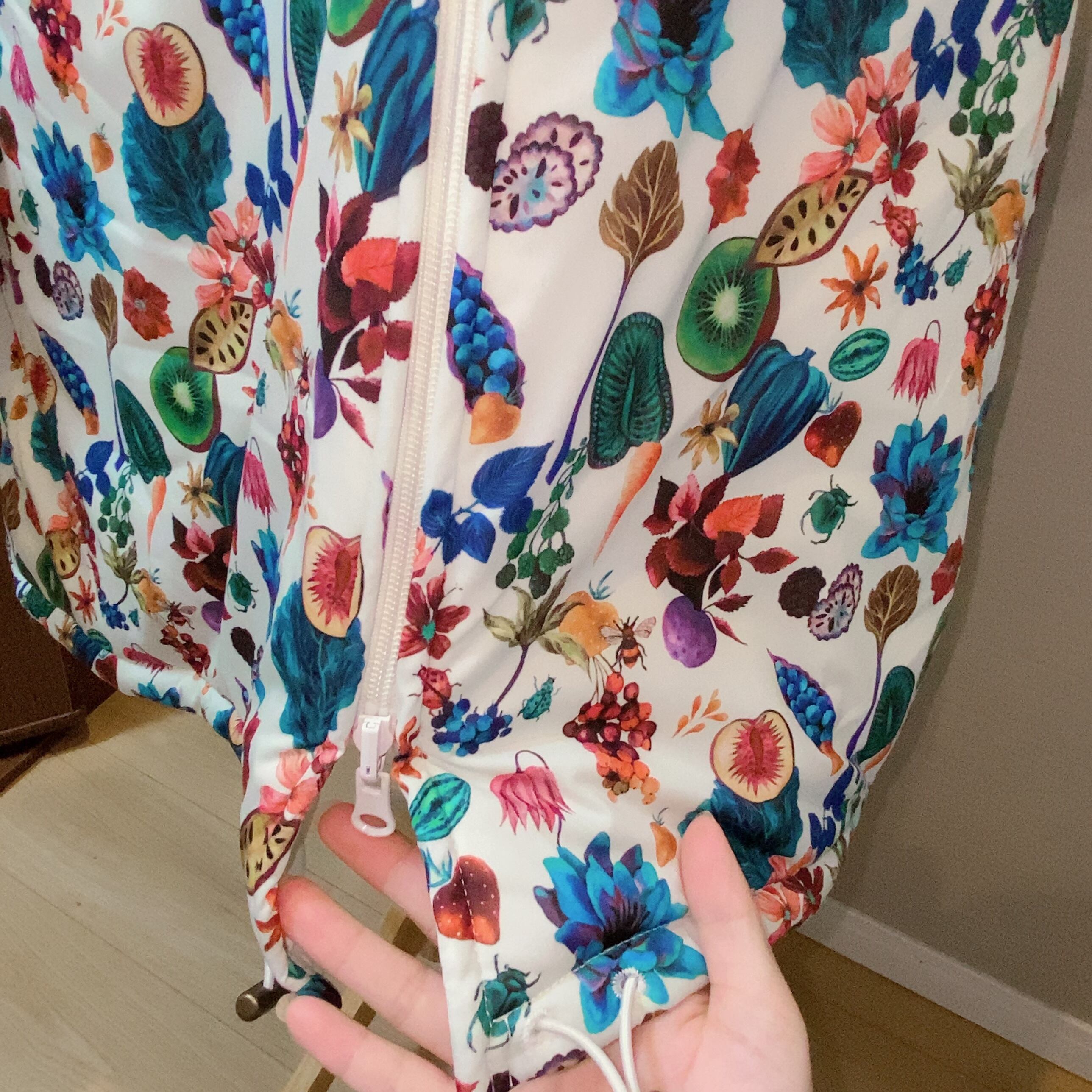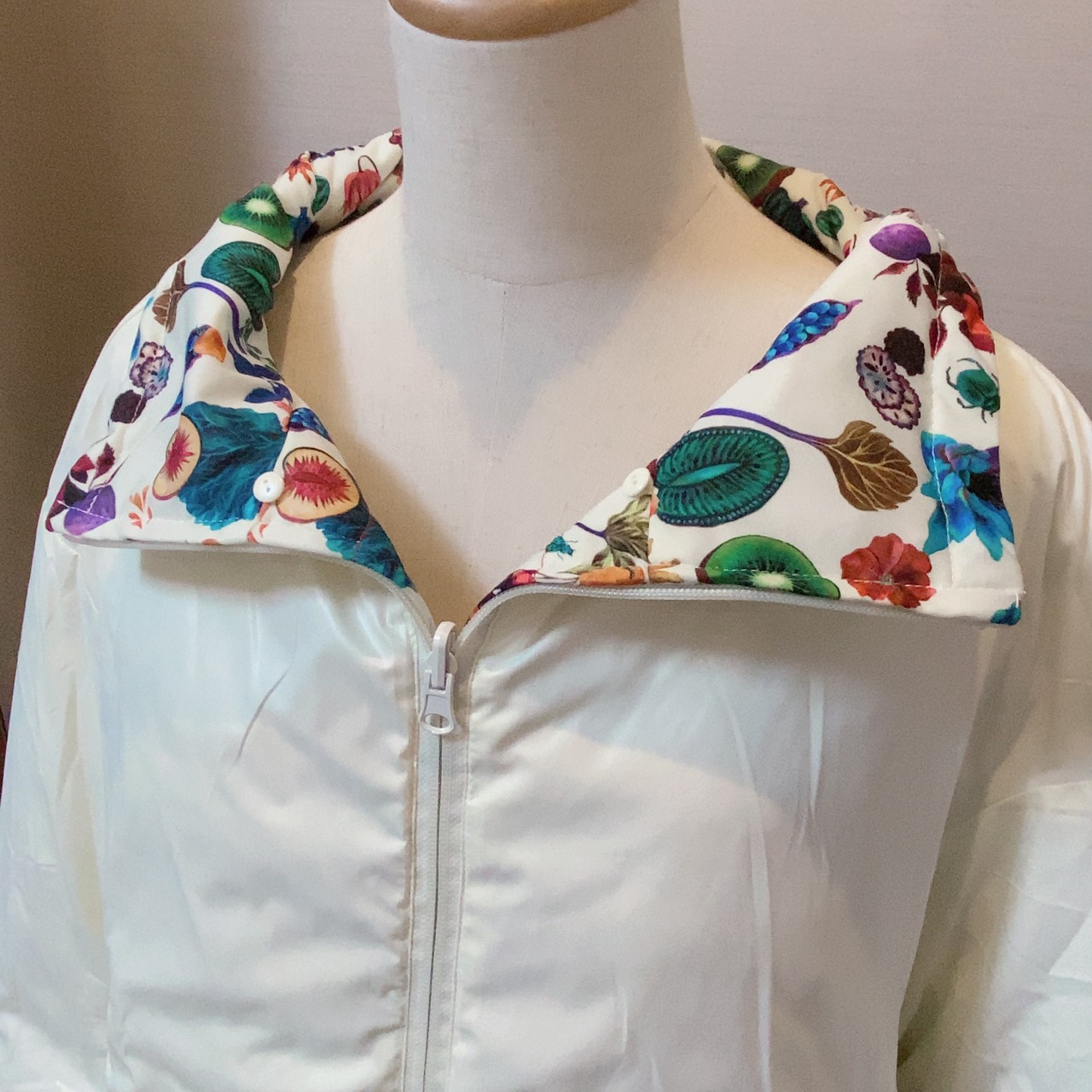 美味しそうなフルーツの総柄と、光沢のあるホワイトの面はリバーシブル!どちらもポケット付きの配慮がニクい。