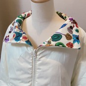 柄面はウエストの絞りがついていて、裾の絞りは共通です。襟や袖を折り返して着るのがキュート!