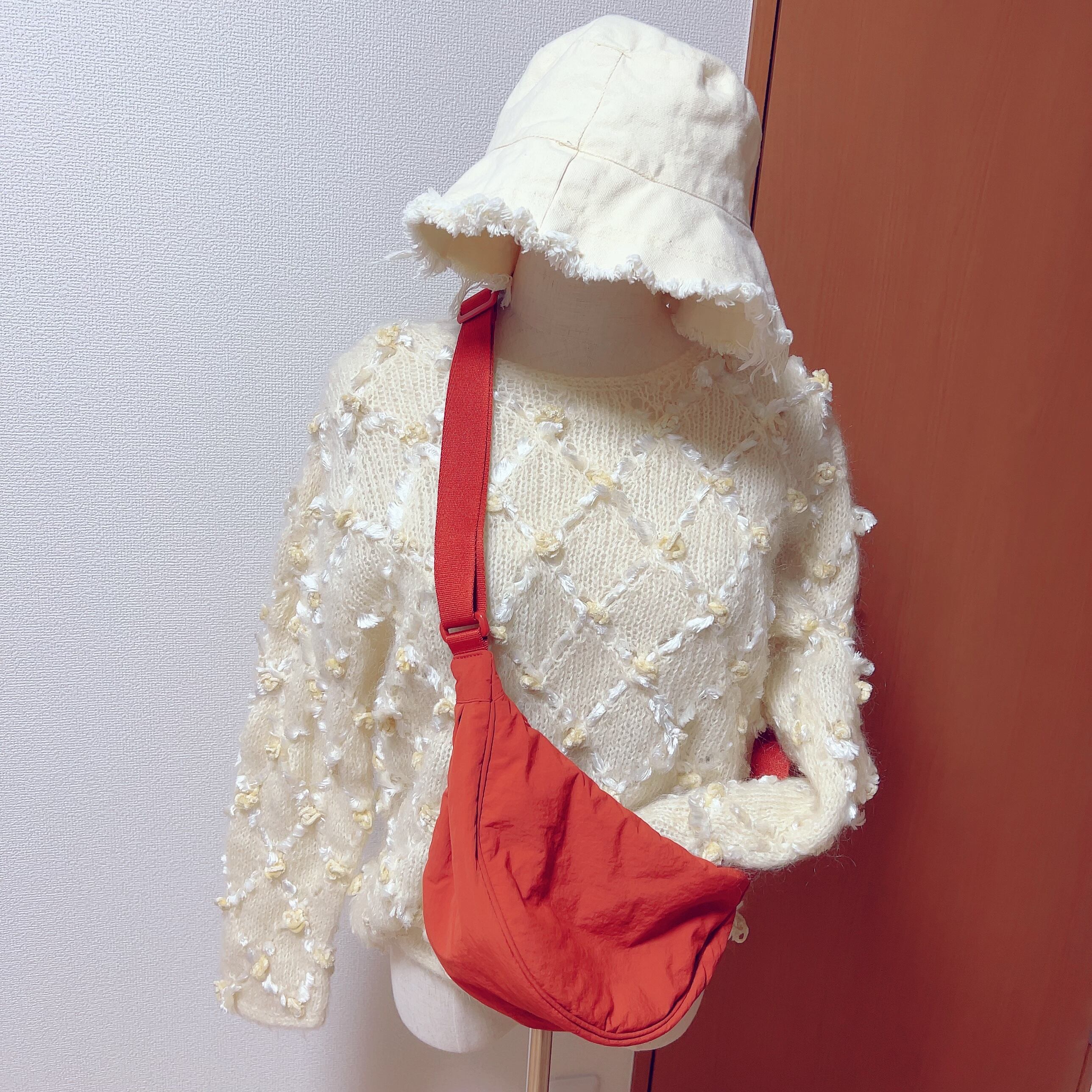 ふさふさのフリンジ糸が斜めに張り巡らされた淡いクリーム色のニット。