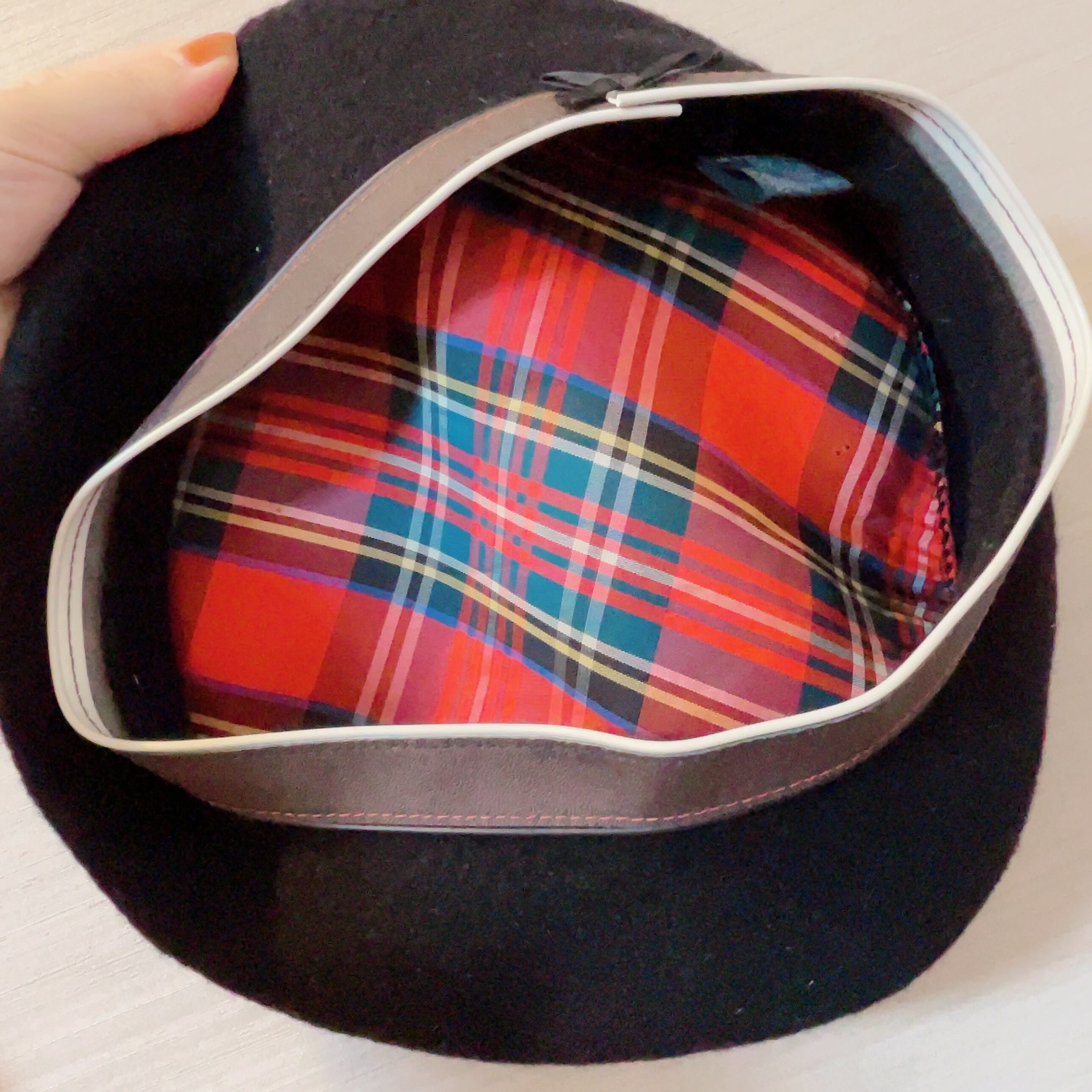 ウール製 内側がチェック、サイドに小さなリボンがあります♡