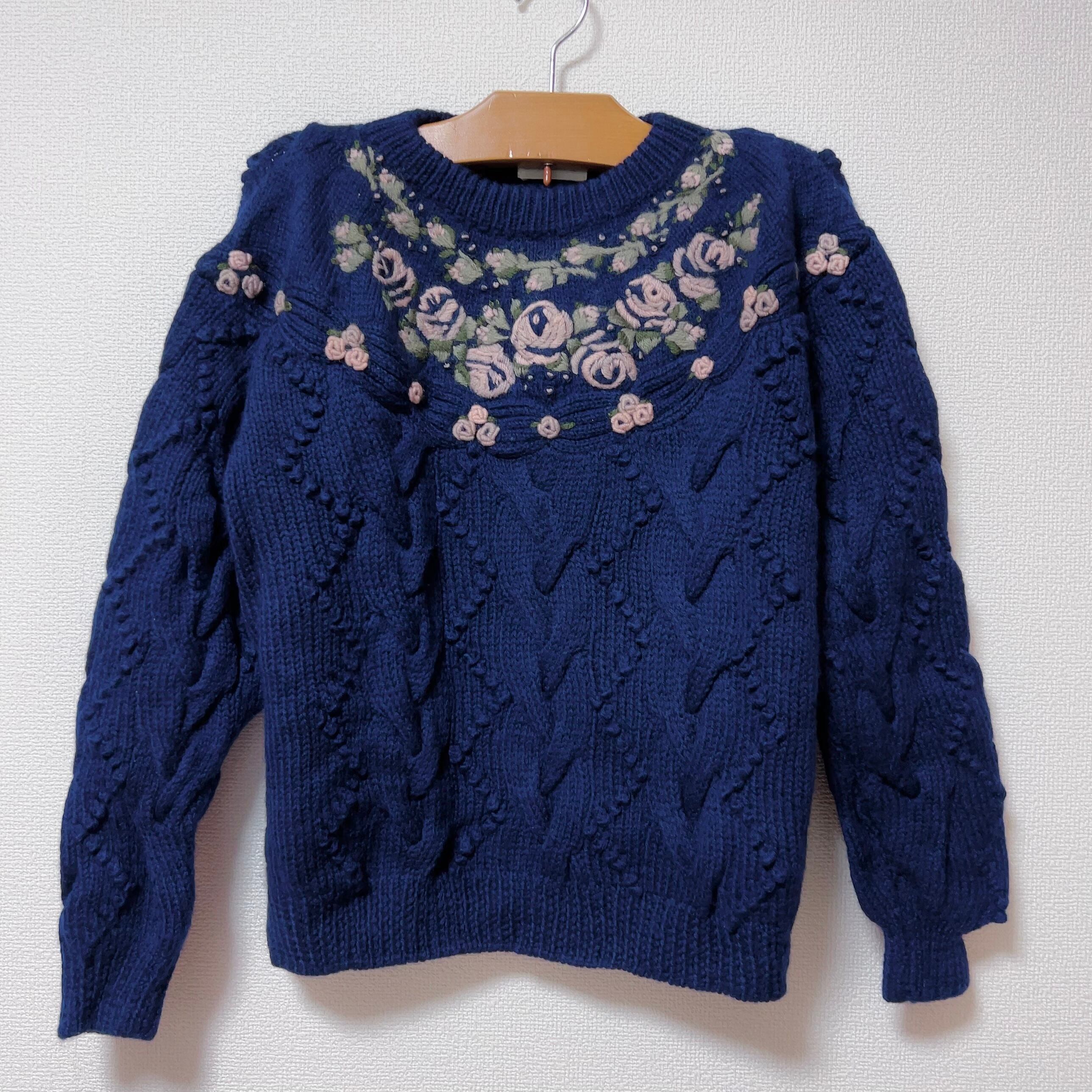 ピンクローズの刺繍が愛らしい、ボリュームたっぷりのセーター。