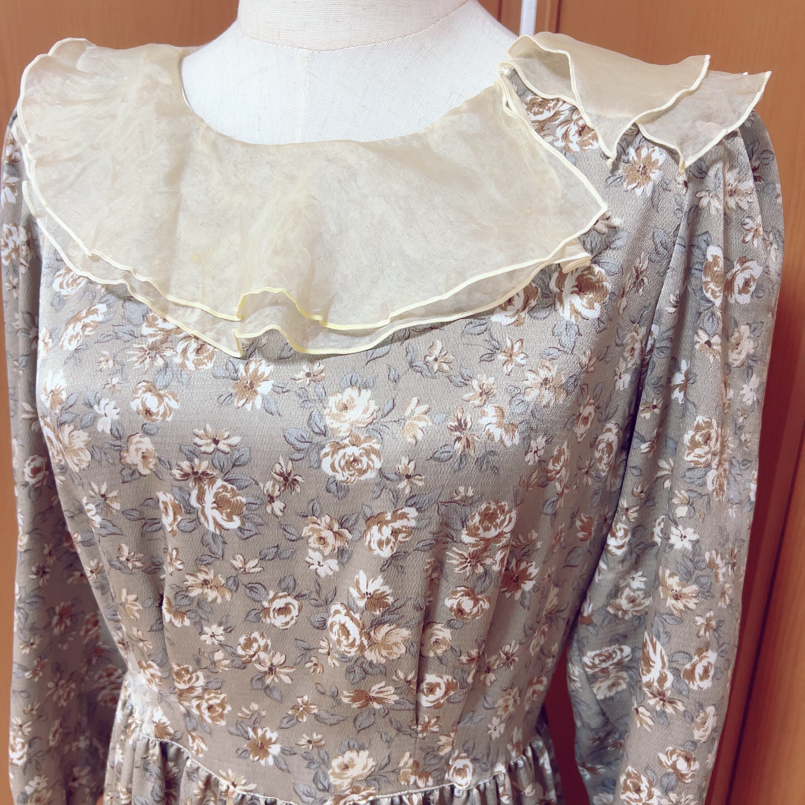 つやつやグレージュのサテン生地と、二枚重ねのオーガンジー襟がクラシカルなワンピース。
