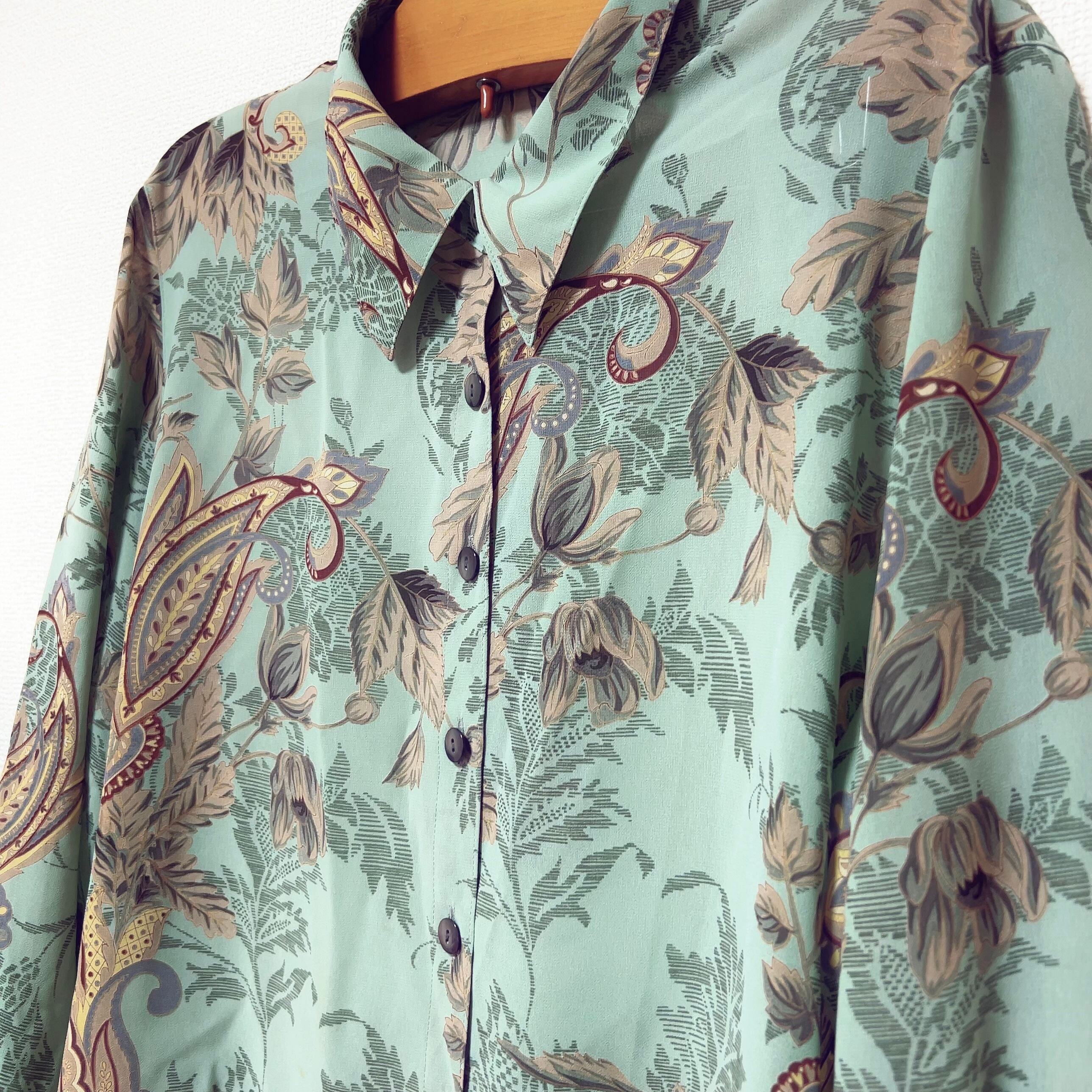 変形ペイズリーとボタニカルな柄をくすみミントグリーンに落とし込むことで、派手すぎず爽やかな印象に。
