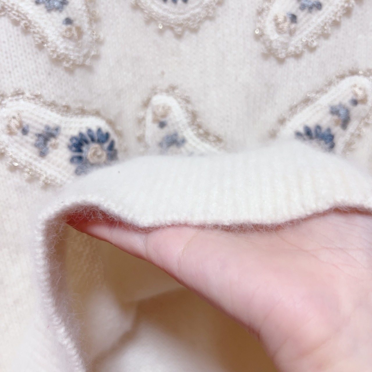 ぷっくりした青い花の刺繍がたくさんつけられたユニークな一枚。