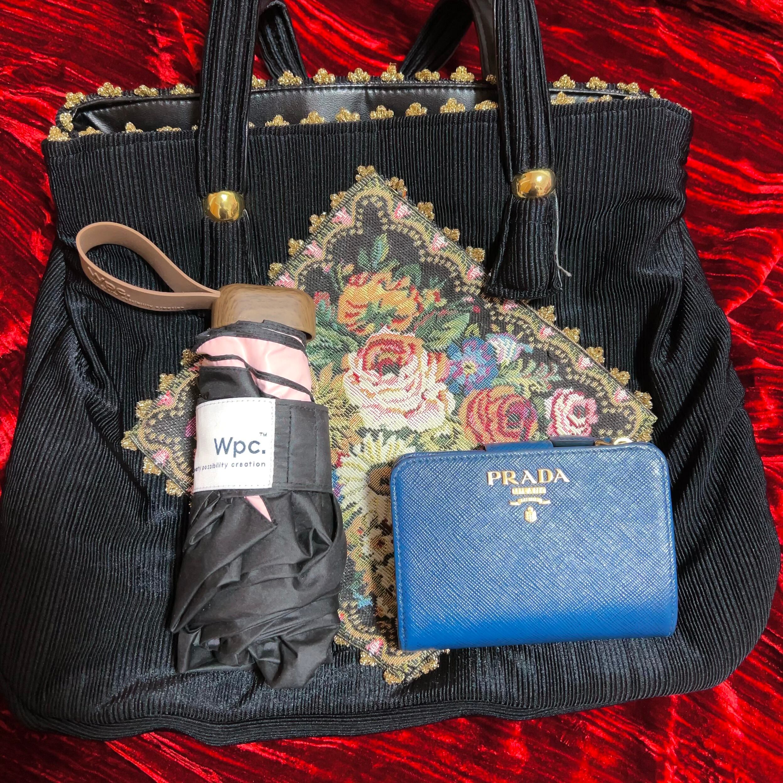 サテンプリーツのふわふわしたボディに、レトロ感満載のゴブランの飾りがついたハンドバッグ。