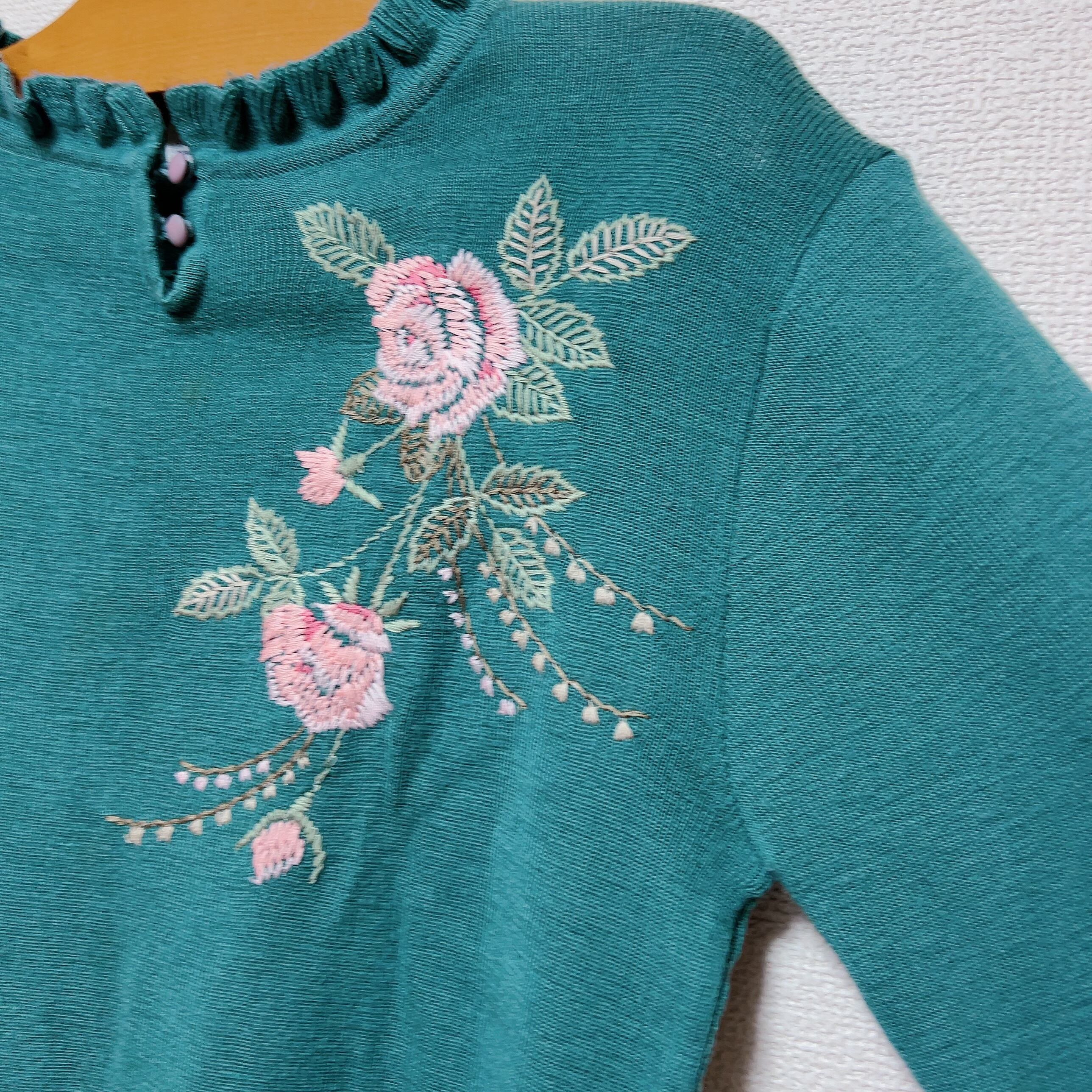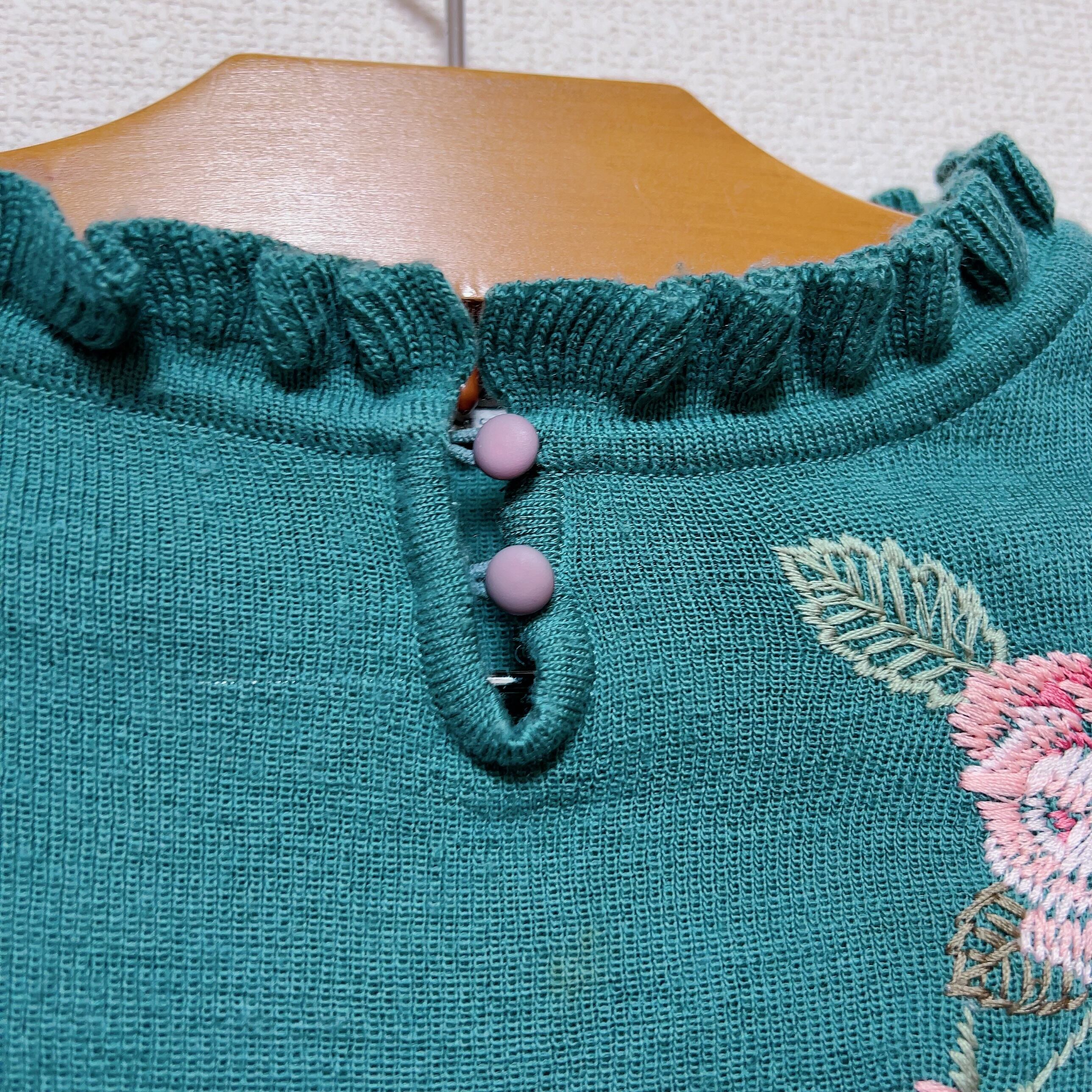 外国の海のようなターコイズブルーにピンクの薔薇の刺繍がついた薄手のニット。