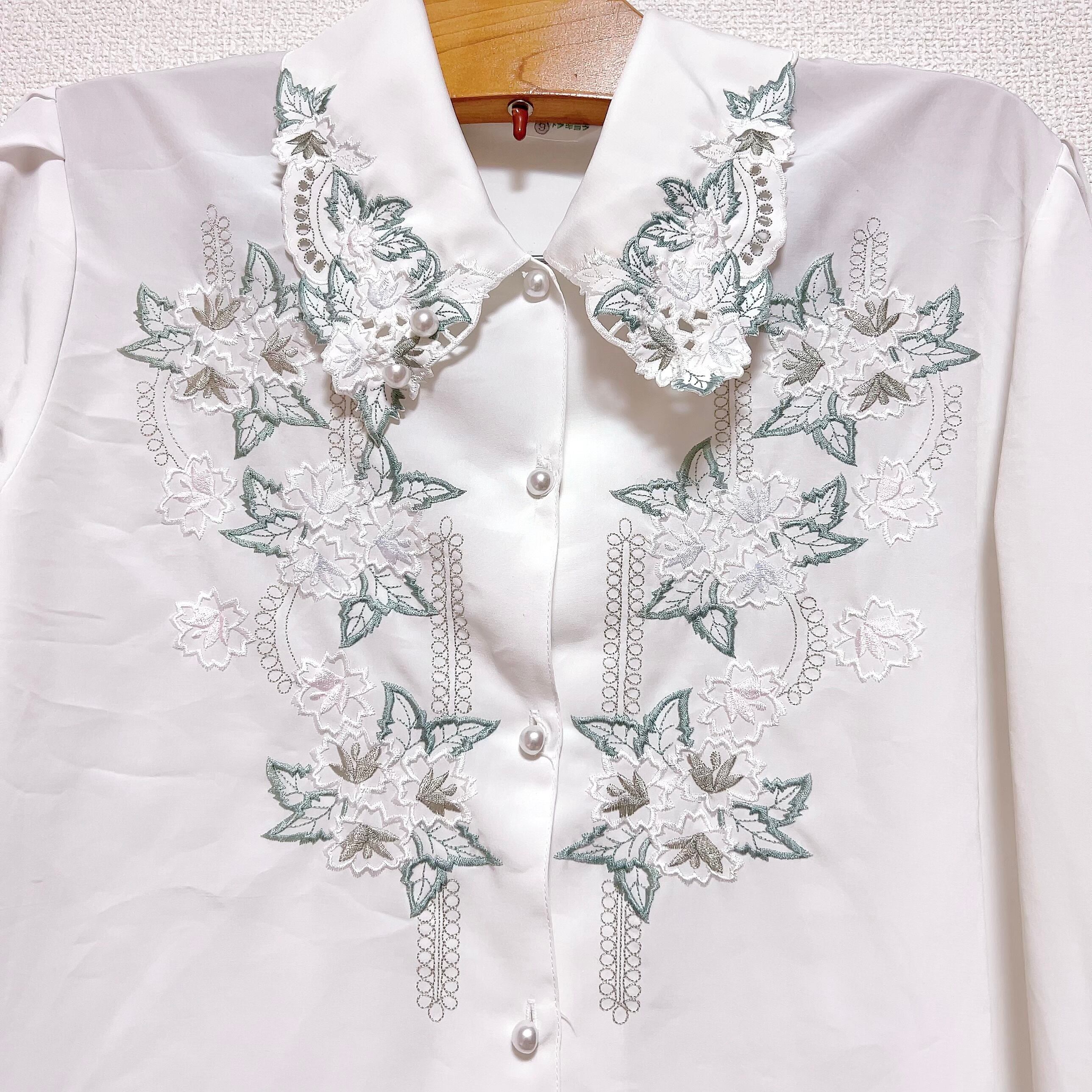 襟から胸下まで美しい刺繍が続き、襟はボタンをホールに通すことで形を変えて着用することができます。