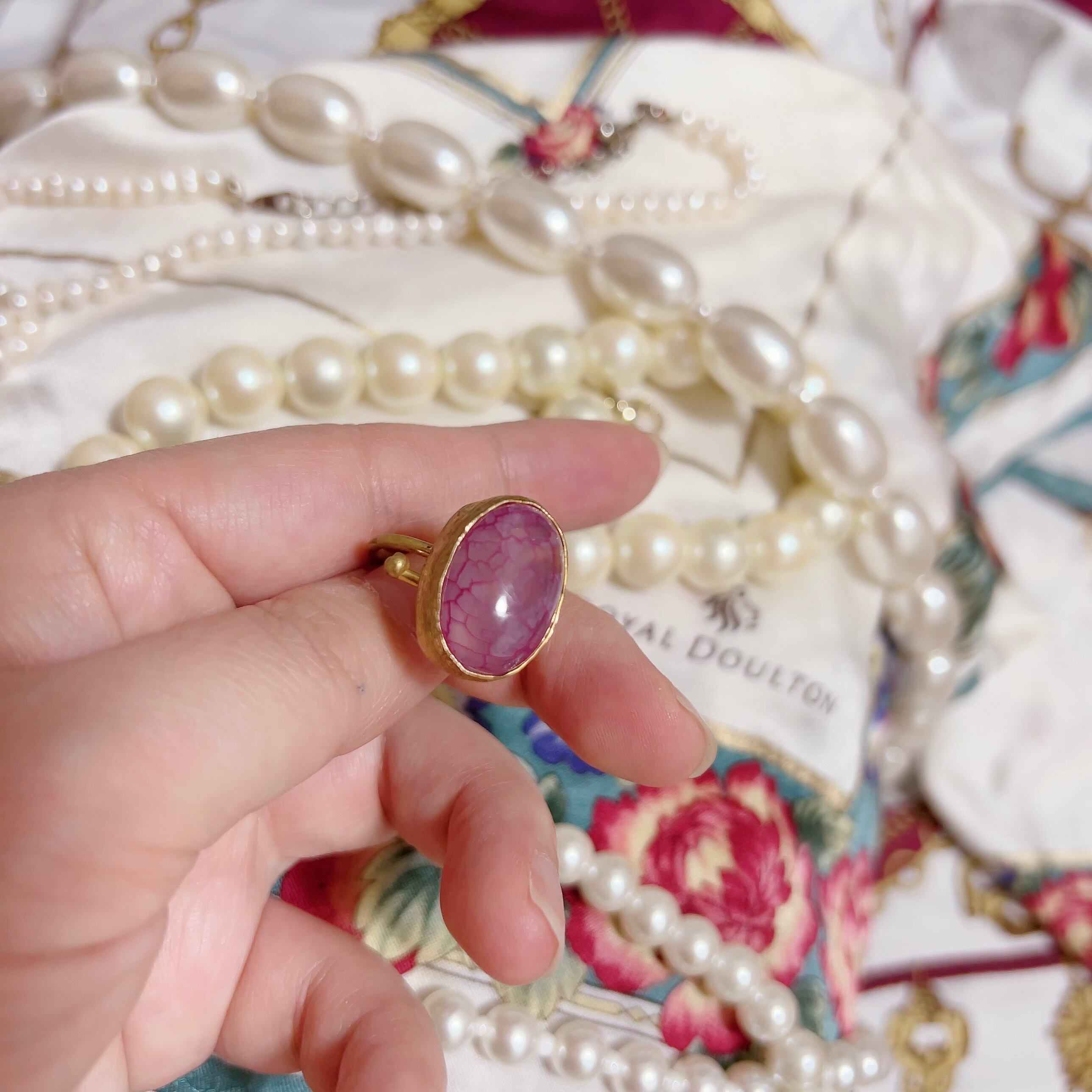 半透明で紫のクラック模様のカボションがついたリング。