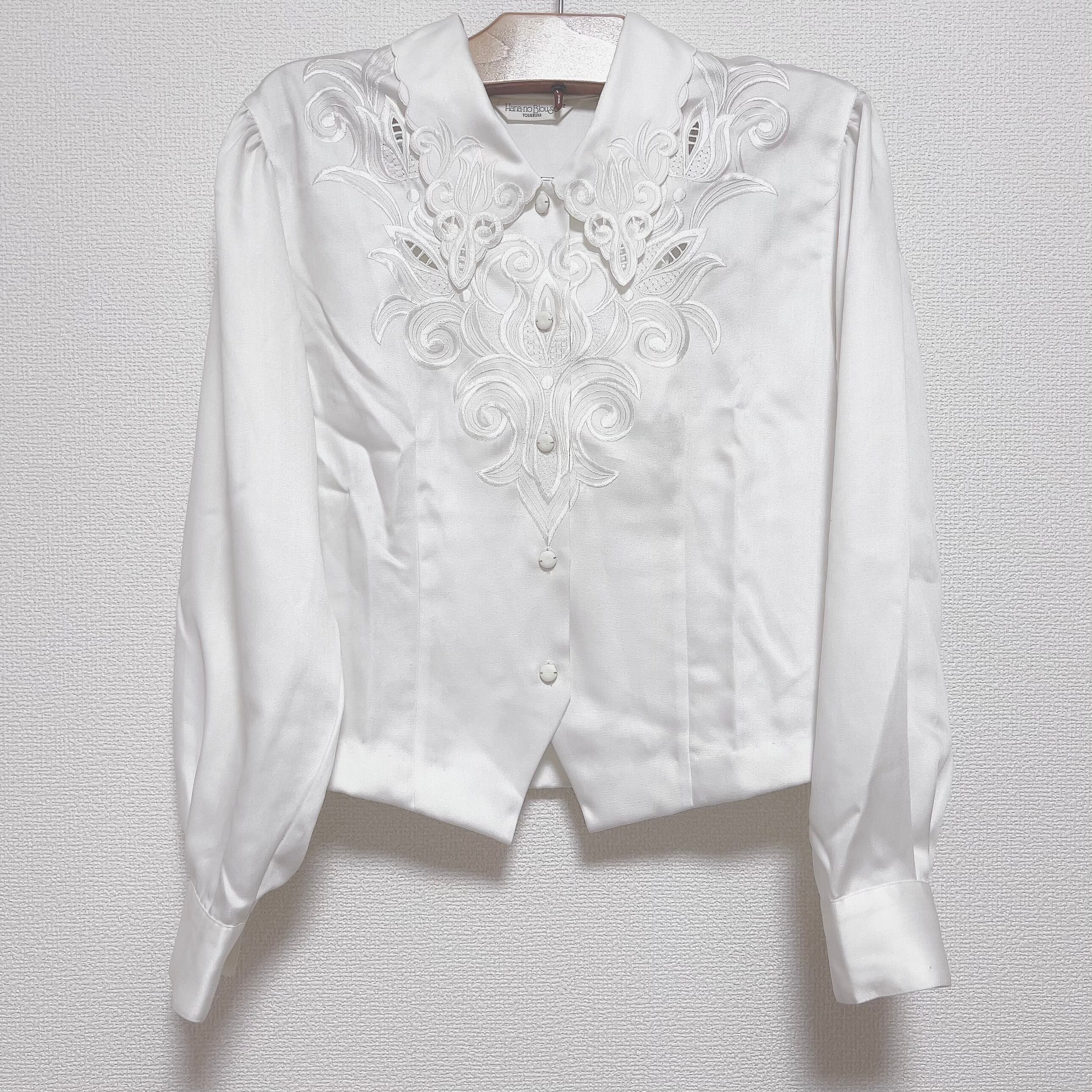 しっかりとした生地に白く輝く刺繍とスカラップ襟が美しい。
