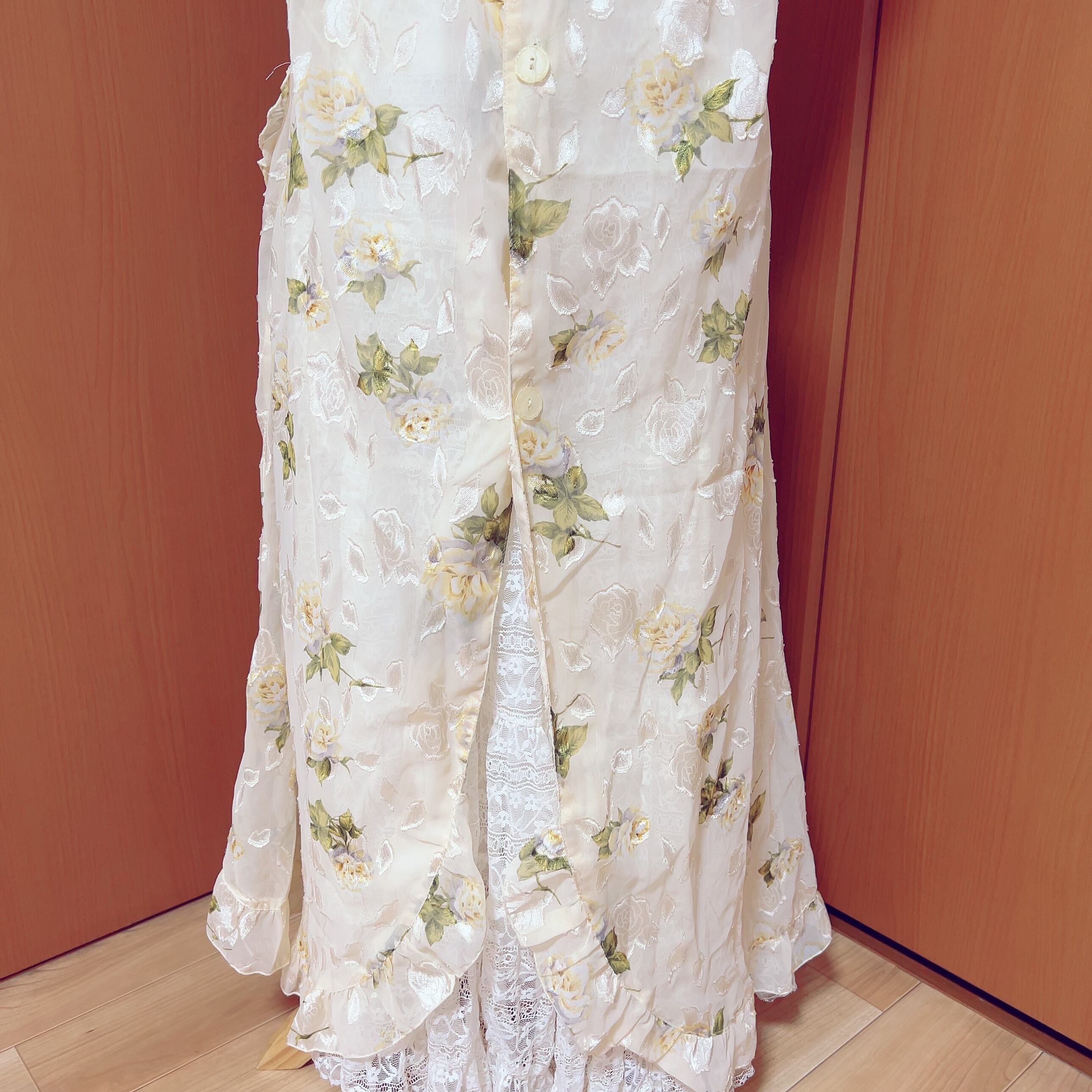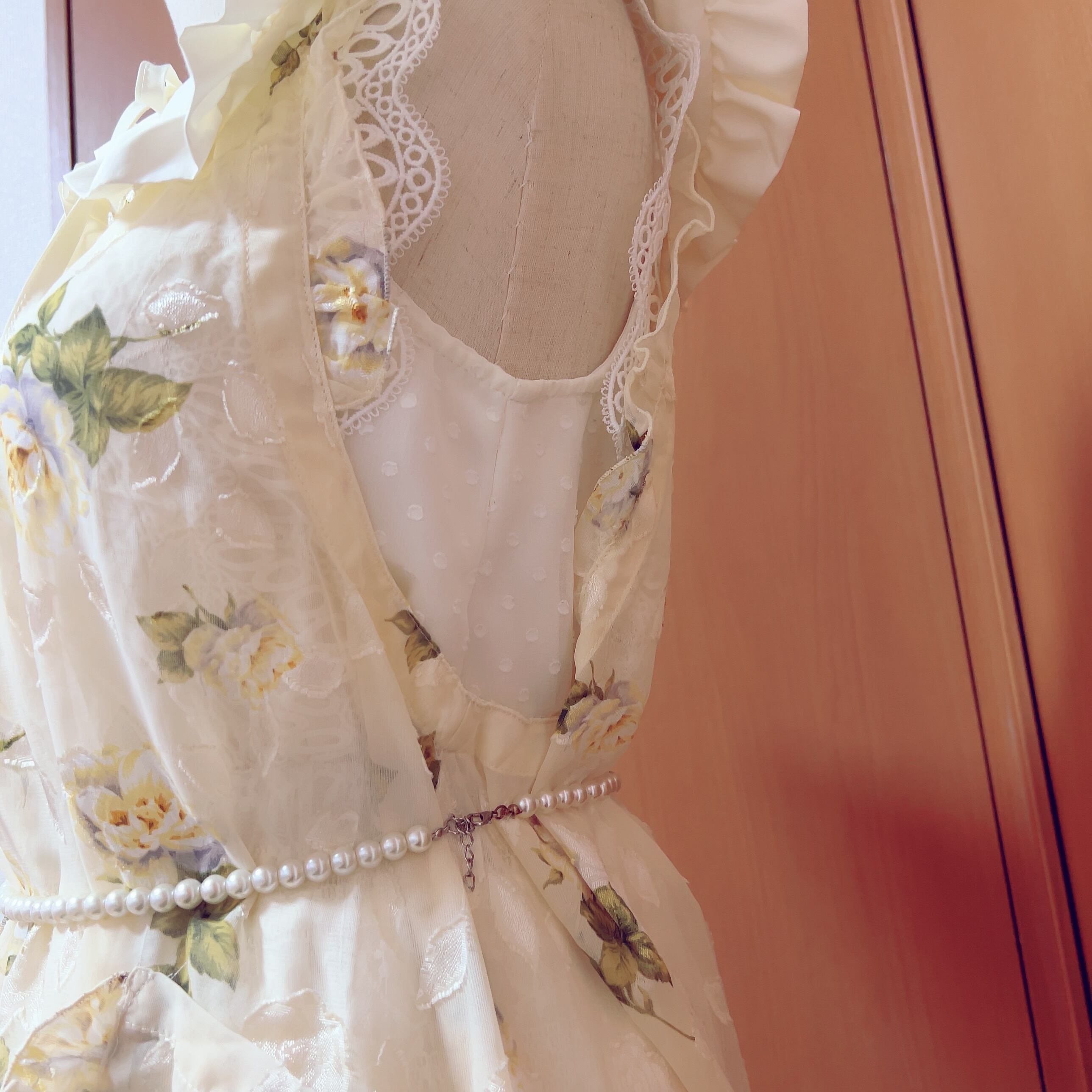 薄いシフォン素材の花柄はキラキラとした糸も織り込まれていて、明るい光を服の上からかけたように空気を含ませてくれます。