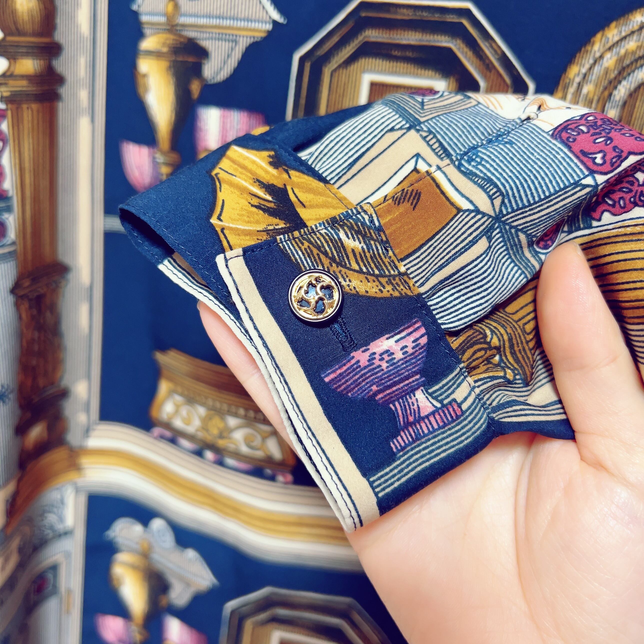 くっきりとしたネイビーにビビッドピンクのゴブレットたちが差し色になる緻密な柄。