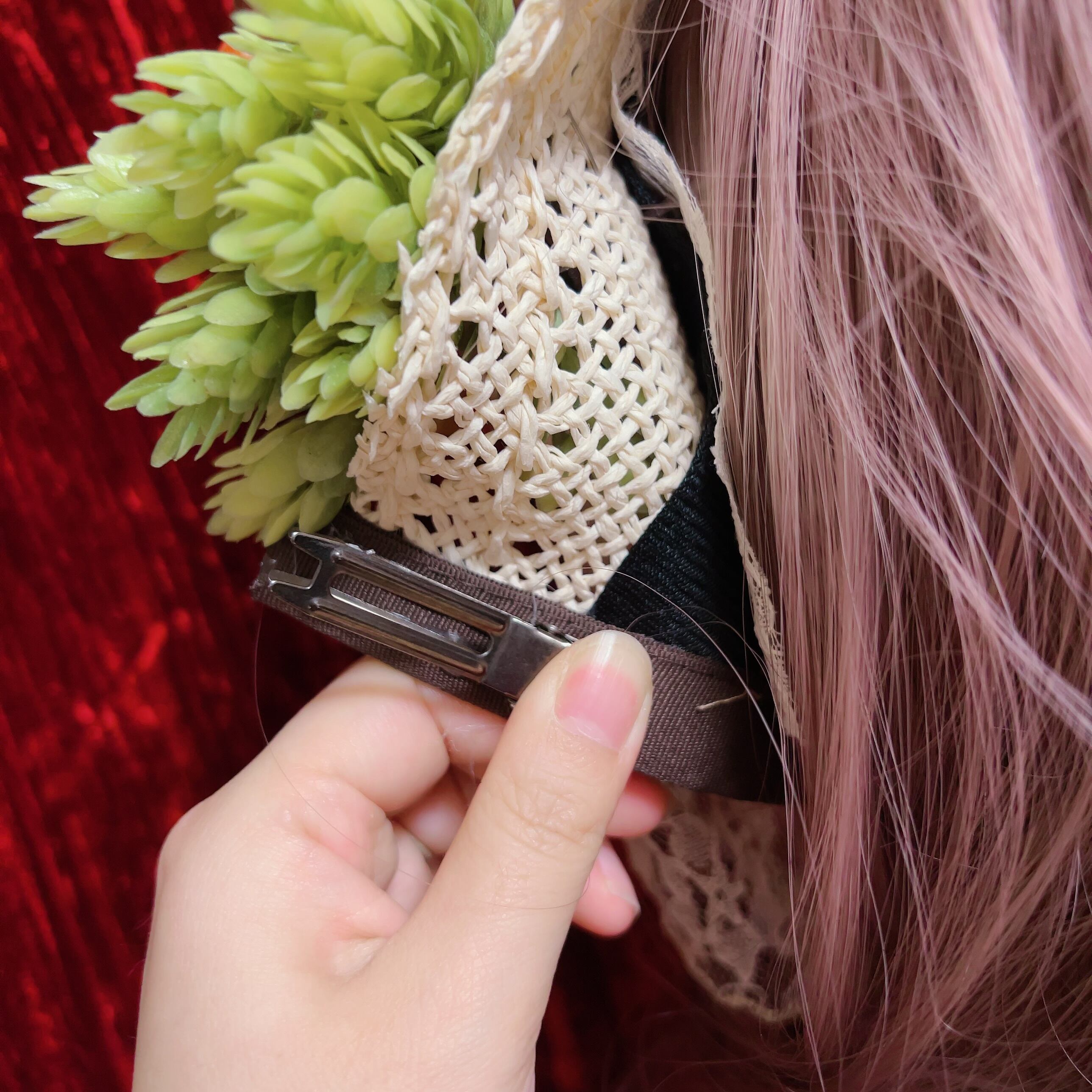 後頭部にクリップがあり、内側へ向かって固定できます。花の部分はブローチピンになっているので、好きな位置につけたり取り外して使うこともできます。