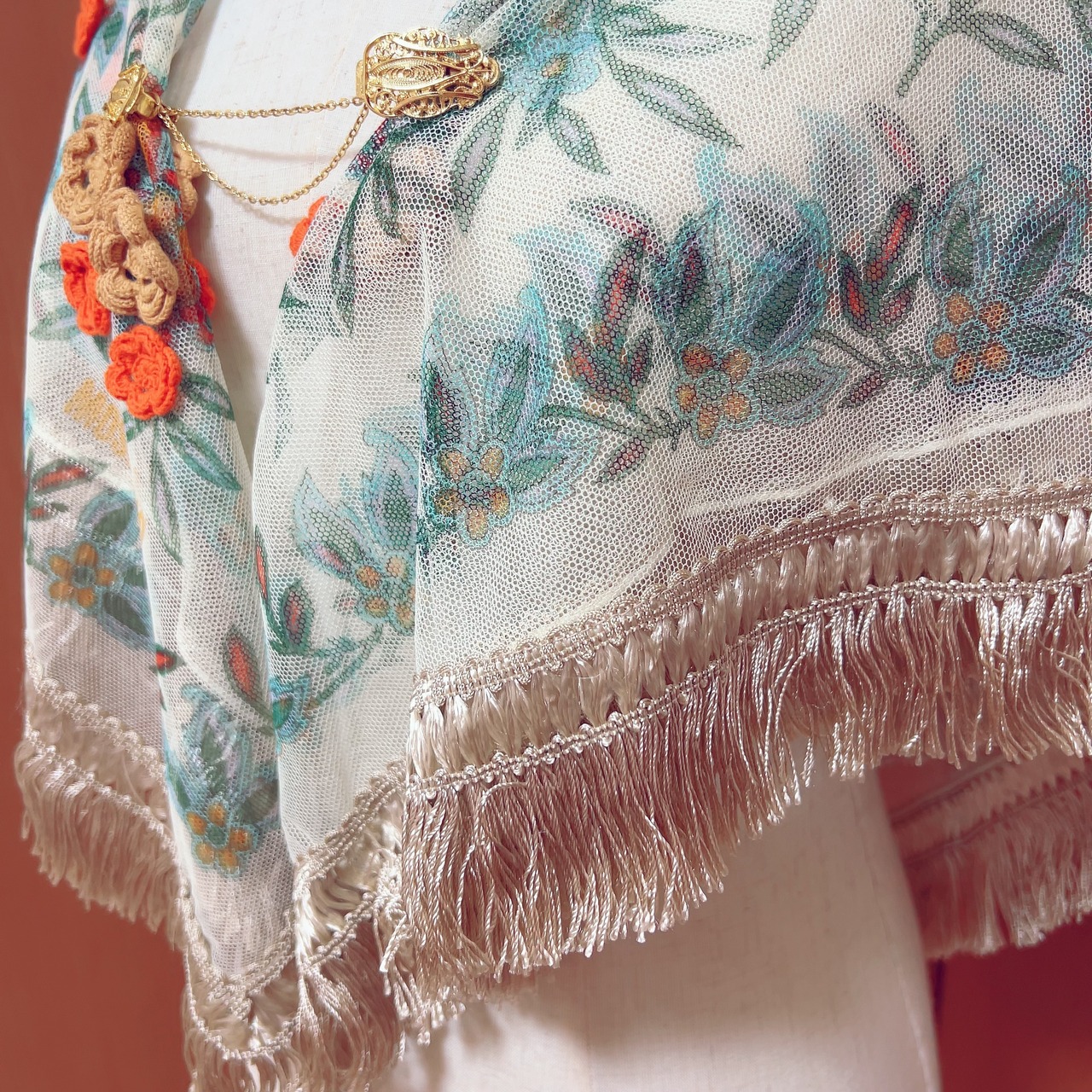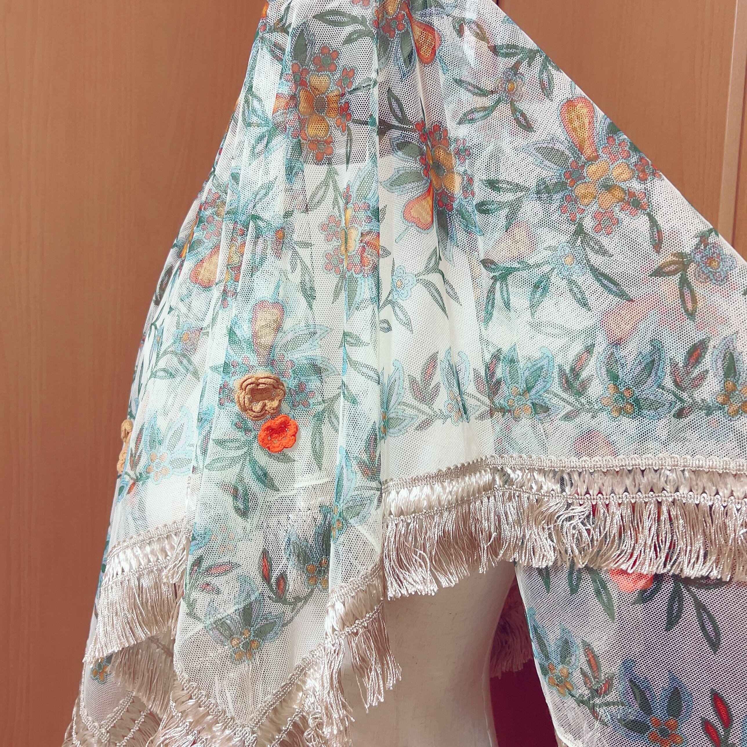 タッセルフリンジが優雅です。ストールクリップでショールのように使うも◎、テーブルやベッドクロスとしても使えるマルチクロス。