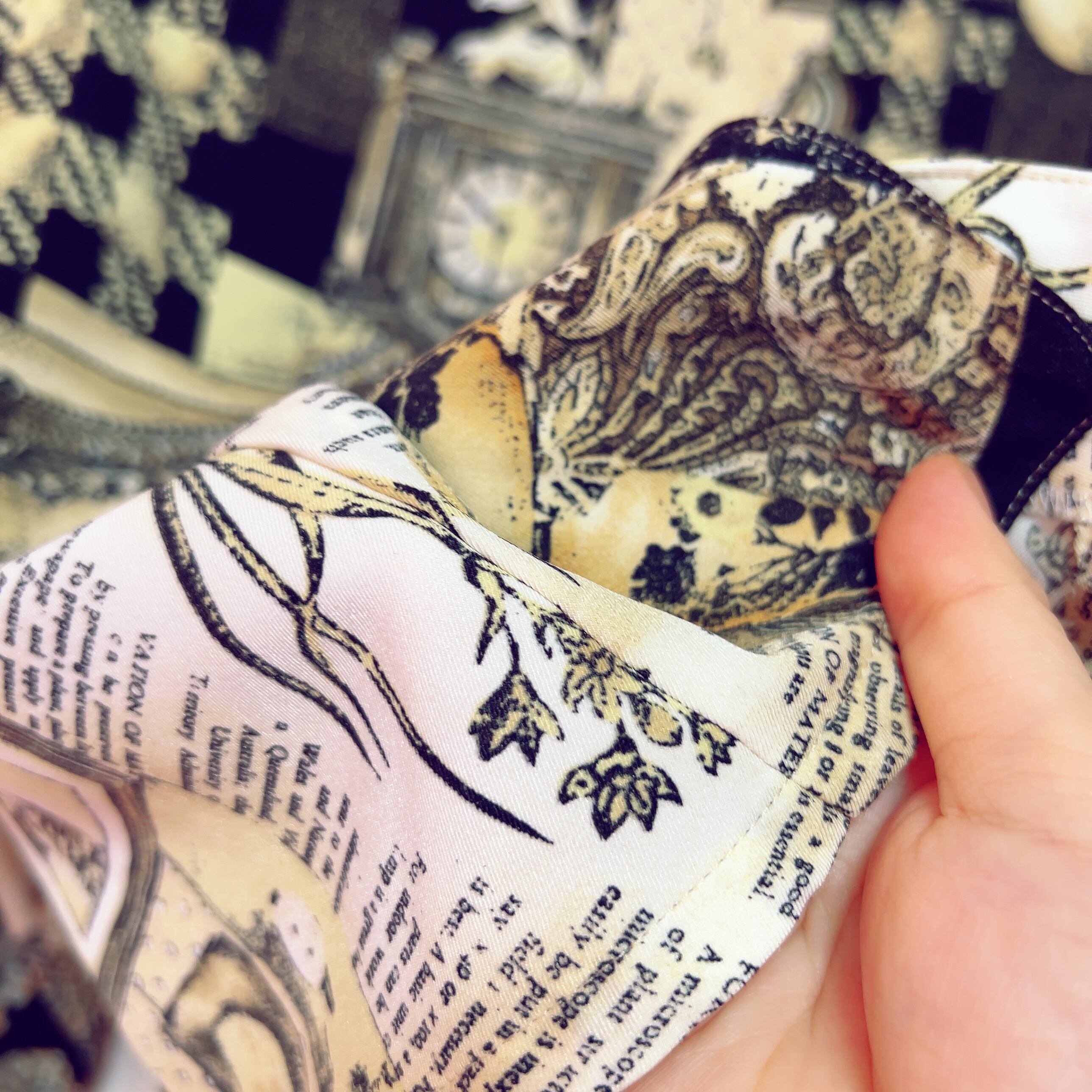 イエローベージュを基調に、ヴィンテージな柄を配置した一着。
