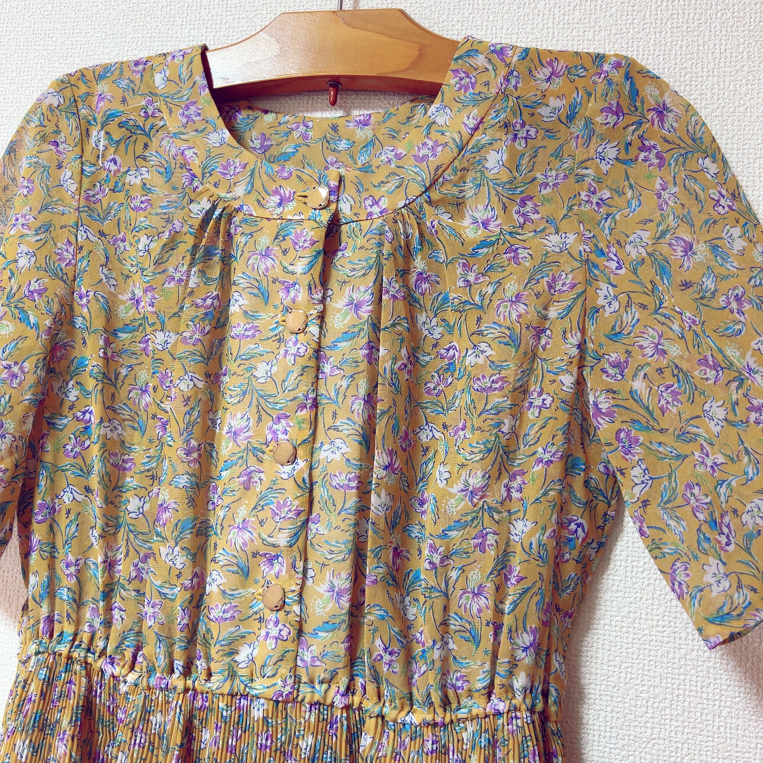 辛子色に紫の小花がアクセントになって、シンプルになりすぎない上品な一枚に。