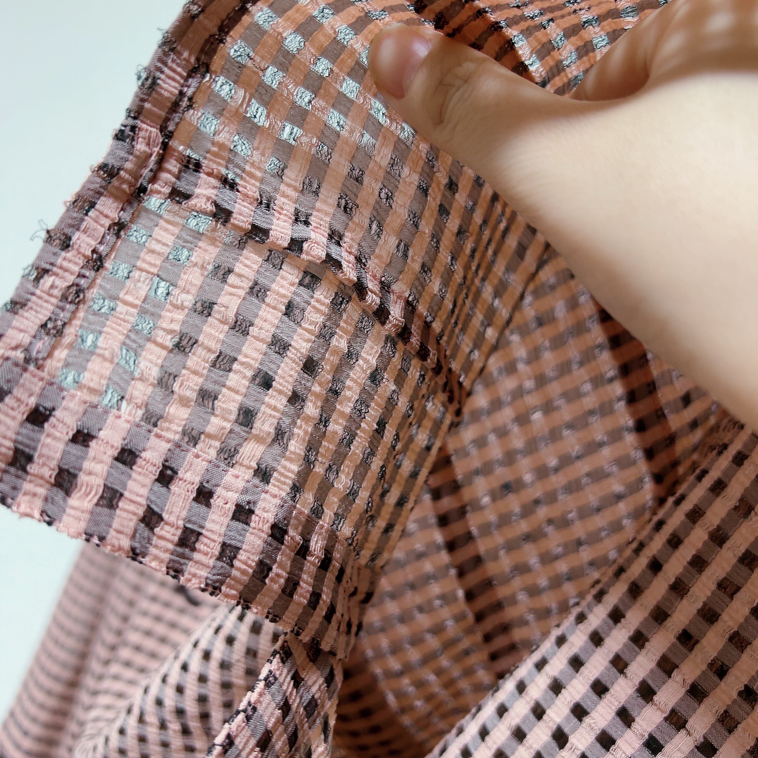やさしいピンクブラウンの生地はぽこぽこと起伏があり肌に張り付かない素材。シアーになっていて、微妙な気温の日も快適に過ごせます。