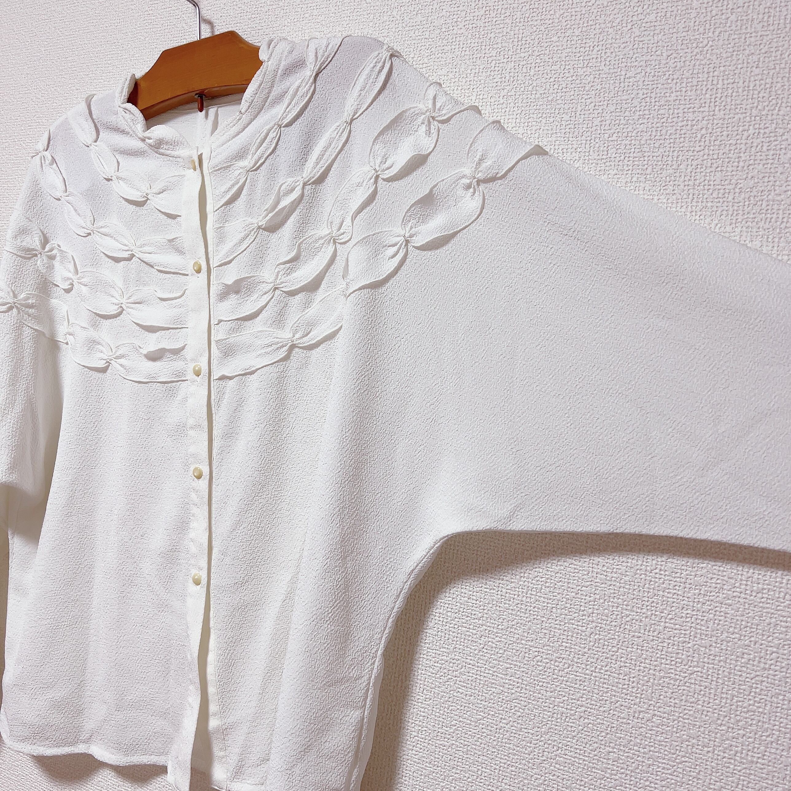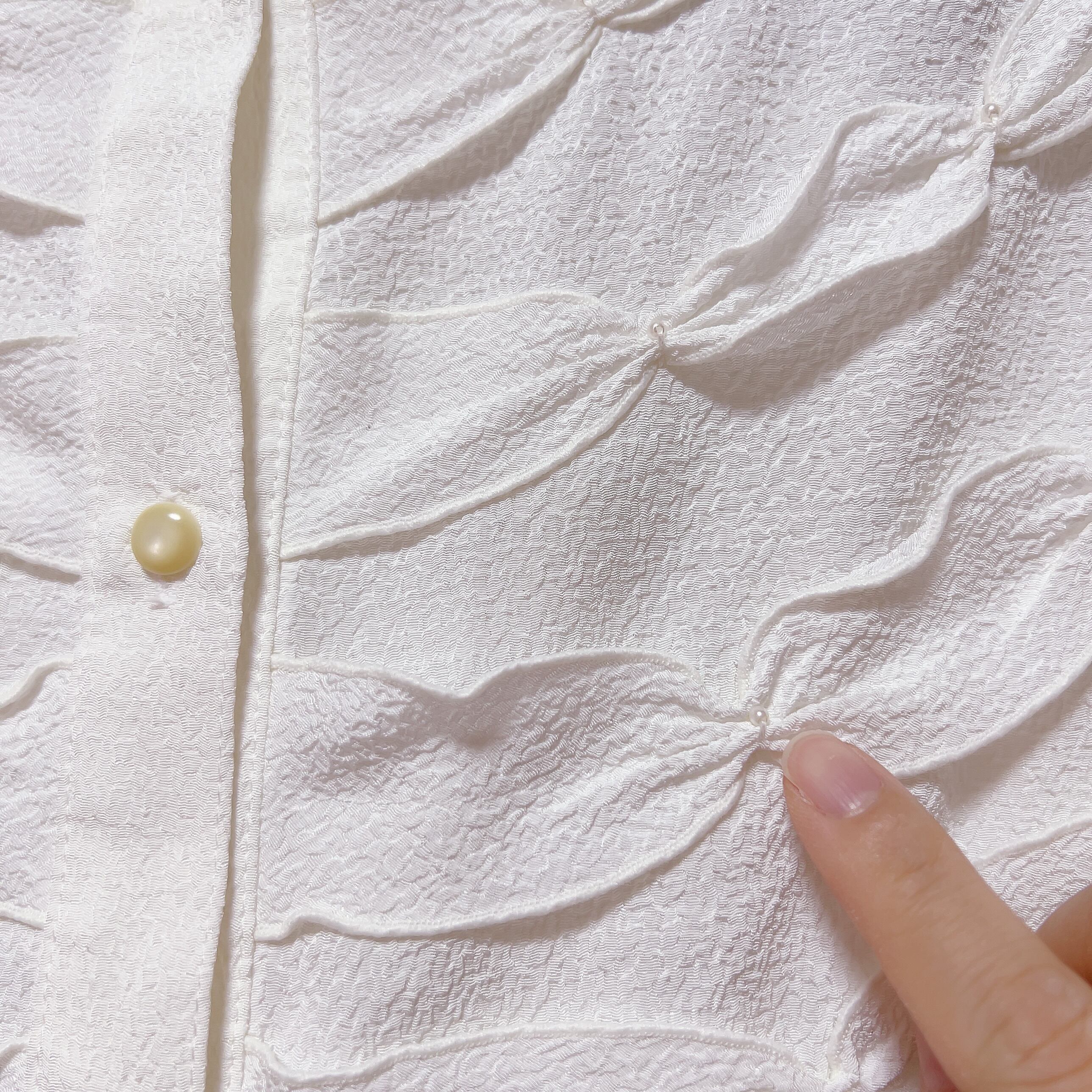 生クリームを何度も重ねたようなデザインのブラウス。クリームには小さなビーズがきらり。