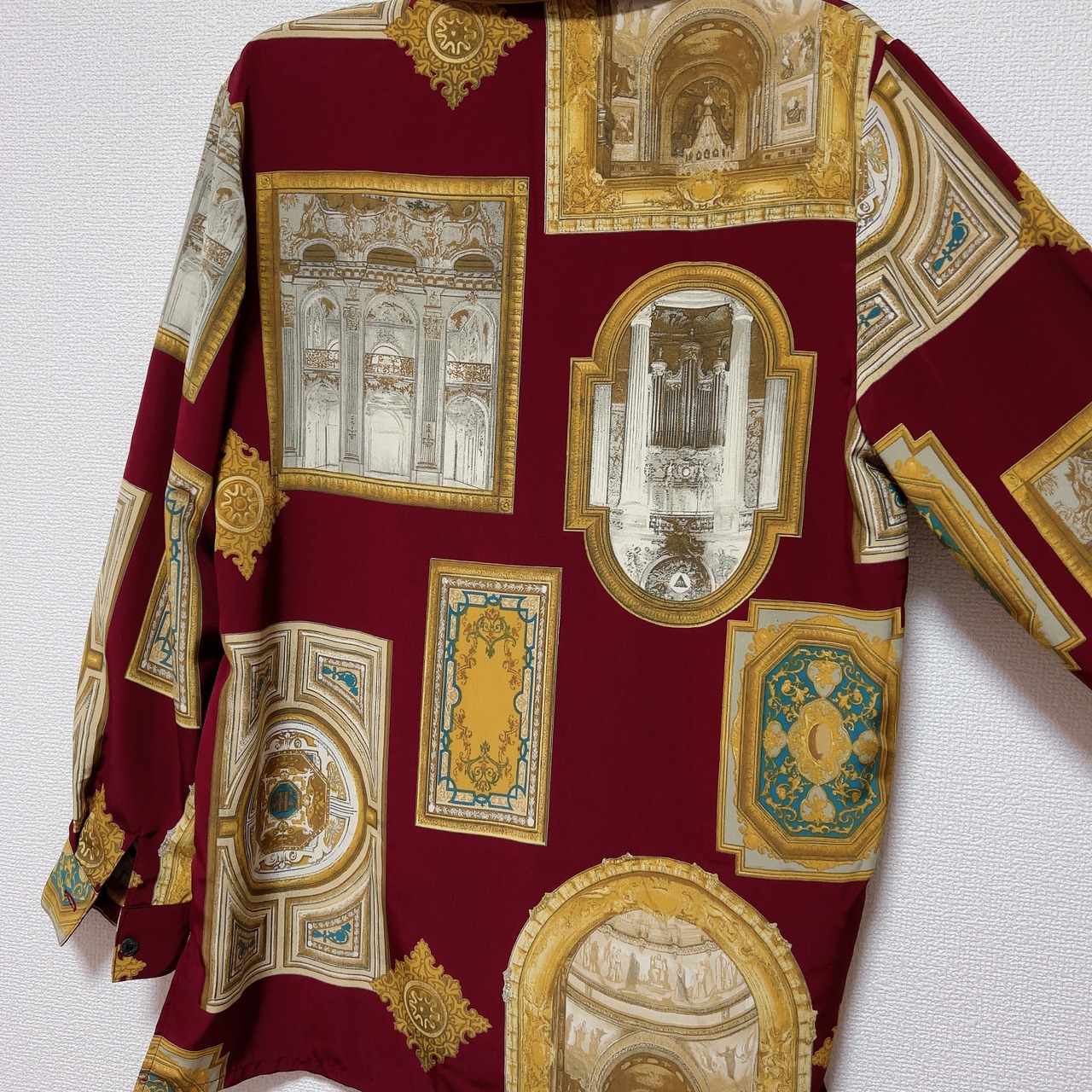 深紅にゴールドの額と大理石の柄。博物館の展示室のようです。