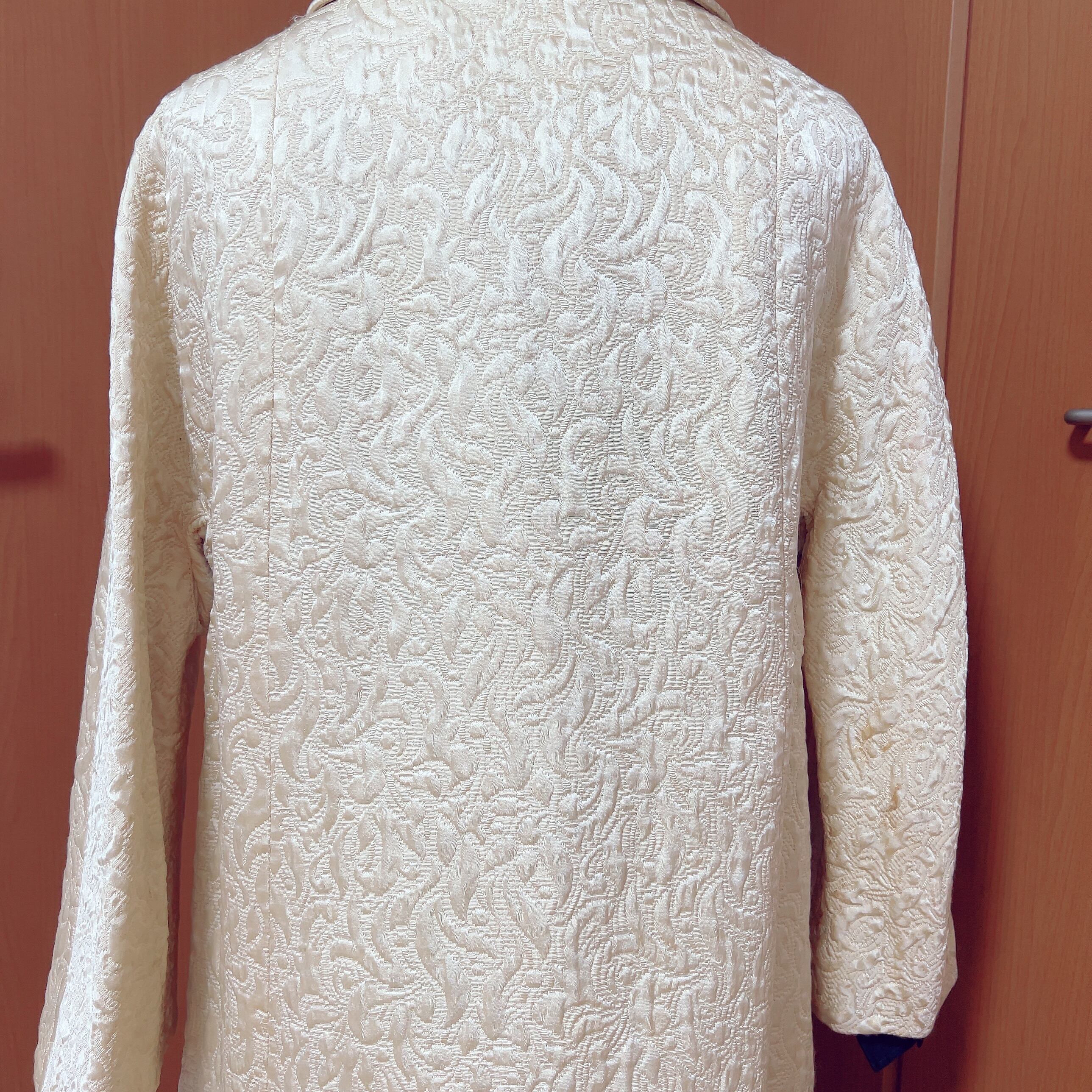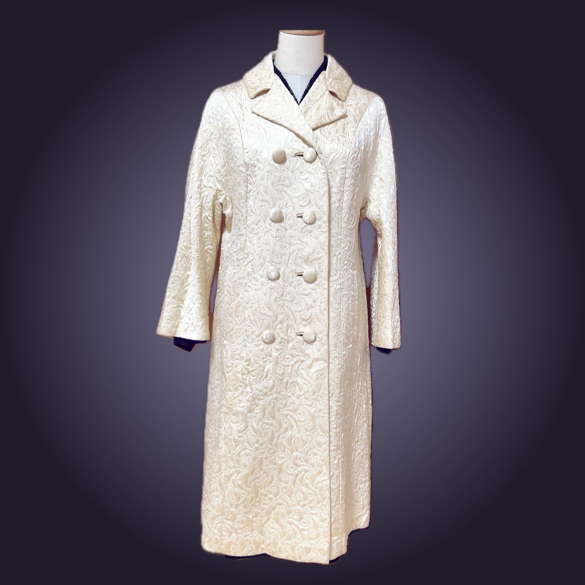 60~70年代の非常に貴重なコート。光沢のある黄みのアイボリーでふっくらとしたジャガード生地。少し重みがあり、ワンピースやスラックスなどクラシカルなコーディネートをさらにハイグレードに仕上げてくれる逸品。