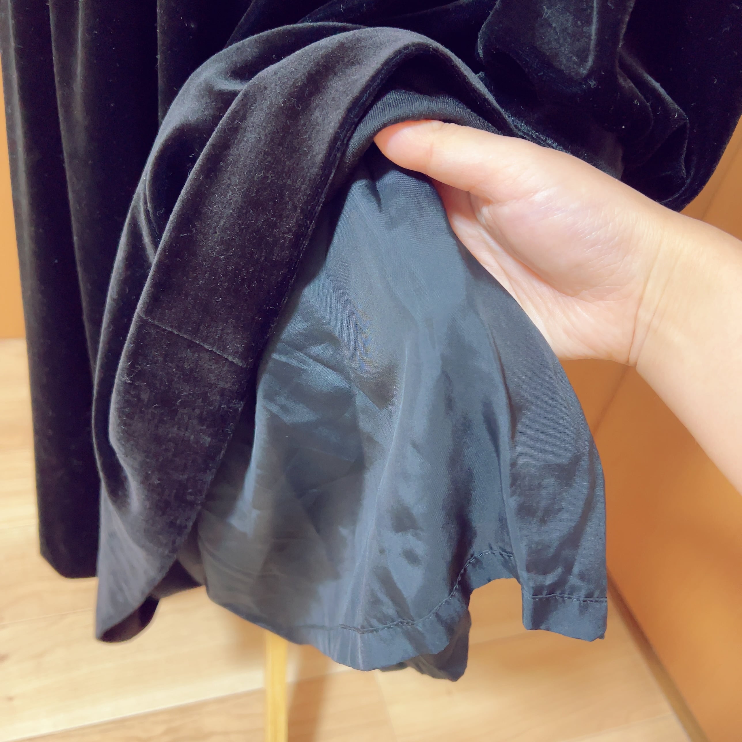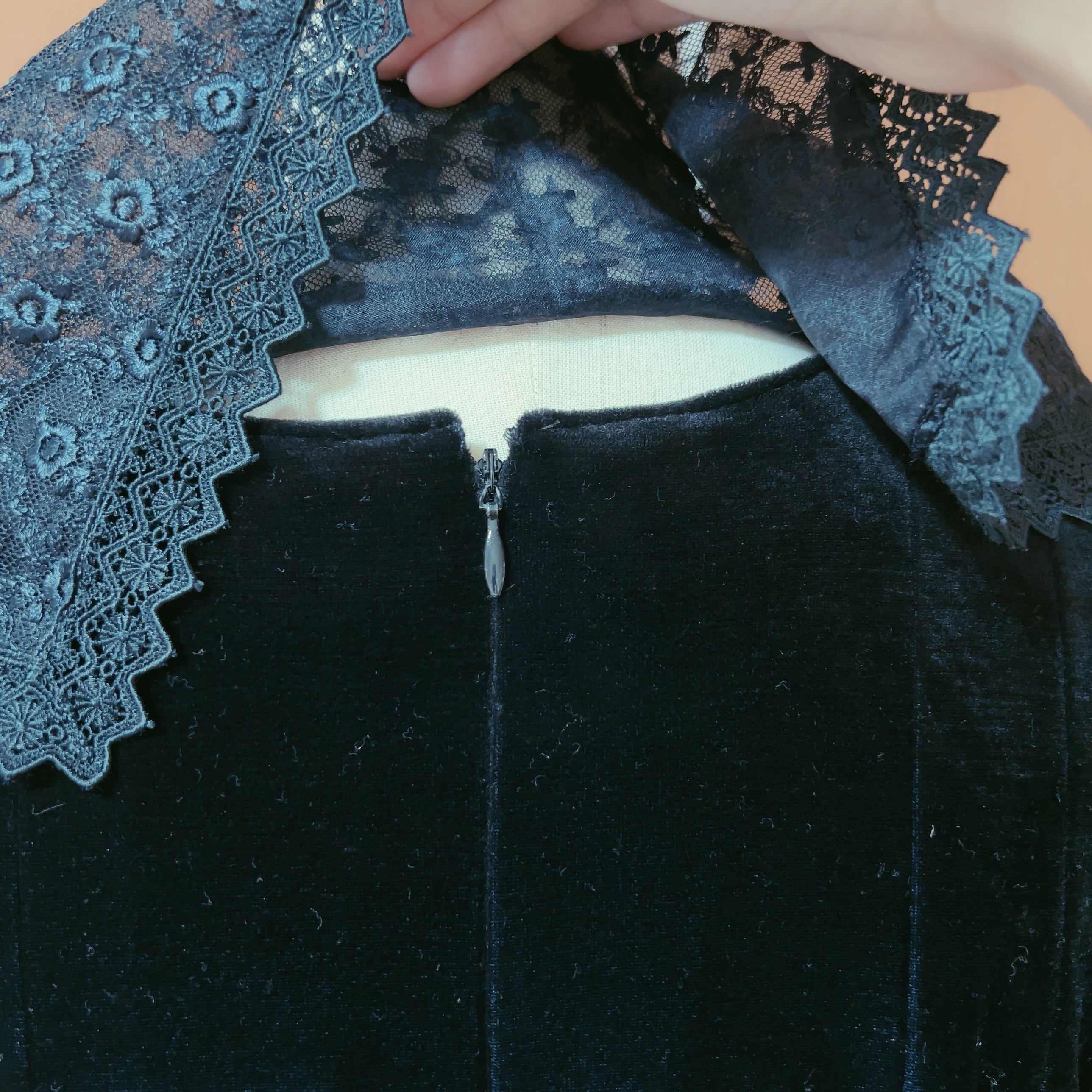 ふかふかのベロアに、レースのつけ襟とブローチが付属するクラシカルなワンピース。