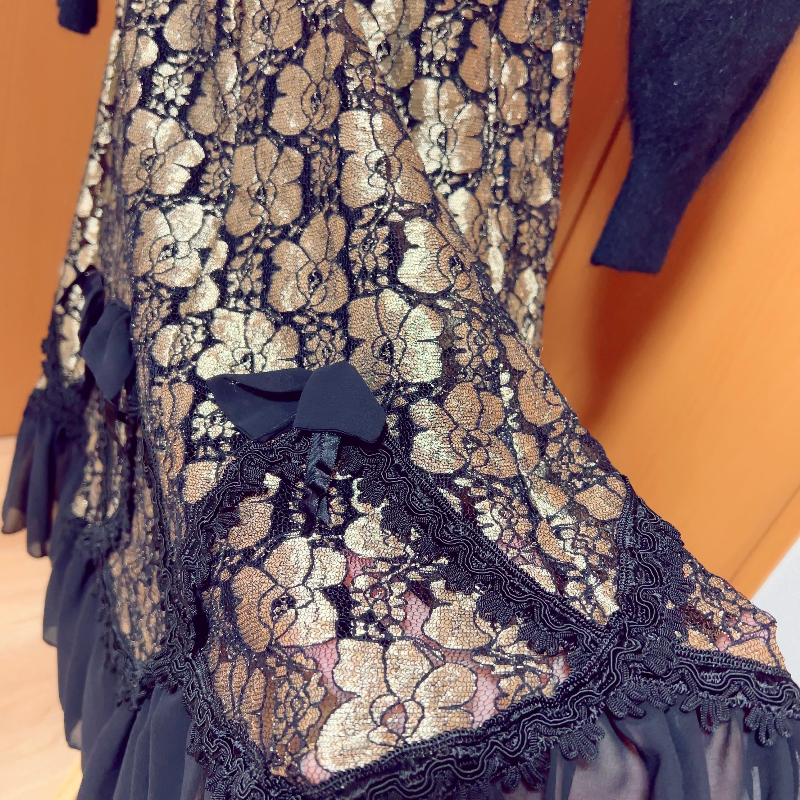 贅沢な黄金色の刺繍レースに、黒のリボンとオーガンジーのフリルがついた、レトロクラシカル全開のスカートです。