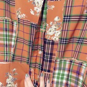 黄みのあるオレンジブラウンにチェックや花柄を織り交ぜたシャツ。