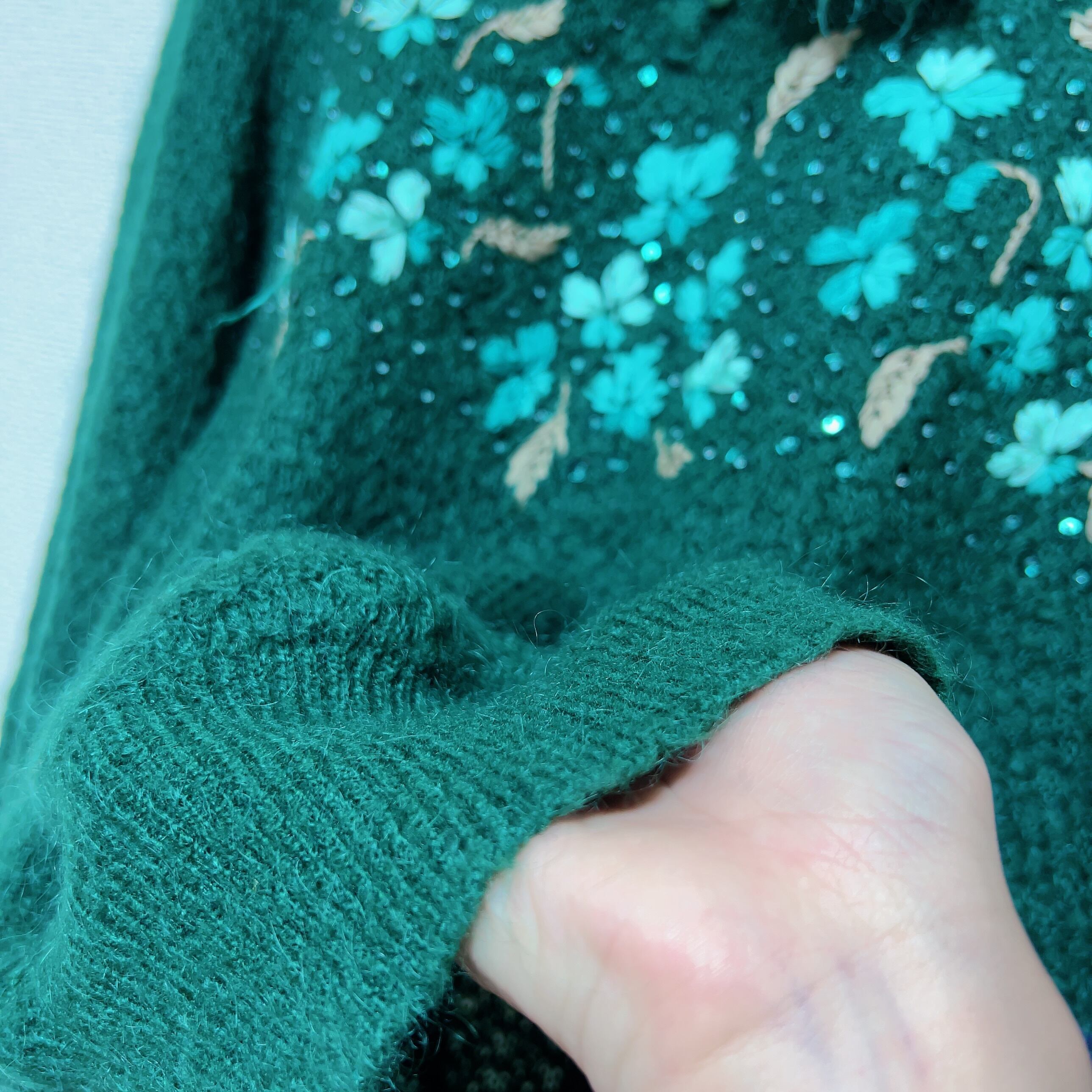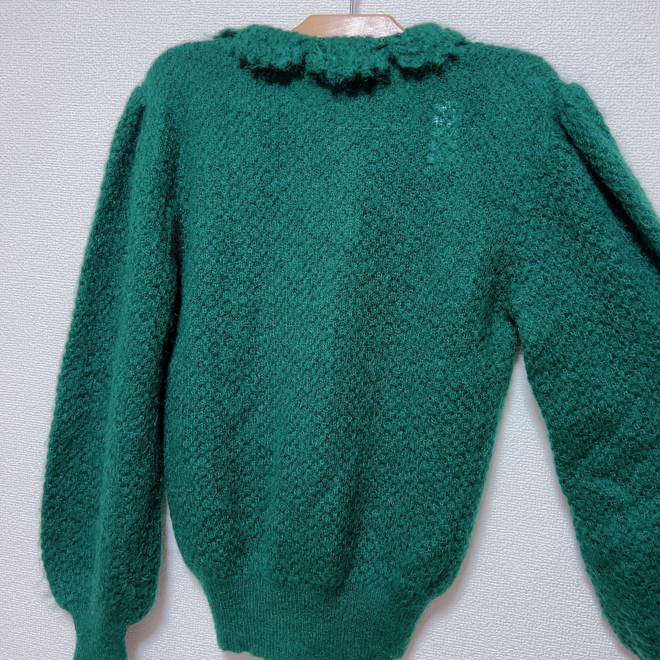 伸縮性たっぷりのふわふわニット。襟がはっぱのようなデザインでキュート。