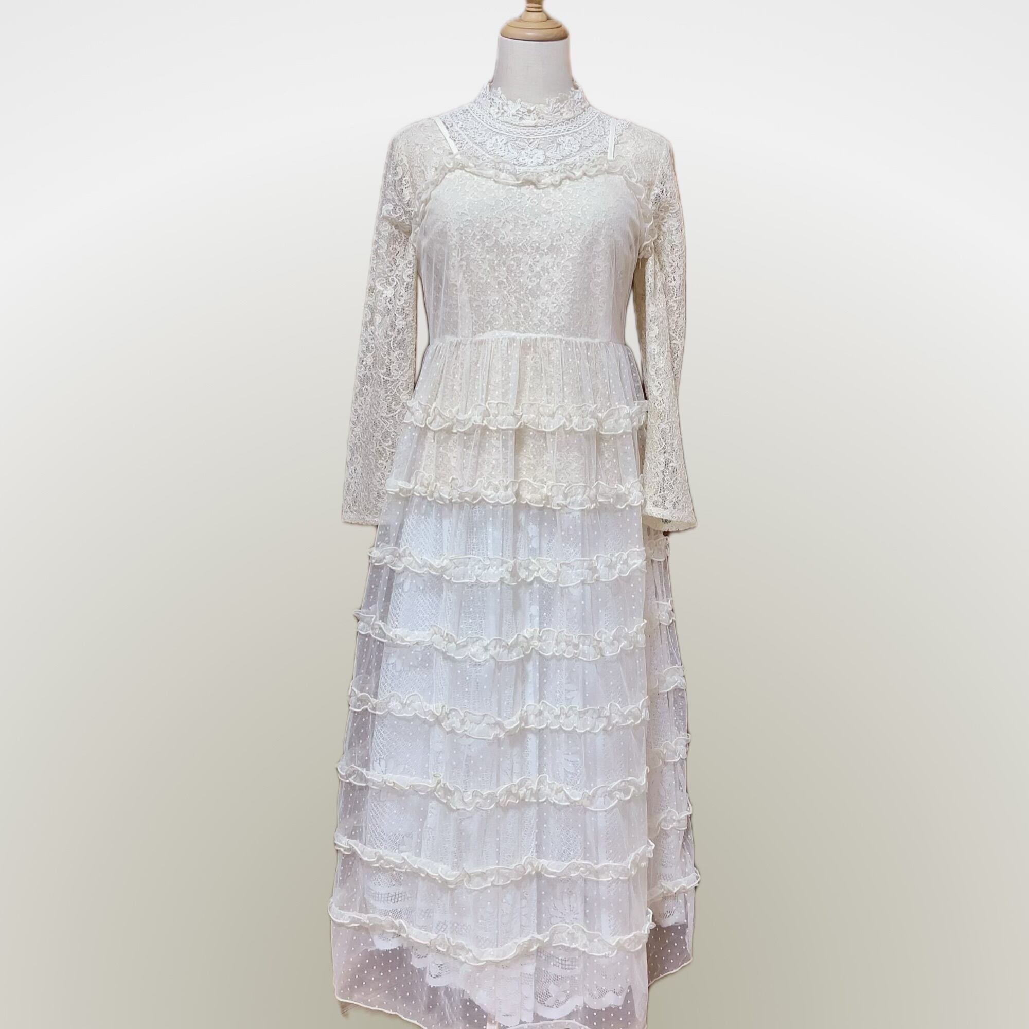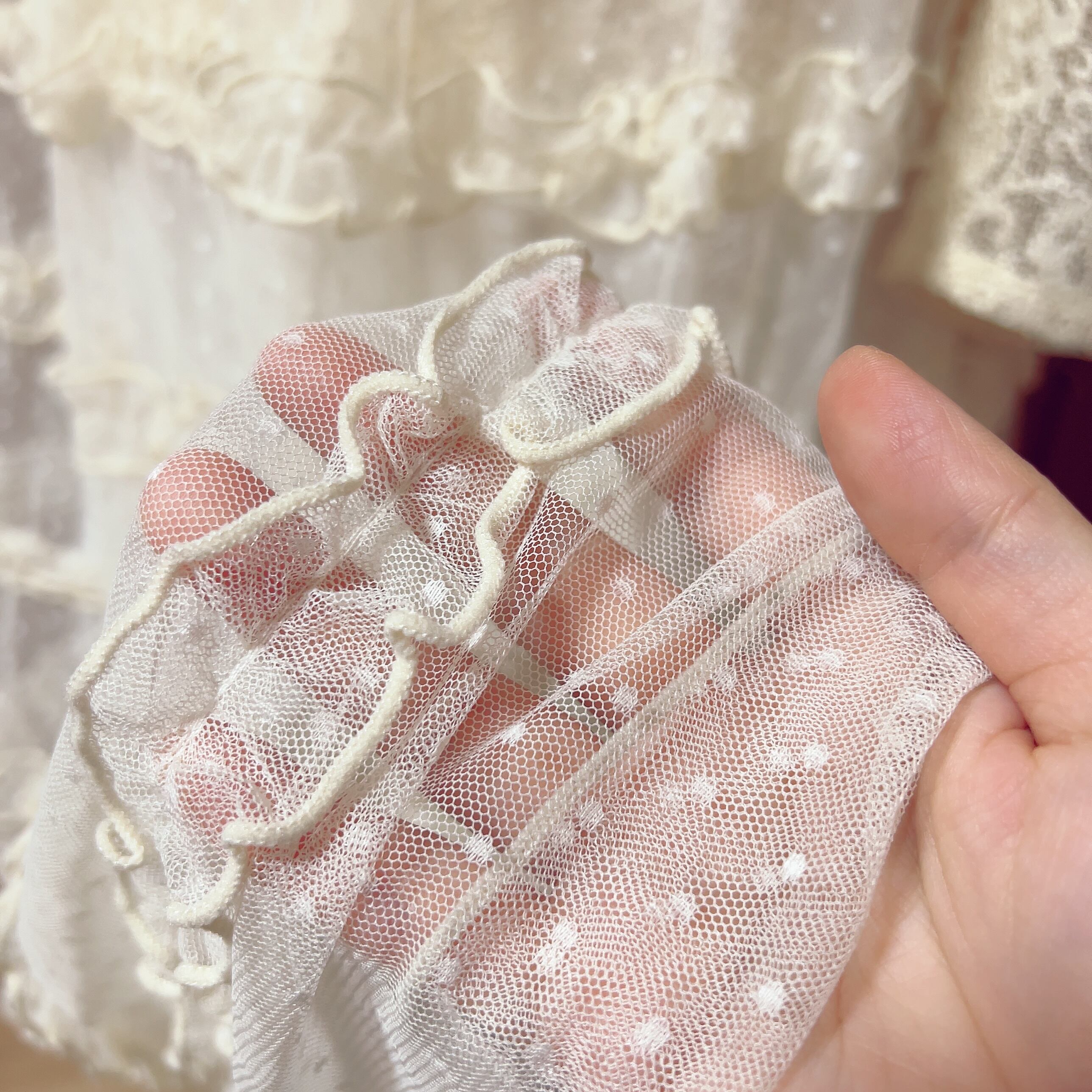 クリーム色の水玉レースをふんだんなフリルとたっぷりボリュームで仕上げた、シアーオーバーワンピース。