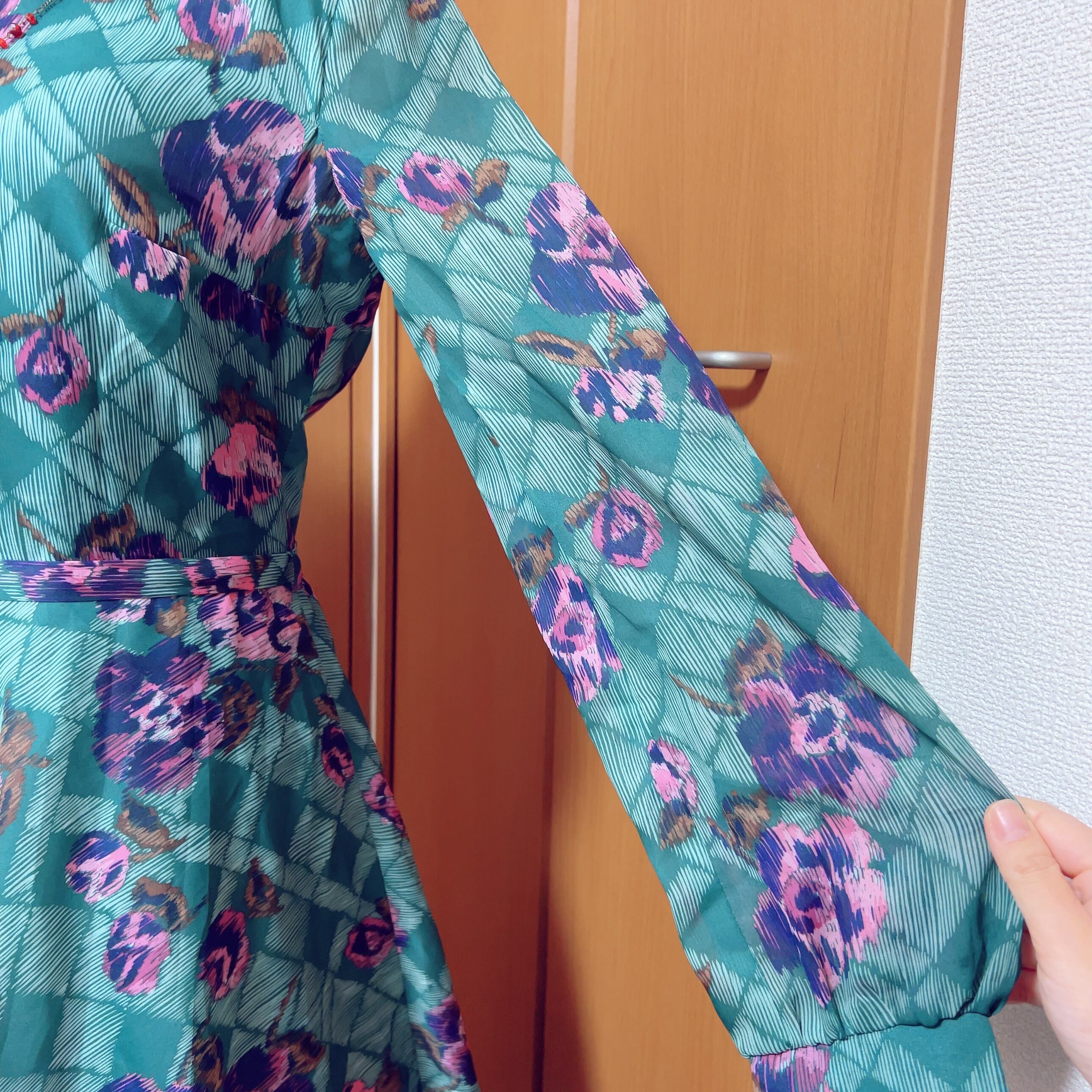海外製の軽い素材のワンピース。袖はシアーになっています。スキッパー襟はロングネックレスを合わせると上品かつレトロに。