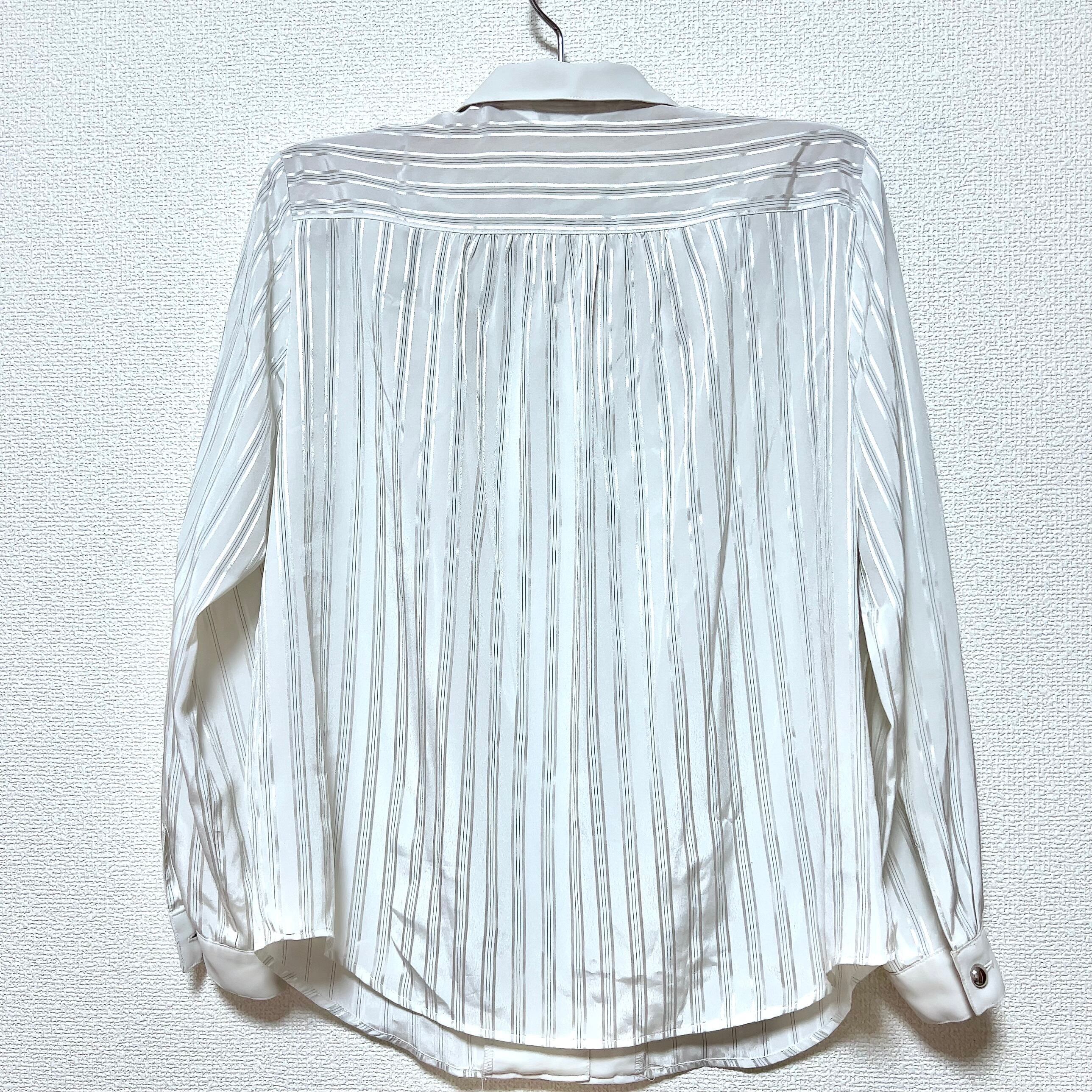 比翼仕立てになった隠しボタン部分にはかわいい三つの刺繍。全体はシルバーグレーで、きらきらと輝くストライプが清楚な印象に。
