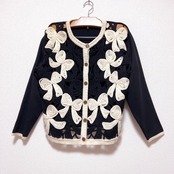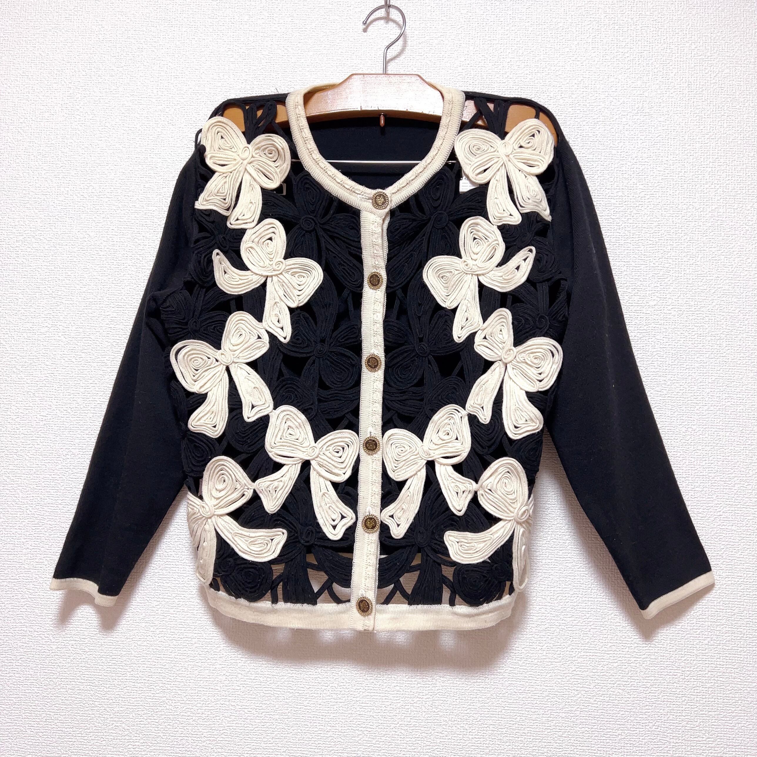 ウール製で、黒白のリボンを重ねたデザインの透かしが独特。ボタンも金属製で重厚。