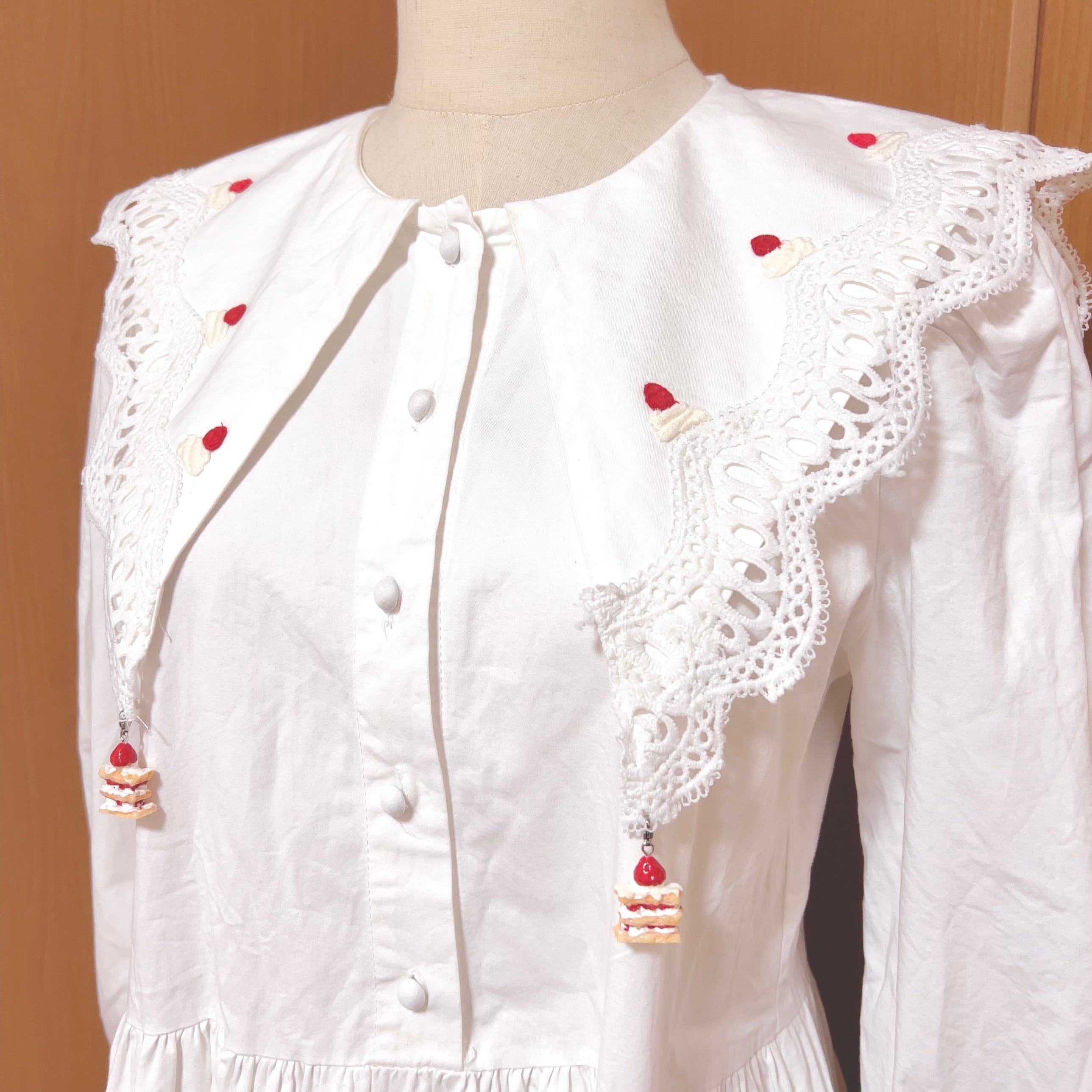 コットンの襟が大ぶりでかわいいワンピースにちょこんとのったホイップと苺。襟の先にはカニカンでつけられるミルフィーユのチャーム!